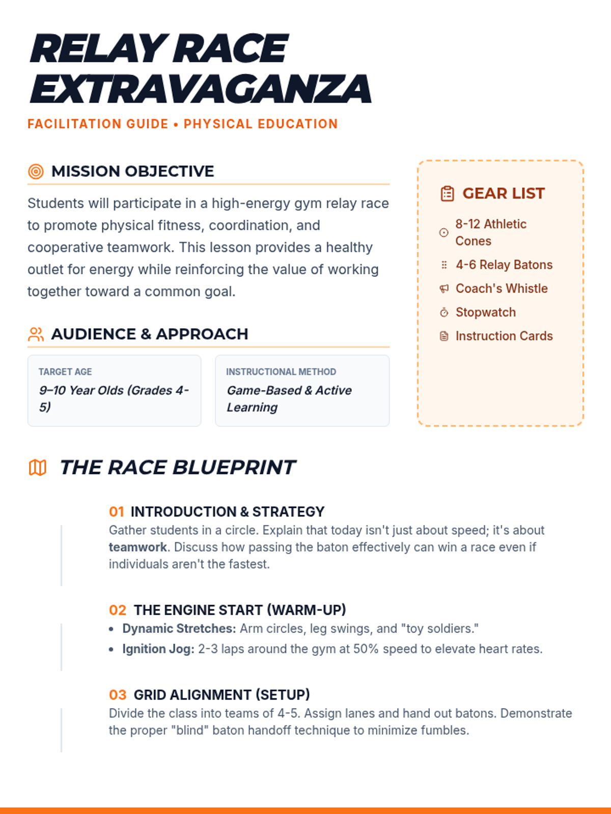 An energetic gym lesson focusing on teamwork and motor skills through a series of fun relay races for 9-10 year olds.