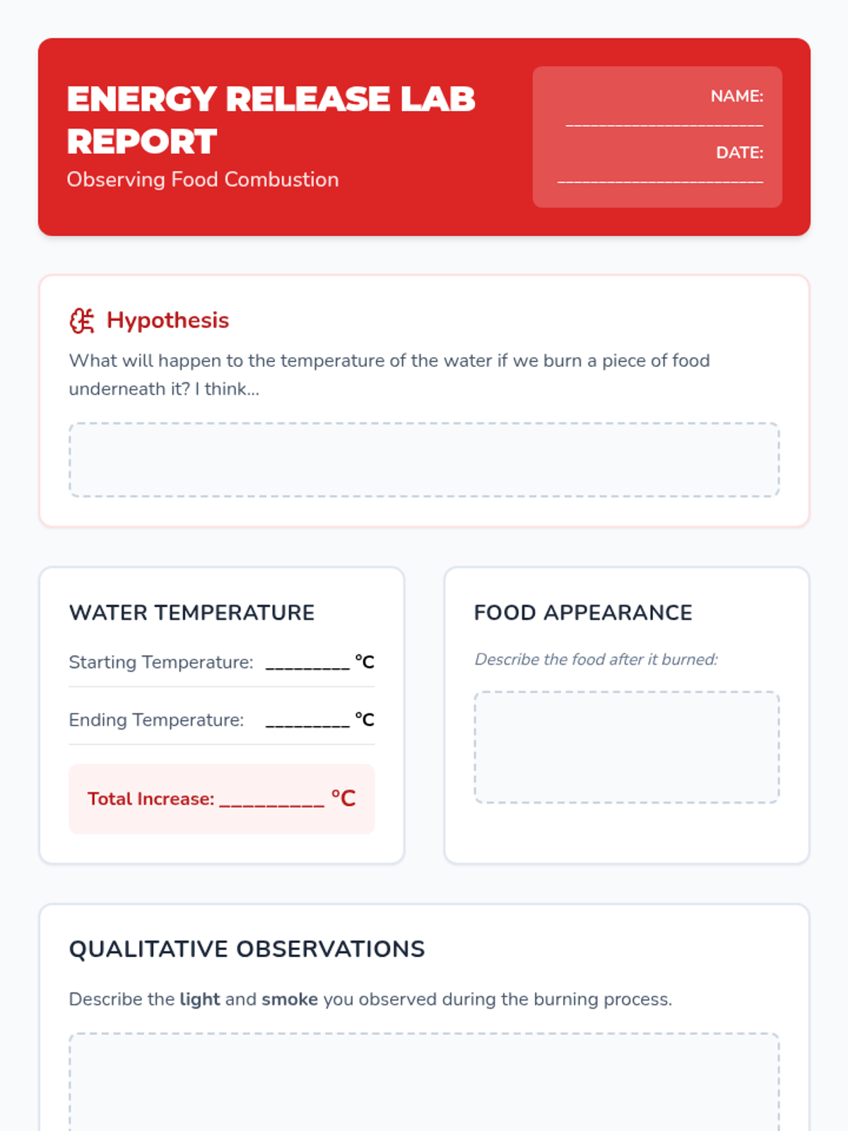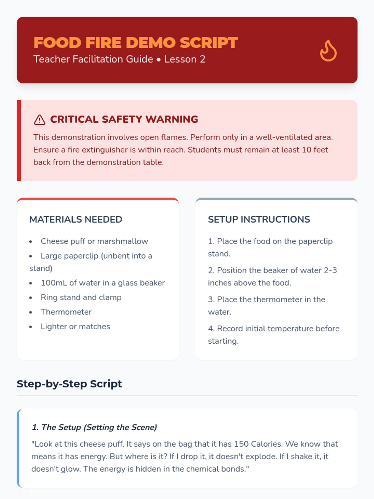 A teacher-led demonstration of burning food items to observe the conversion of stored chemical energy into thermal and light energy. Students relate this process to how their bodies 'burn' food for heat and movement.