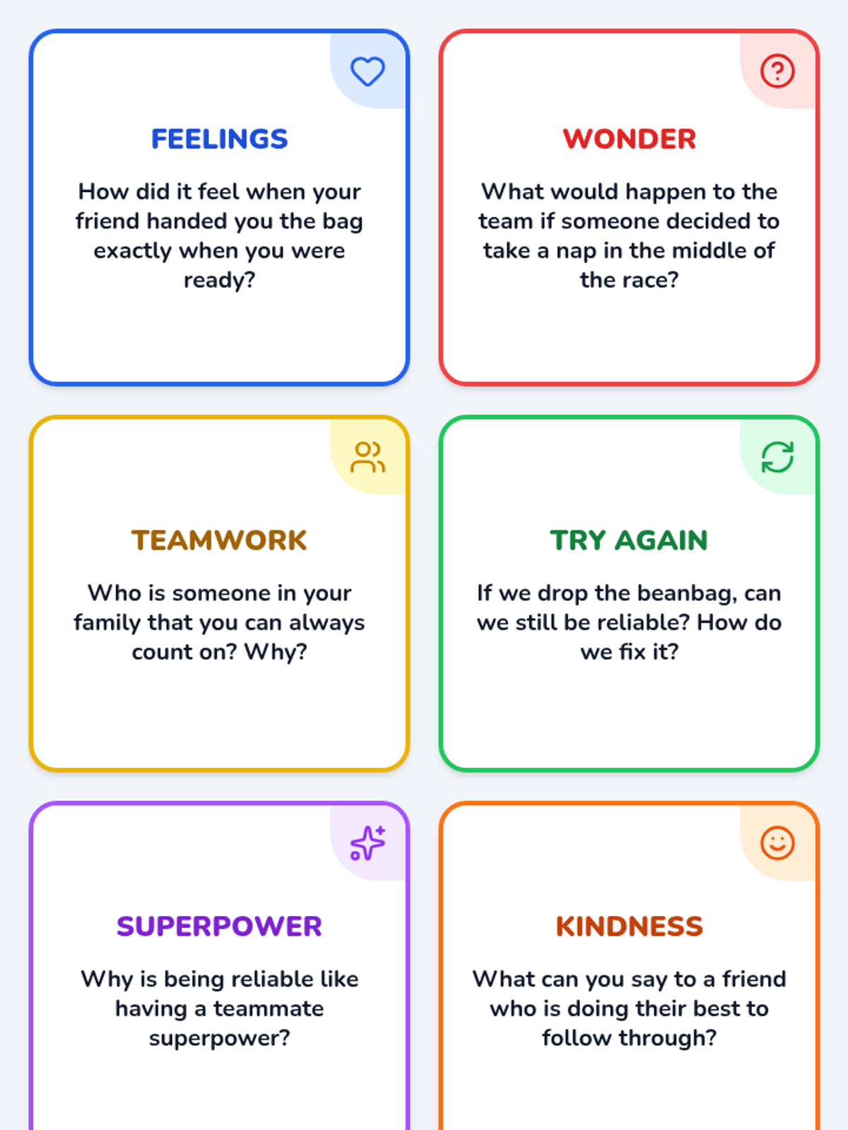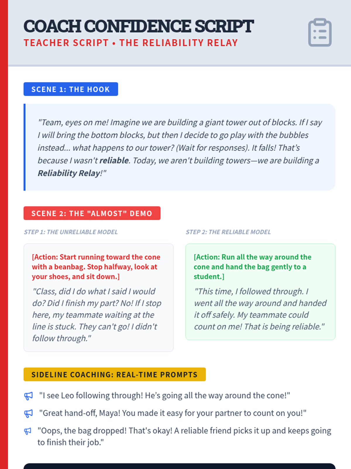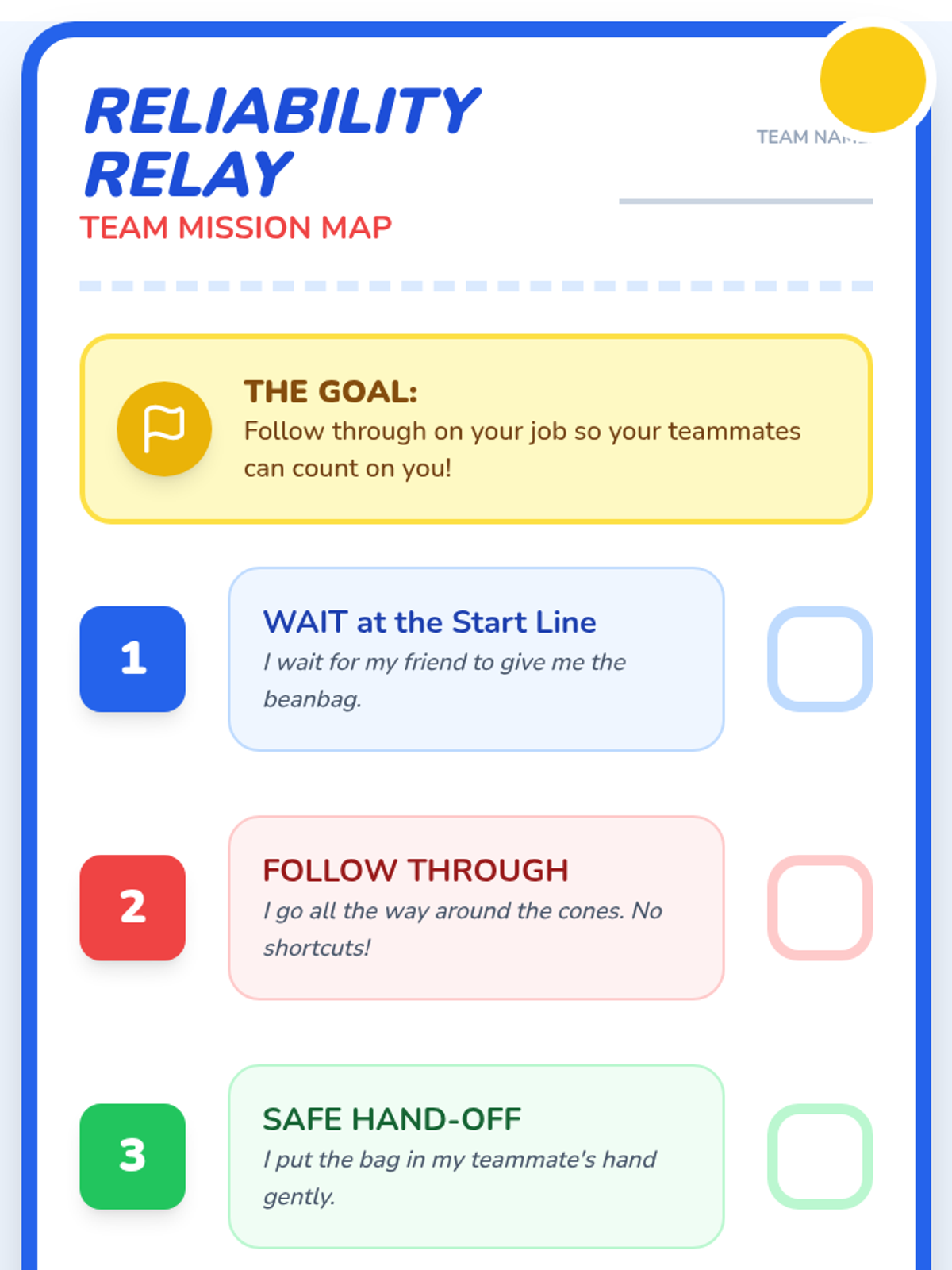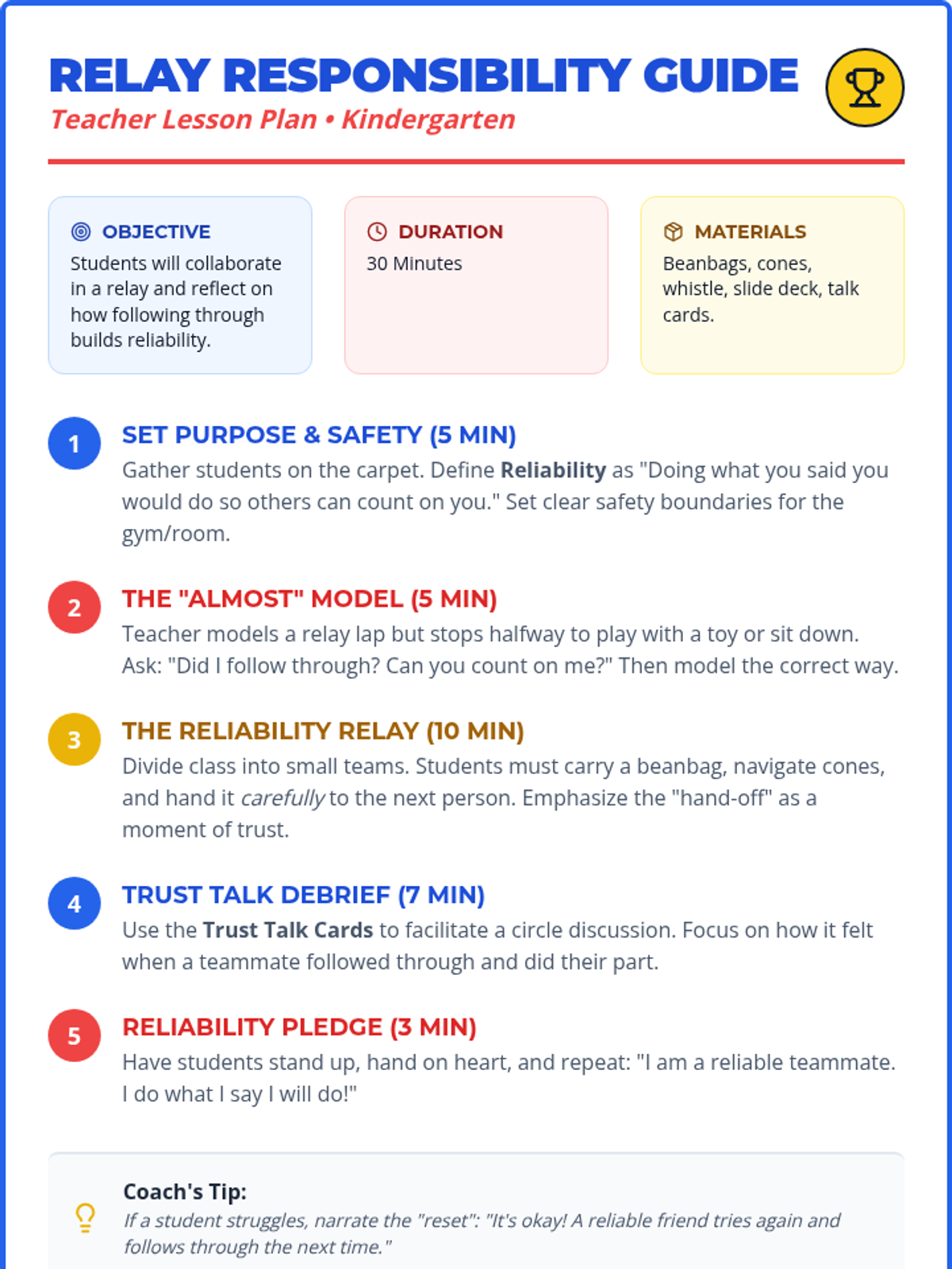 A high-energy Kindergarten lesson using a beanbag relay race to teach the importance of reliability, follow-through, and building trust with teammates.