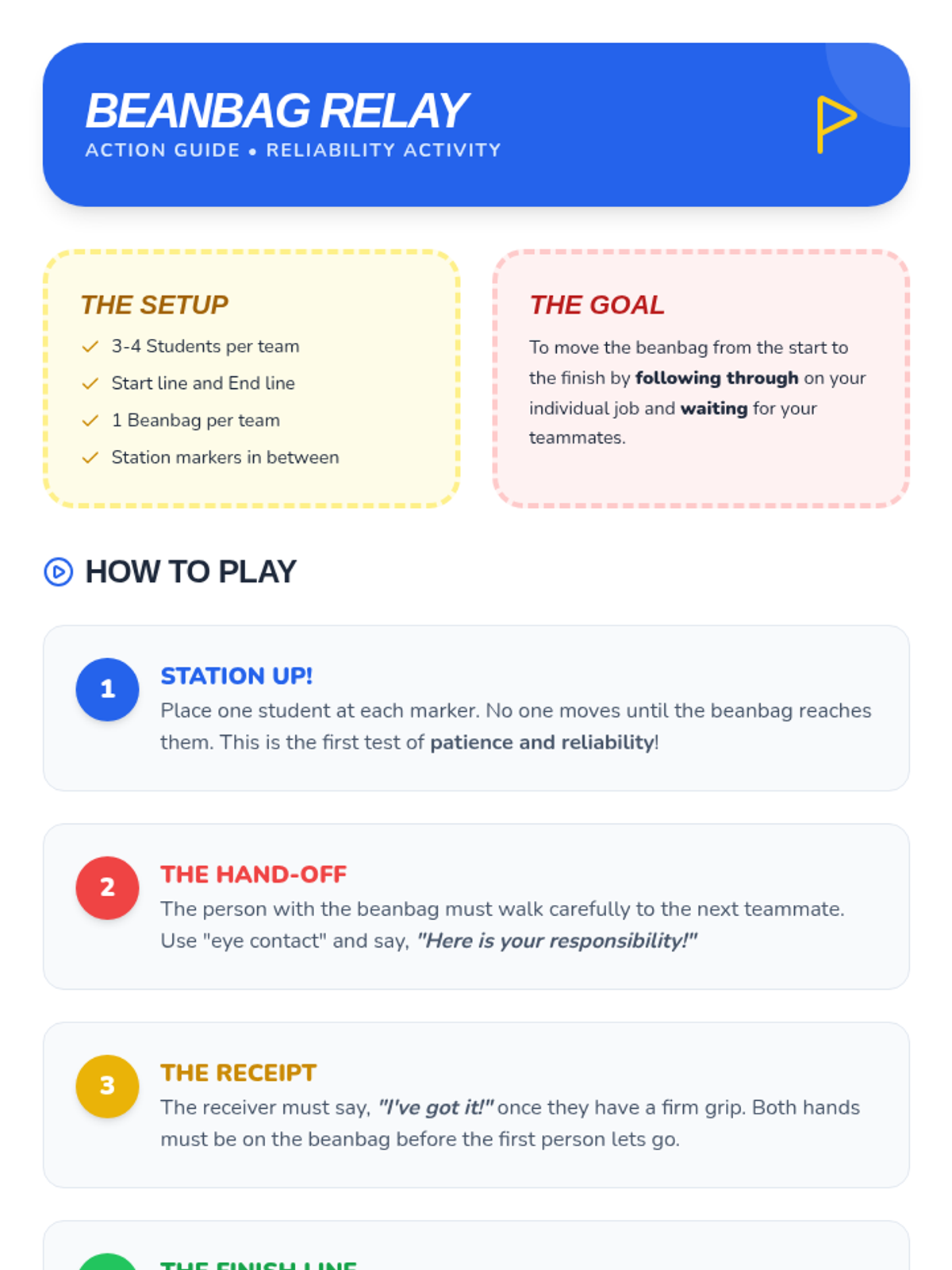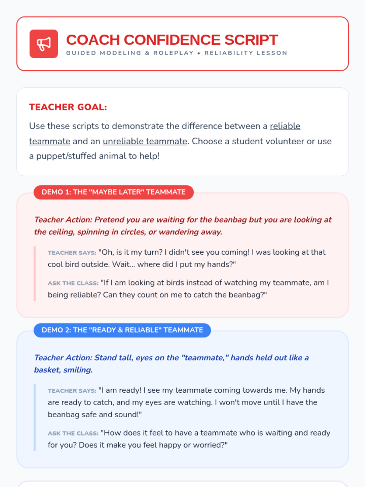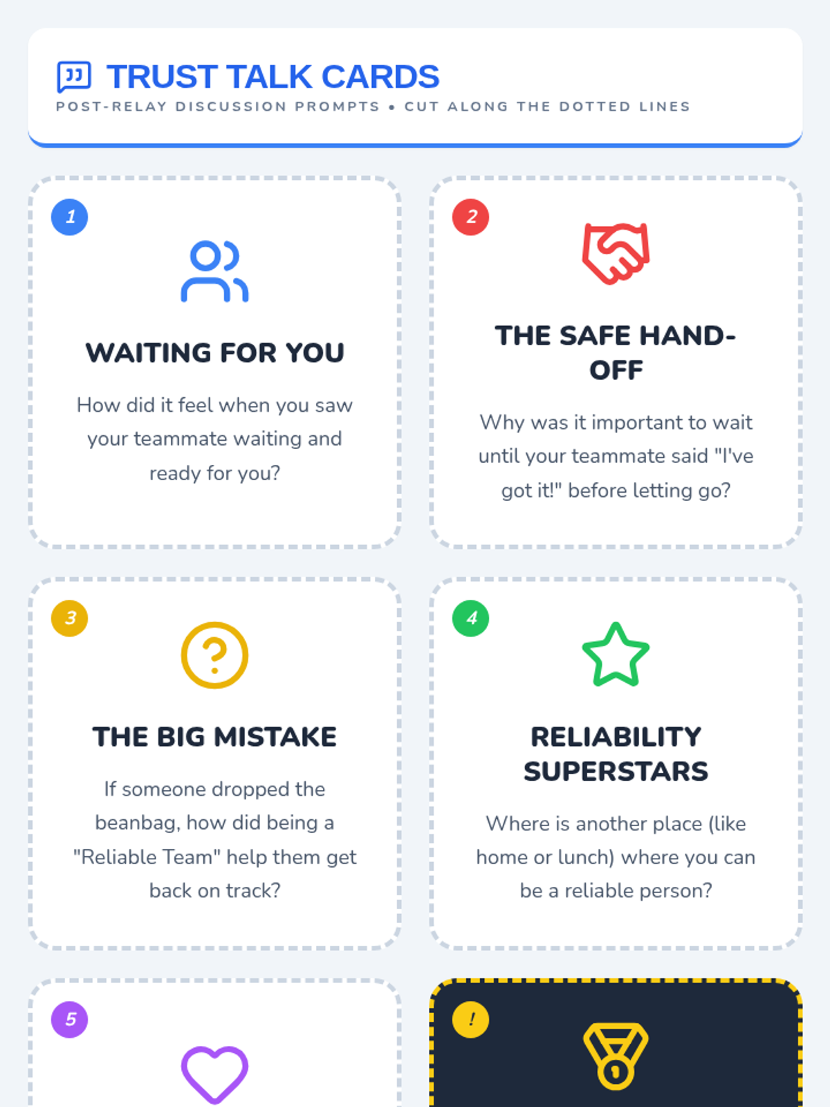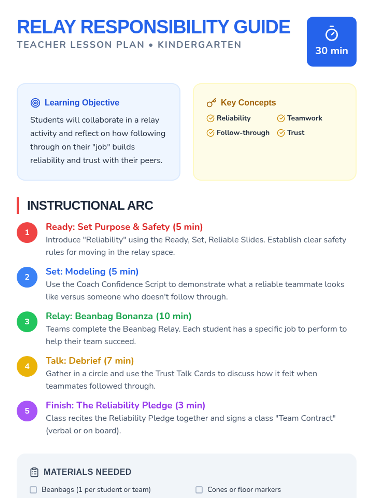 A Kindergarten lesson focused on building reliability and trust through a collaborative relay activity and reflective discussion.