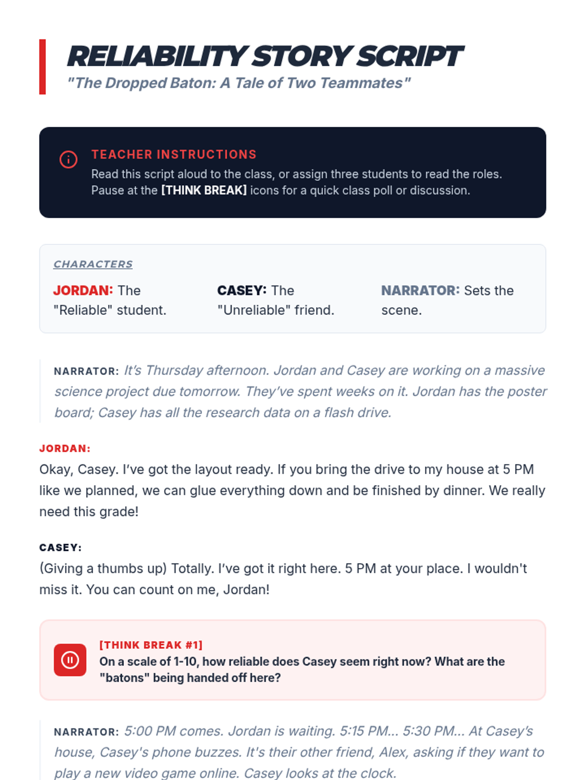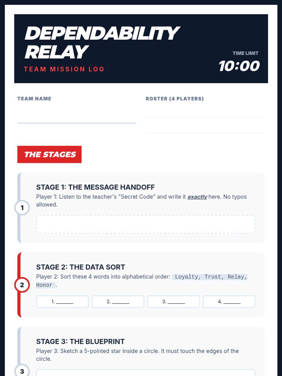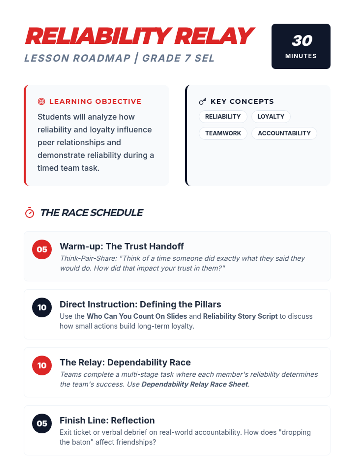 A fast-paced 30-minute lesson where 7th graders explore the pillars of reliability and loyalty through a high-energy relay activity and real-world scenario analysis.