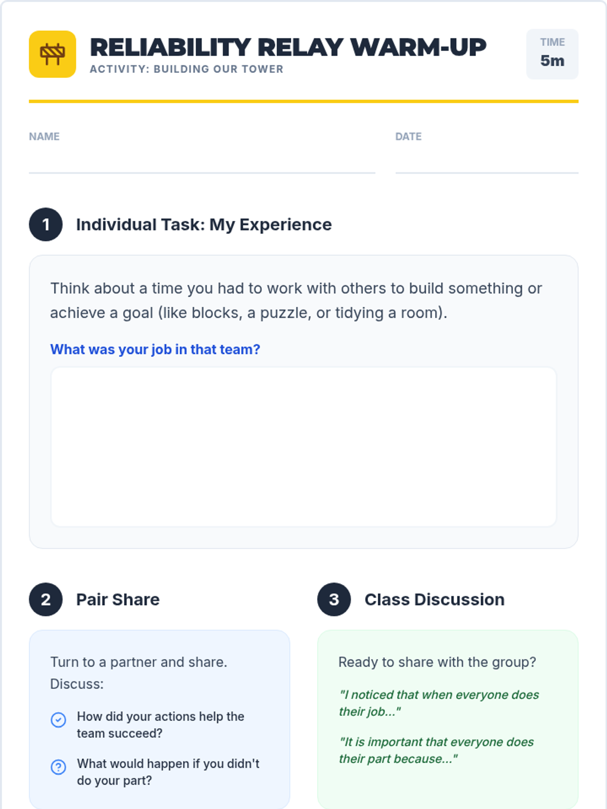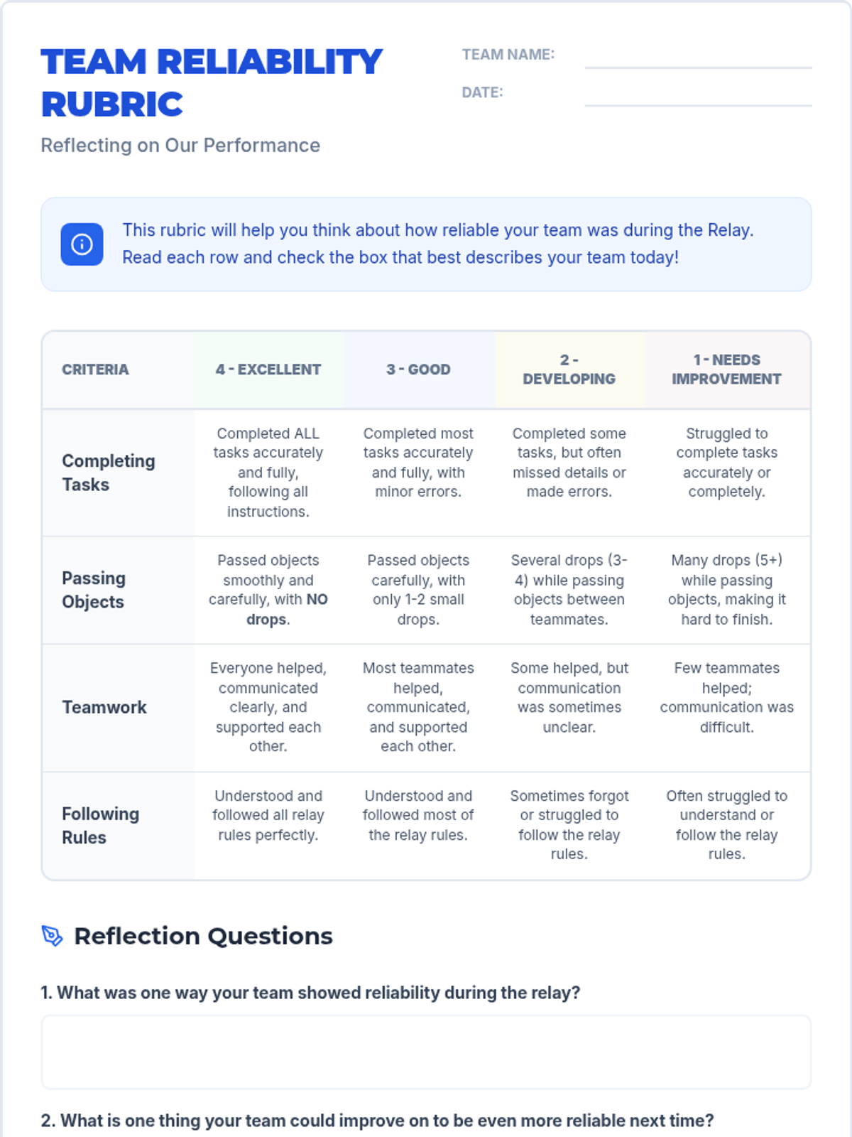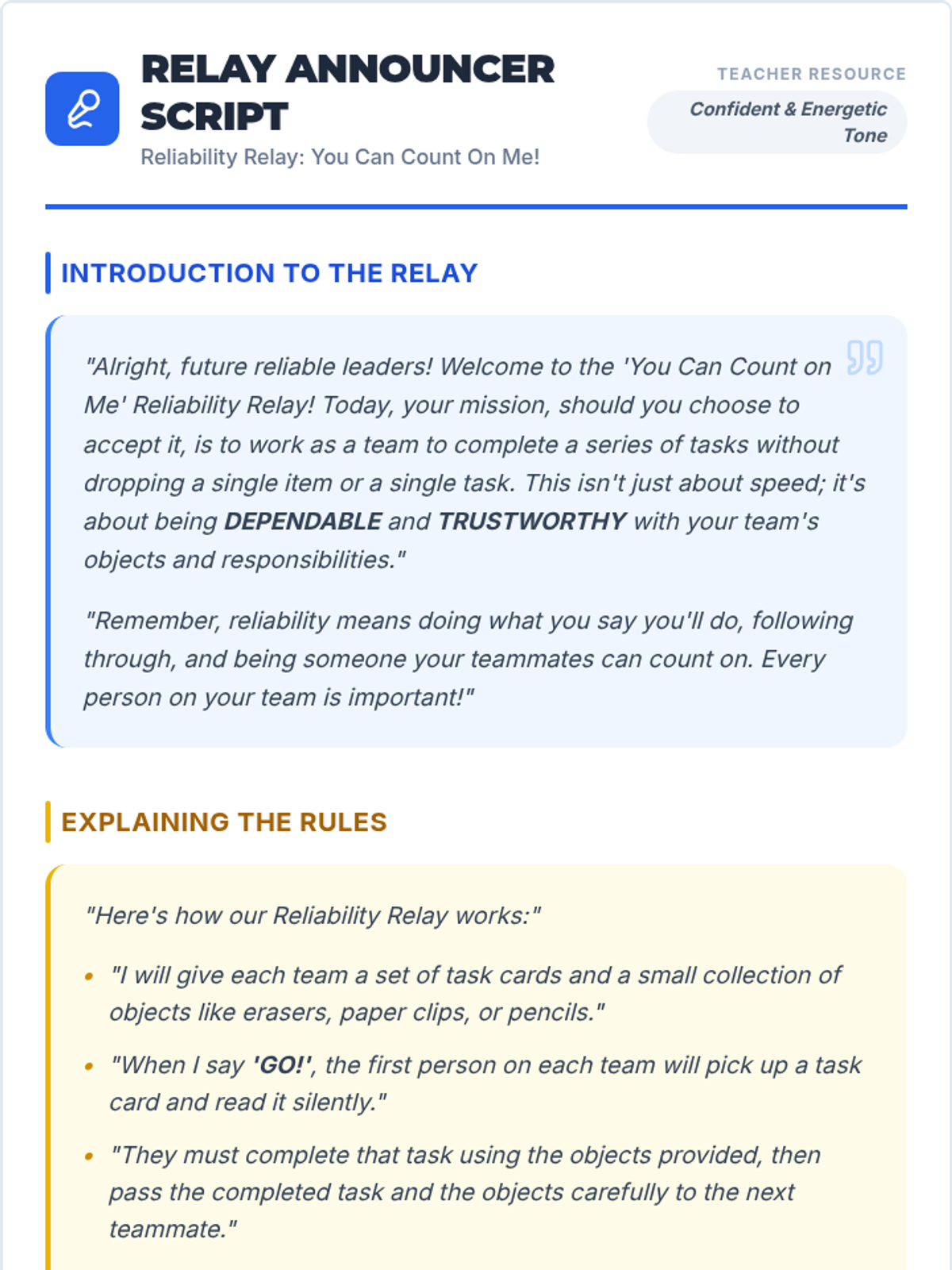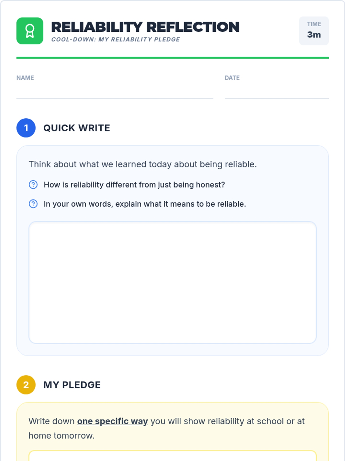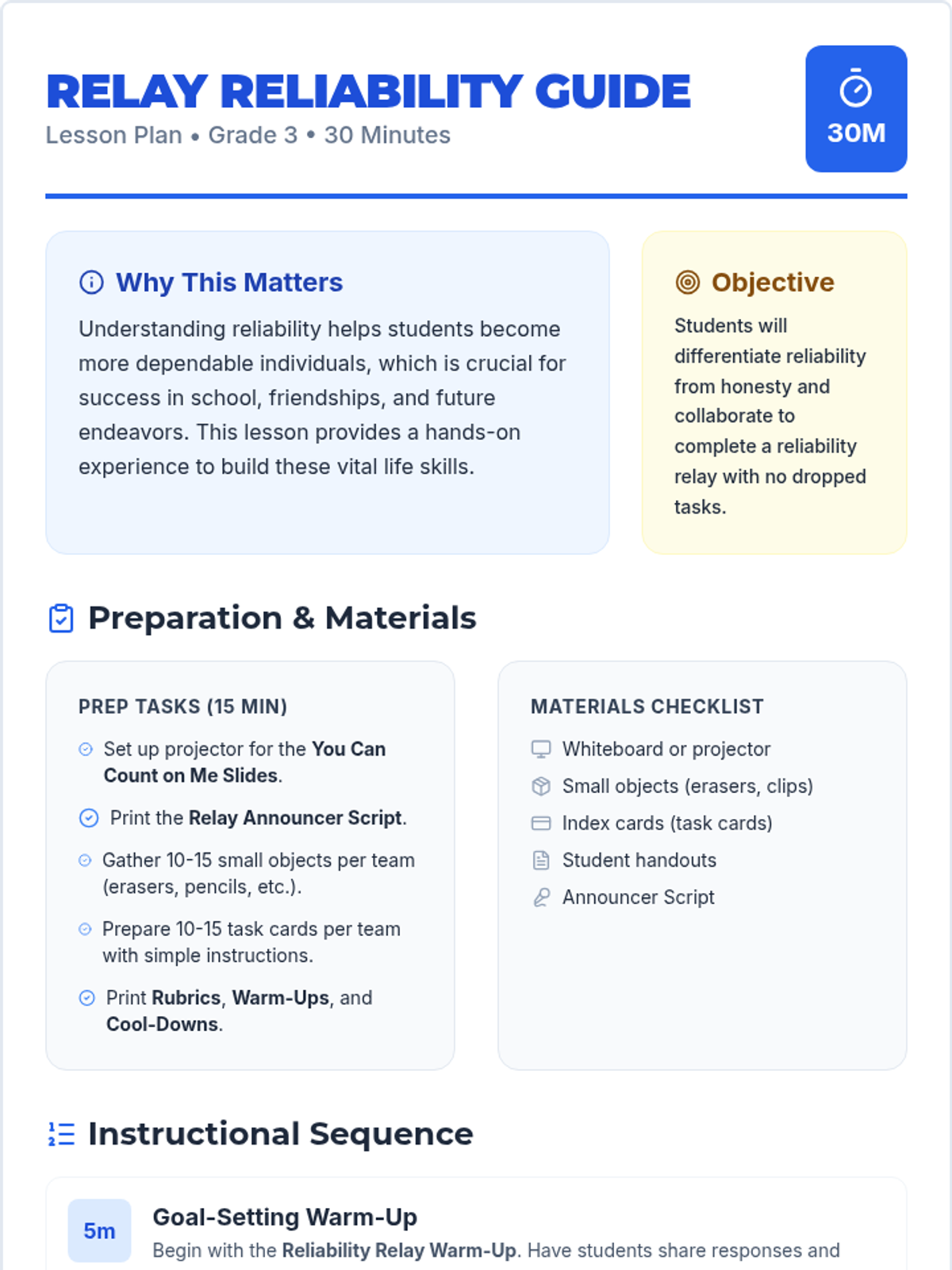 This 30-minute lesson for 3rd graders helps students understand the difference between reliability and honesty and practice being reliable through a fun team relay. It fosters teamwork and goal-setting skills.