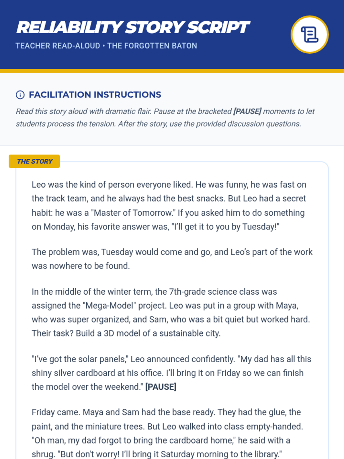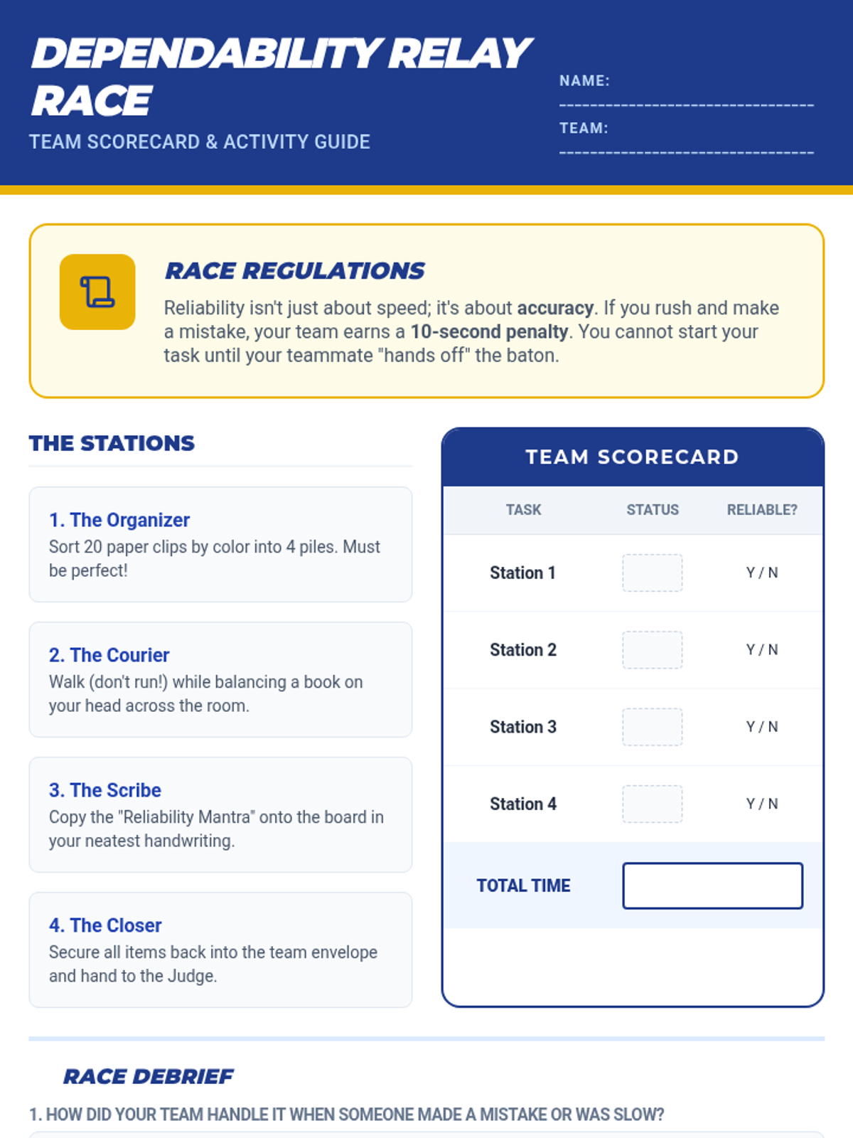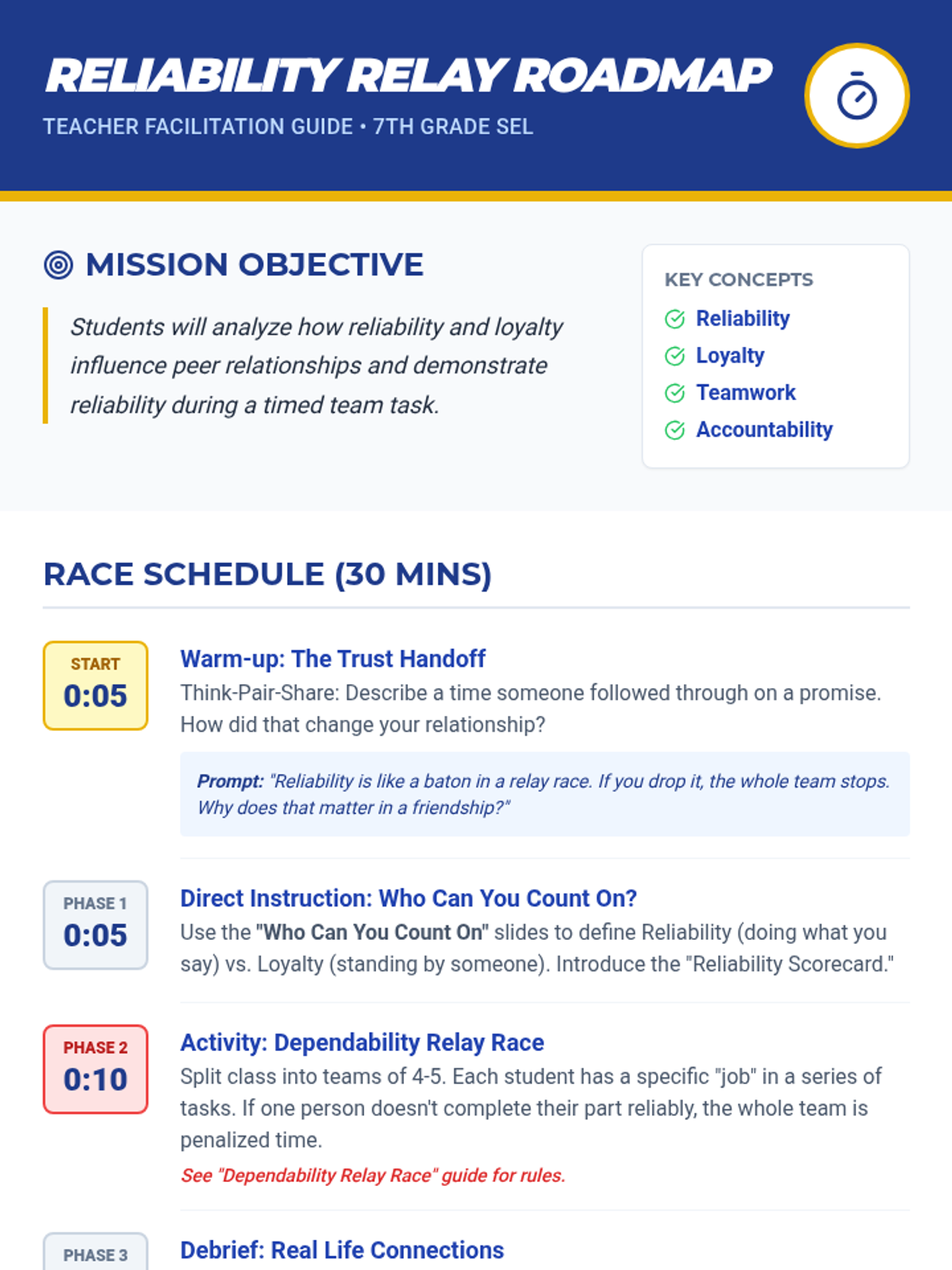 A high-energy social-emotional learning lesson where students explore the concepts of reliability and loyalty through discussion and a fast-paced team relay. Students will define what it means to be dependable and practice these skills in real-time.