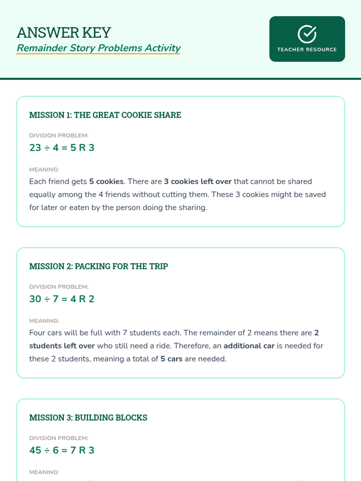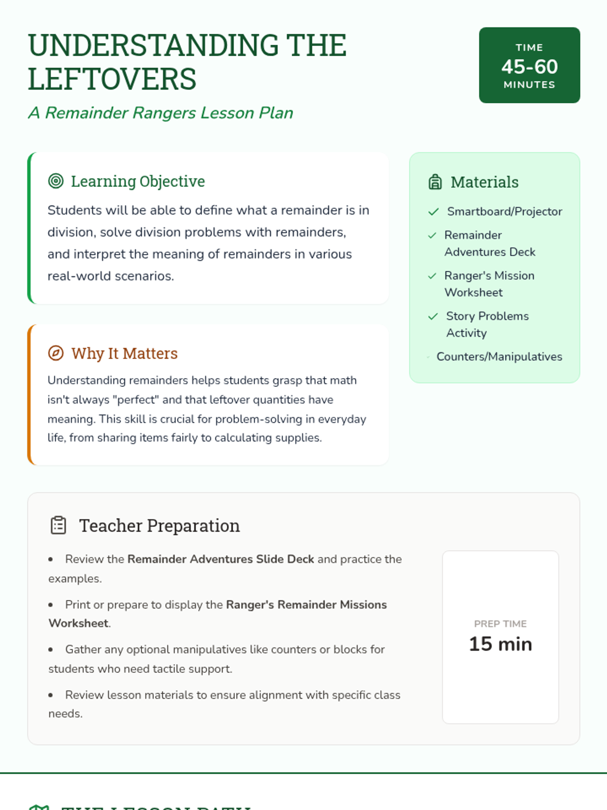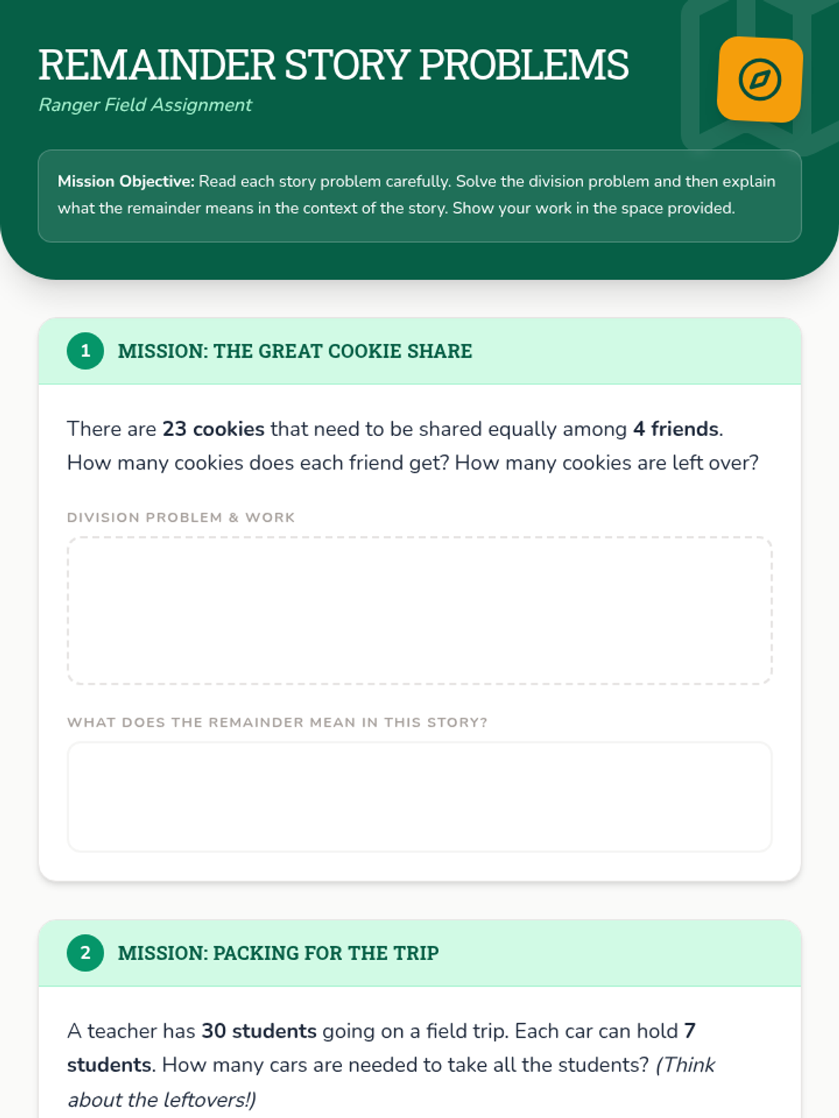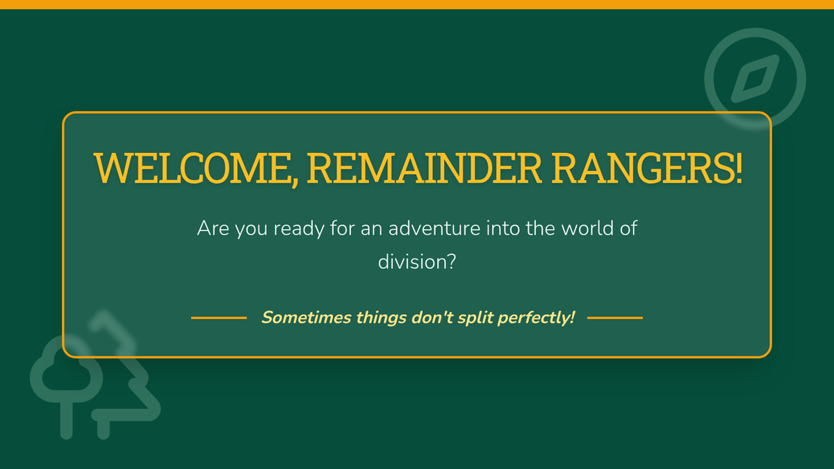This lesson introduces division with remainders through a 'Remainder Rangers' adventure theme. Students will explore what leftovers represent in real-world contexts, practice solving division problems, and learn to interpret remainders in various scenarios.