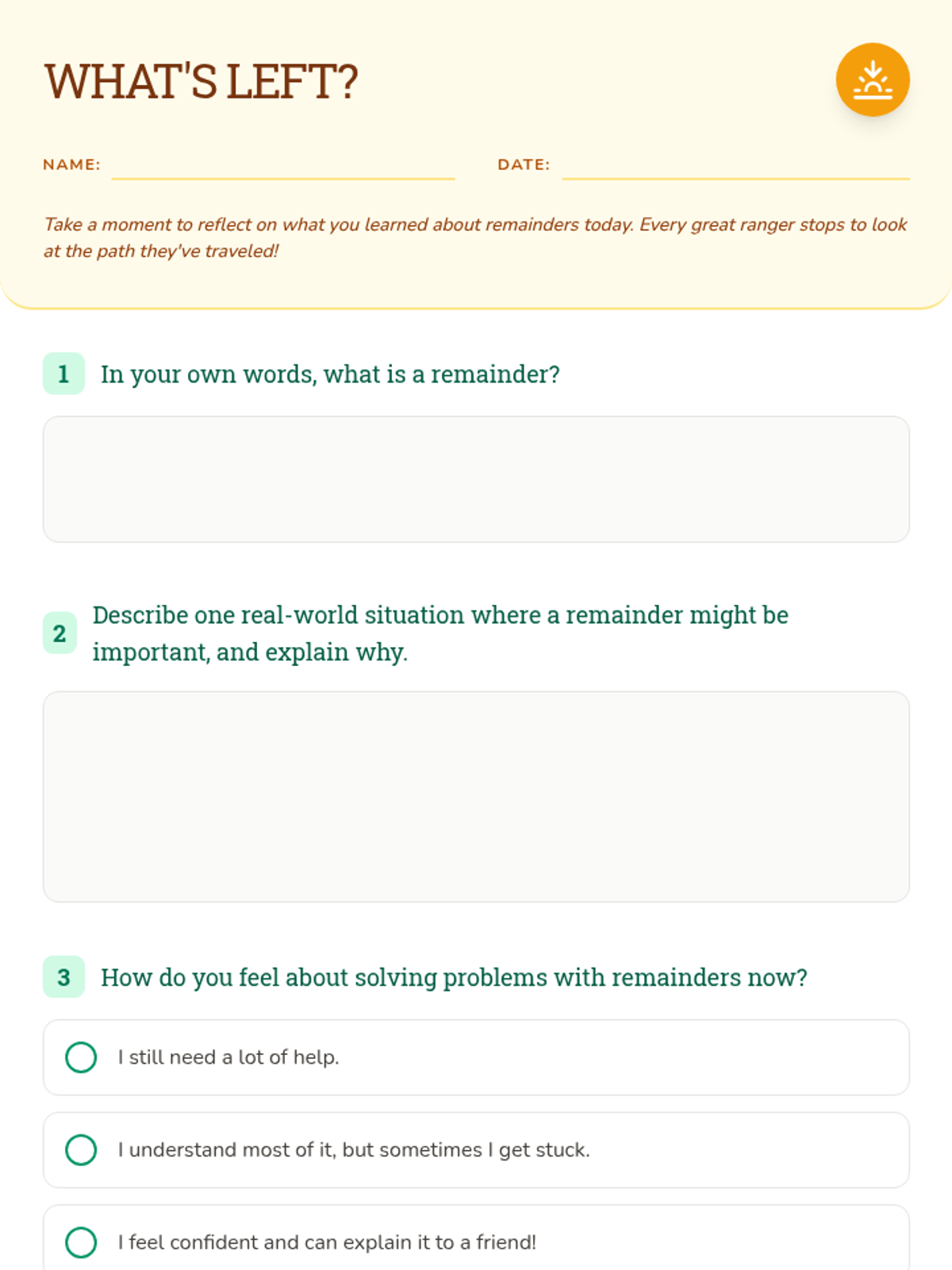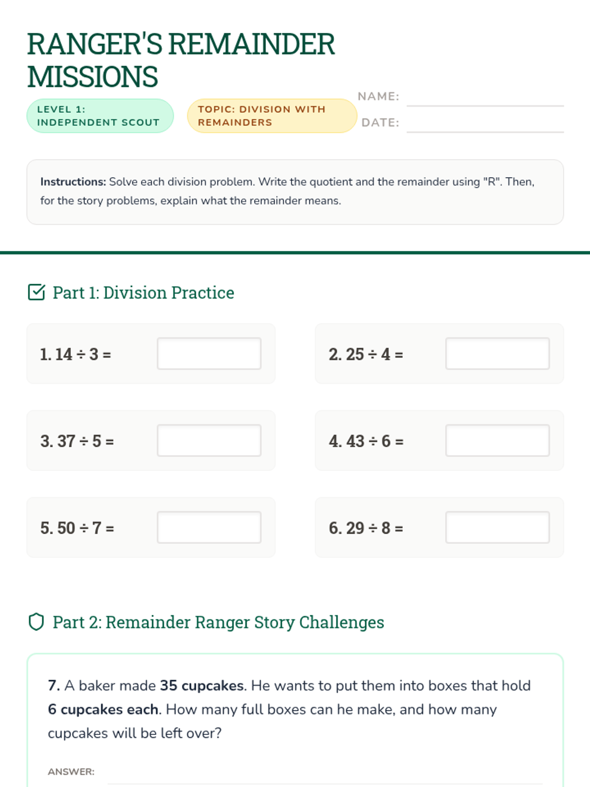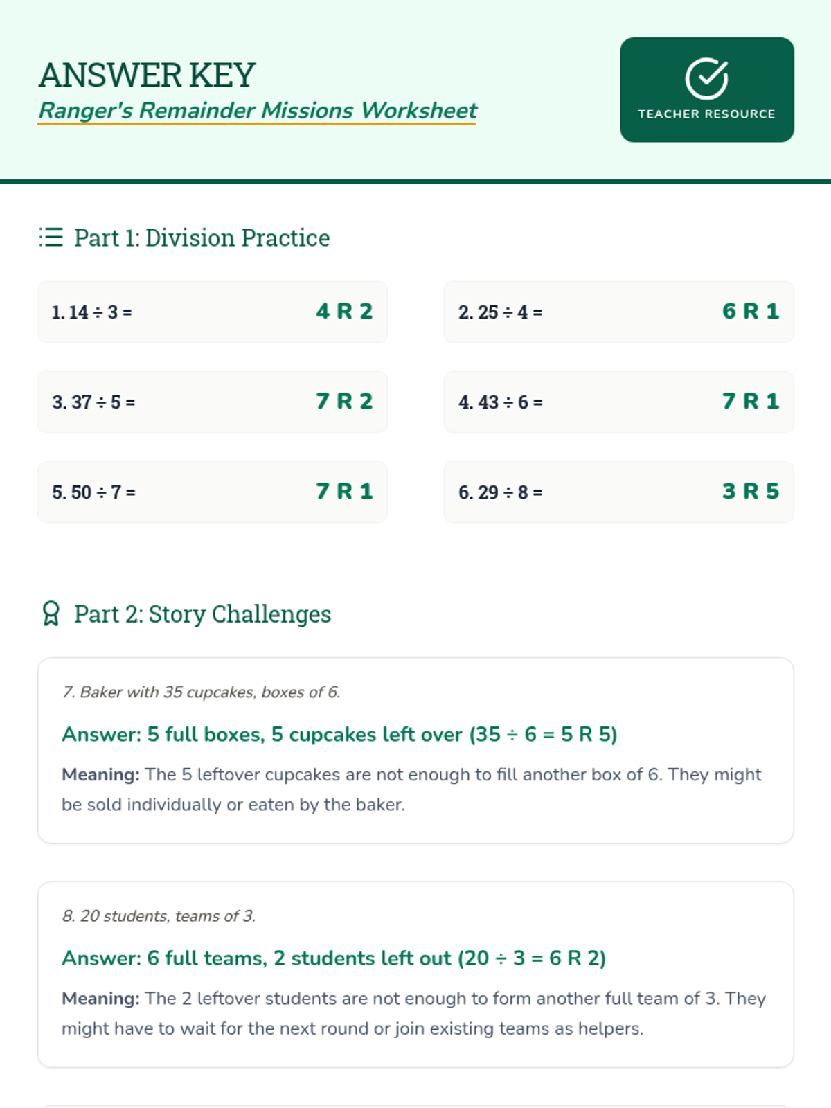 This lesson introduces division with remainders through a 'Remainder Rangers' adventure theme. Students will explore what leftovers represent in real-world contexts, practice solving division problems, and learn to interpret remainders in various scenarios.
