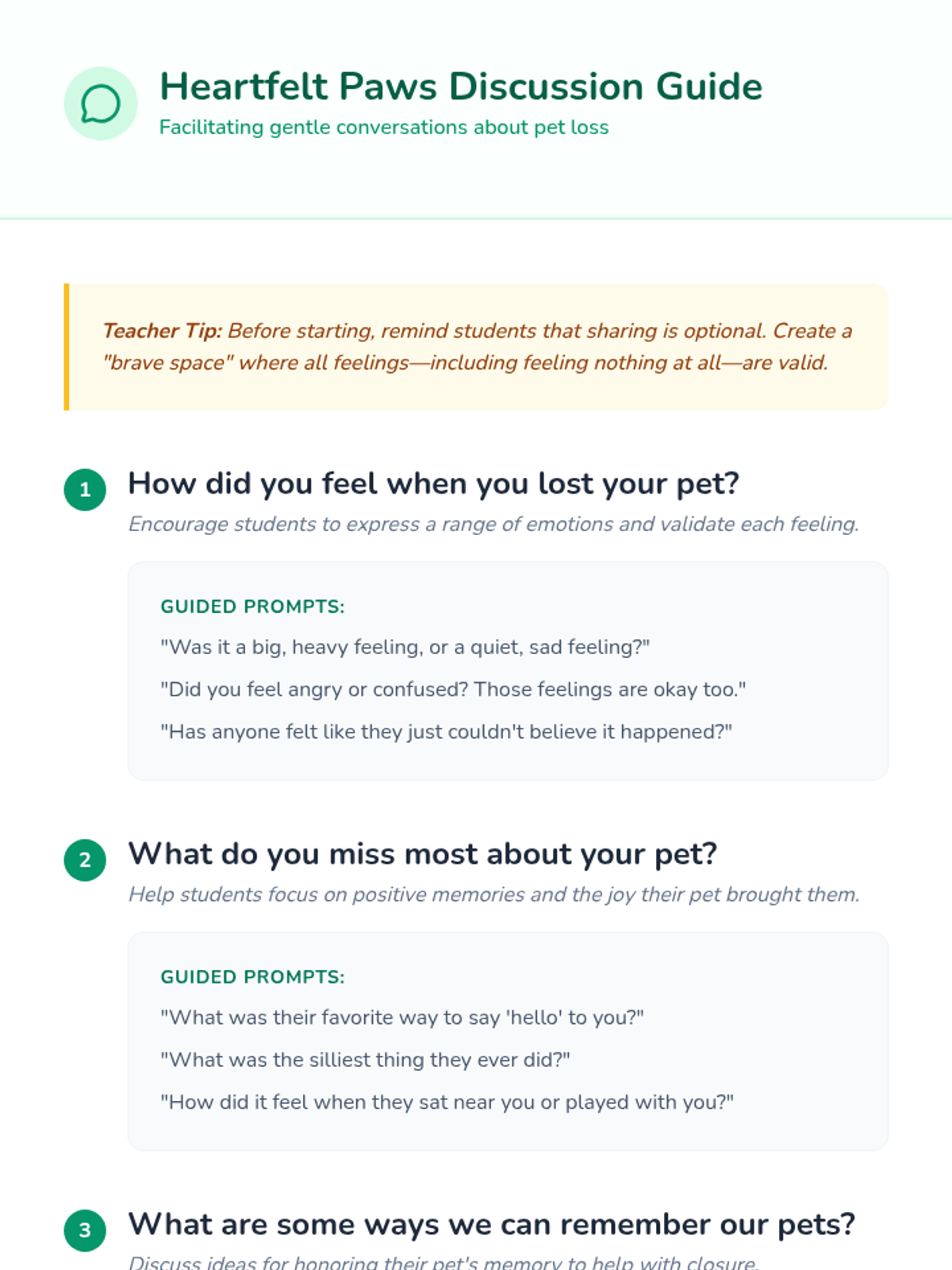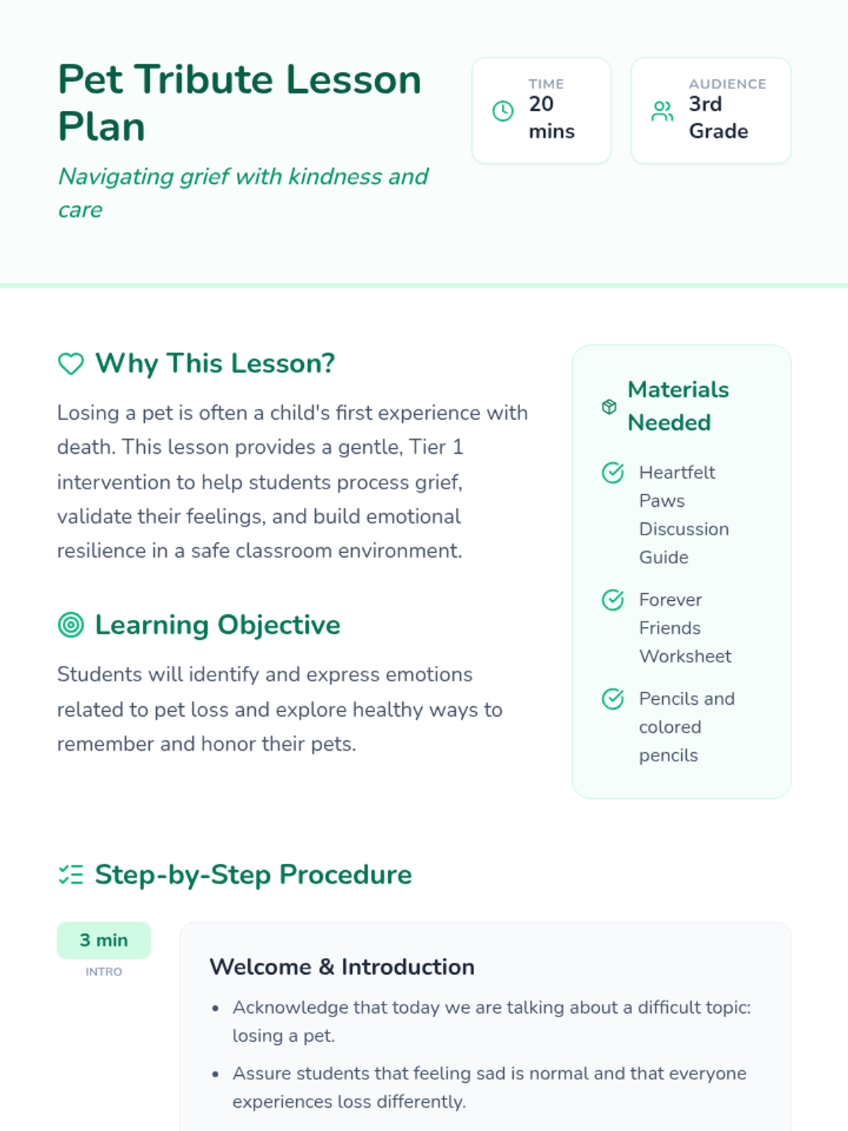 A gentle and supportive 20-minute lesson designed to help 3rd-grade students navigate the difficult emotions of losing a pet through guided discussion and creative reflection.