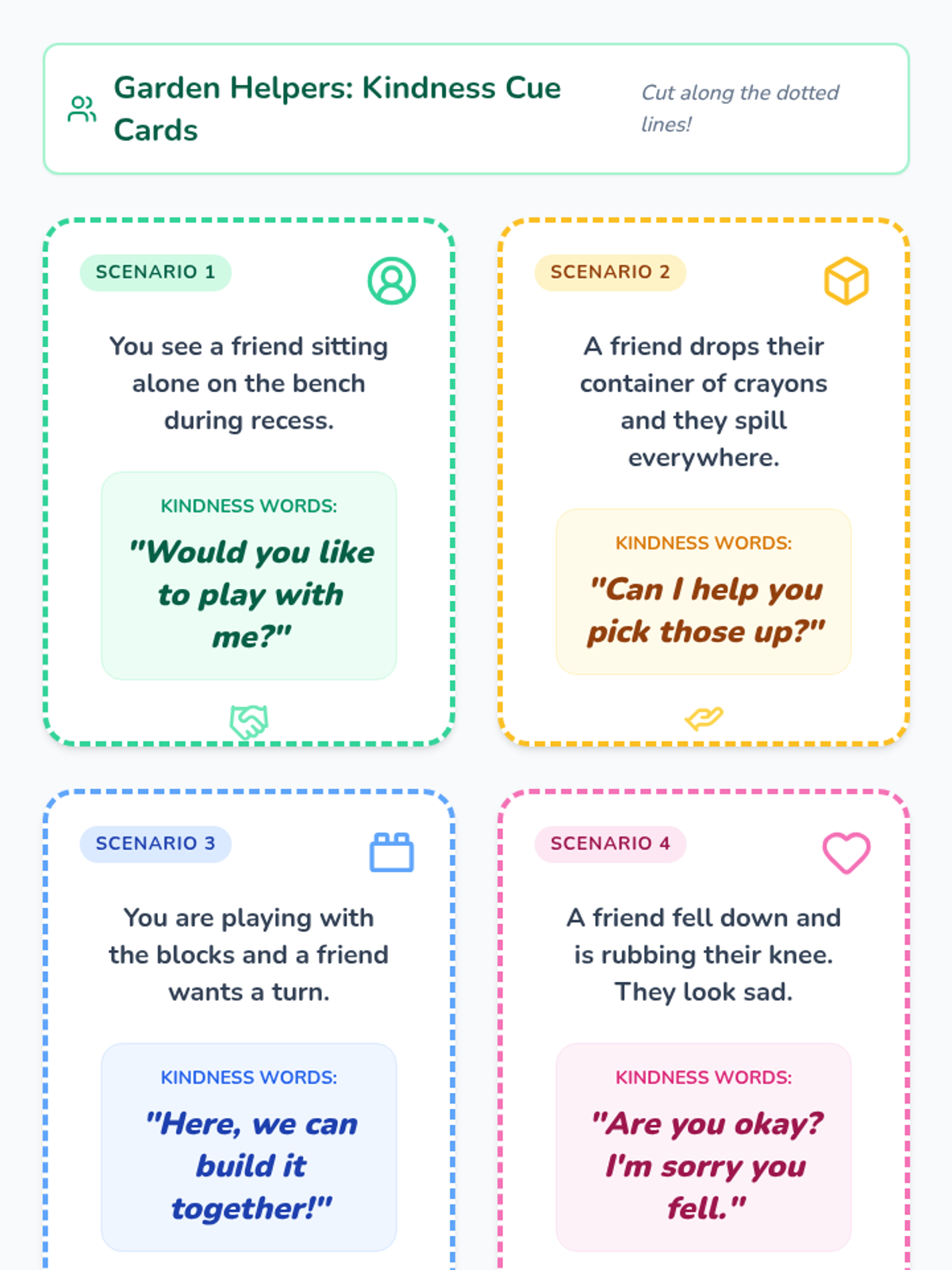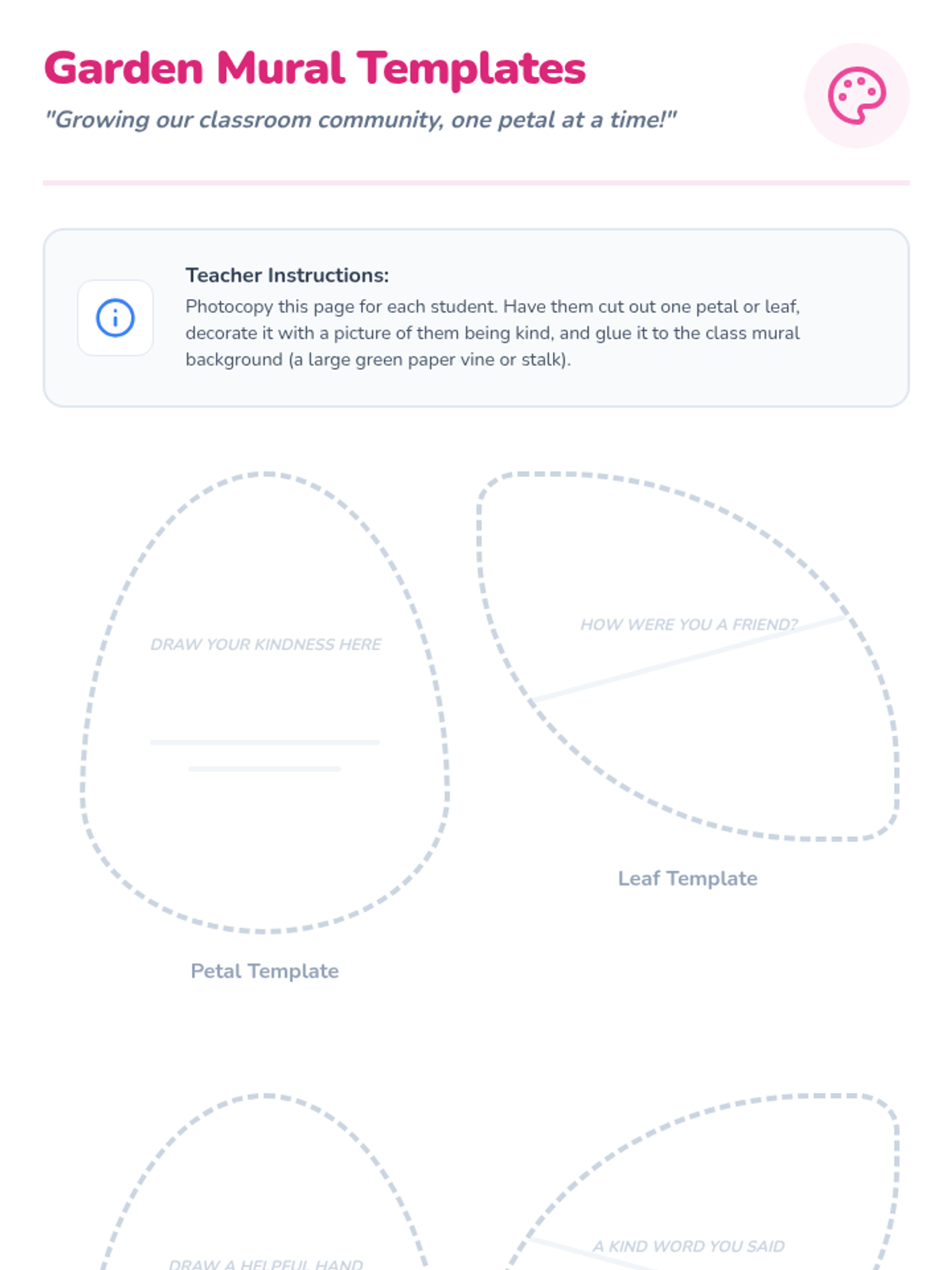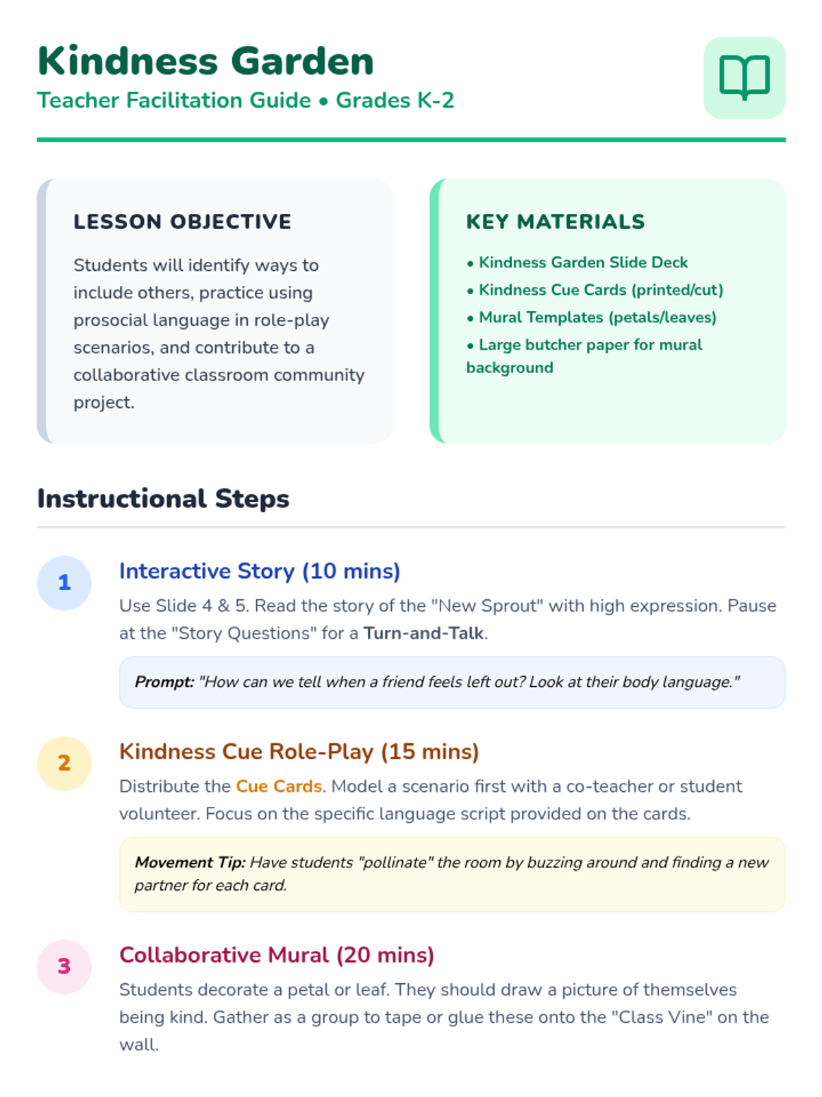 A comprehensive SEL lesson for grades K-2 focusing on friendship, kindness, and inclusion through a 'Kindness Garden' theme. Includes an interactive story, role-play activities, and a collaborative mural project.