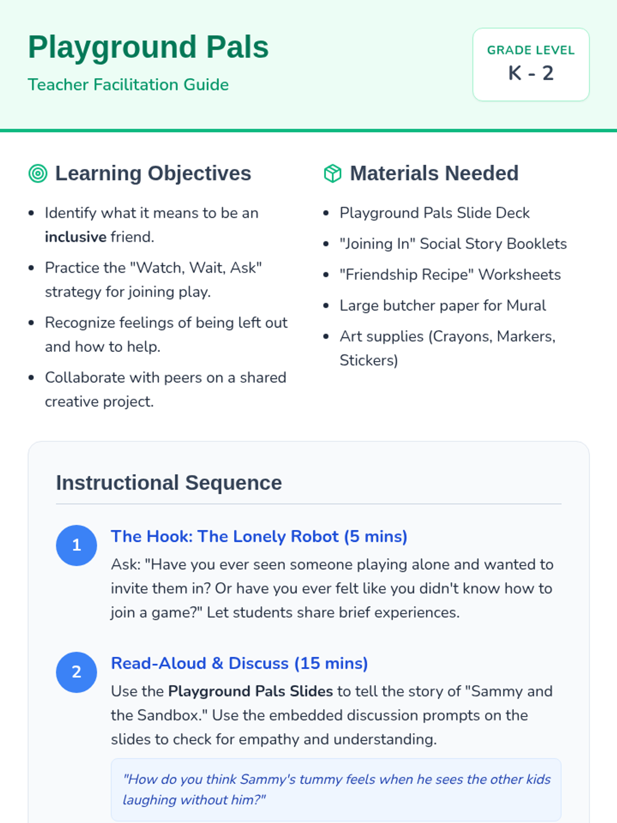 A comprehensive SEL lesson for grades K-2 focused on building friendship skills, practicing inclusive play, and learning how to join in with others through a social story, role-play, and collaborative art.