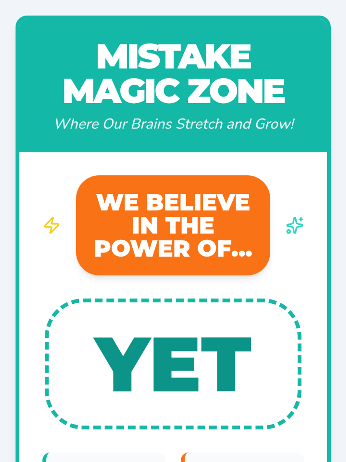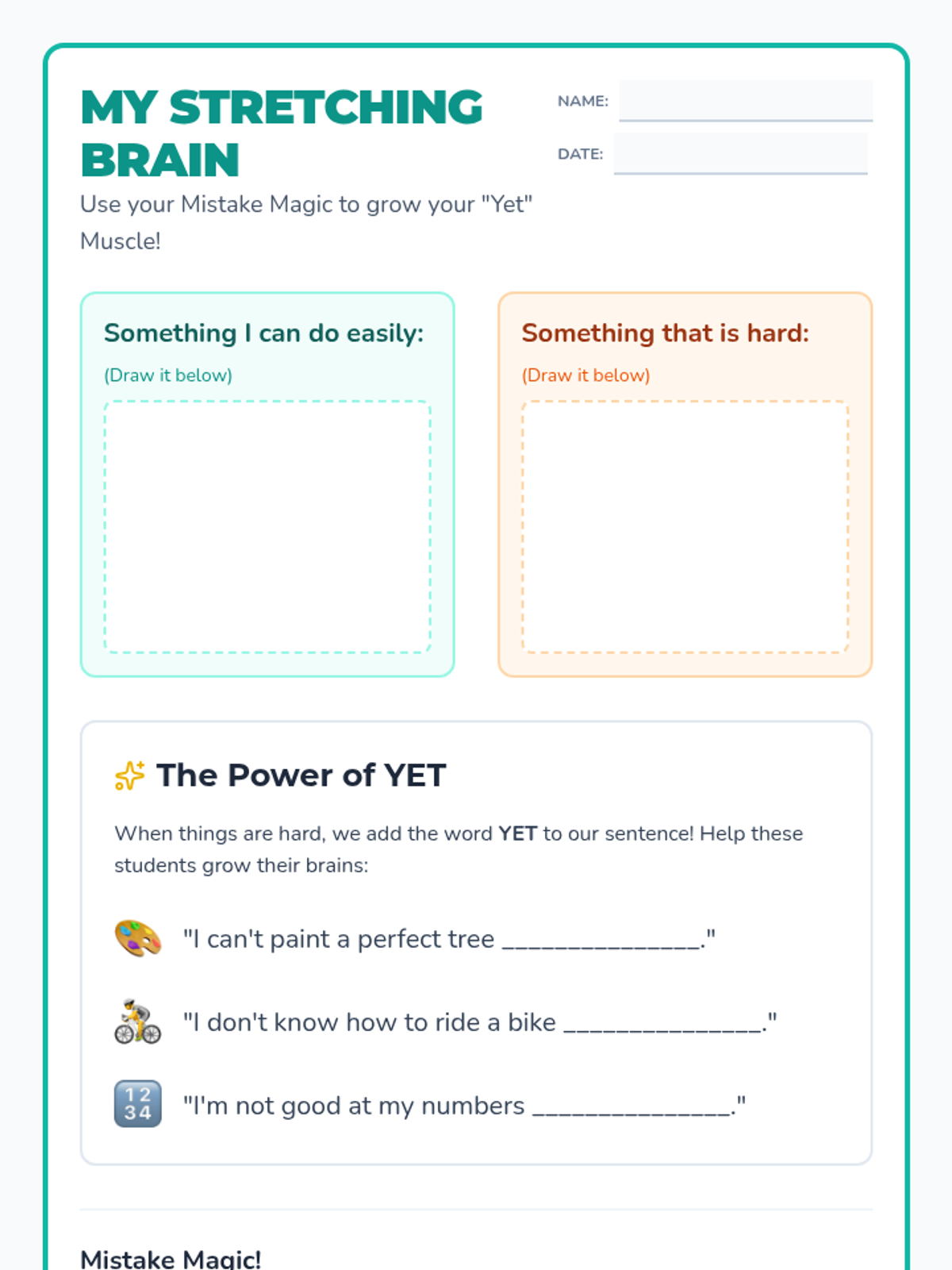 Students explore how their brains make new connections when they learn hard things, practice using the word 'yet', and transform mistakes into art.