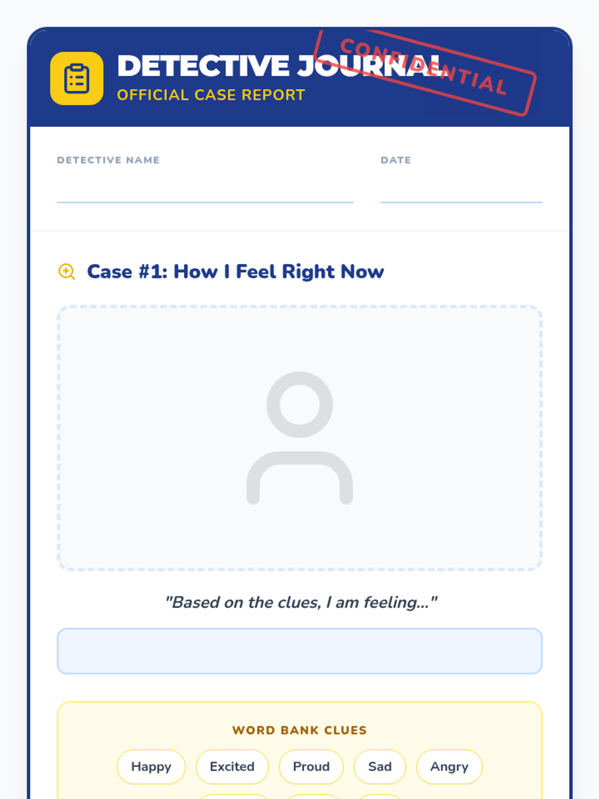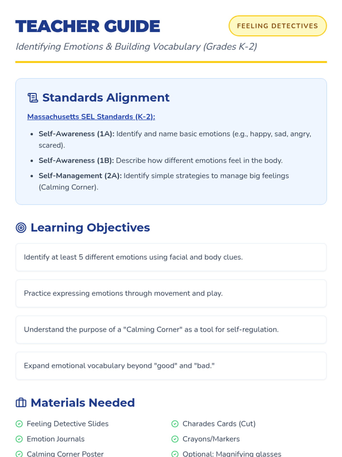 A K-2 counseling lesson focused on identifying emotions, expanding vocabulary, and introducing self-regulation through a calming corner. Students act as 'Feeling Detectives' to notice clues in faces and bodies.