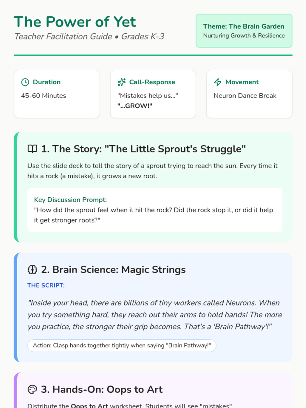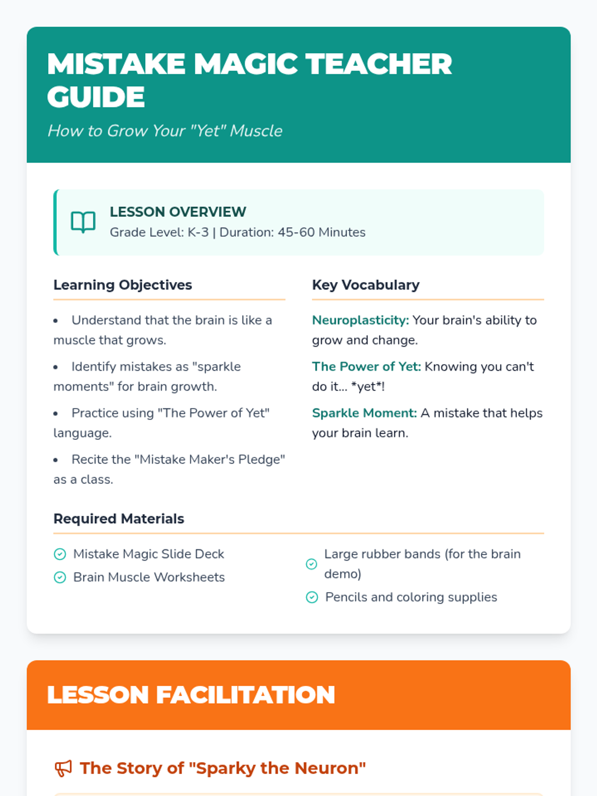 A K-3 lesson focusing on neuroplasticity, the value of mistakes, and developing a growth mindset through storytelling and hands-on activities.