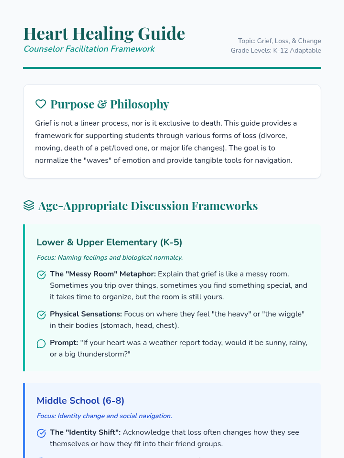 An adaptable counseling session focused on understanding the complex emotions of grief and change, featuring feelings mapping and coping strategy development for K-12 students.
