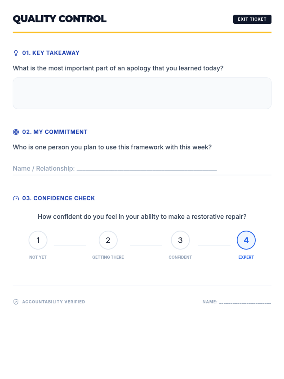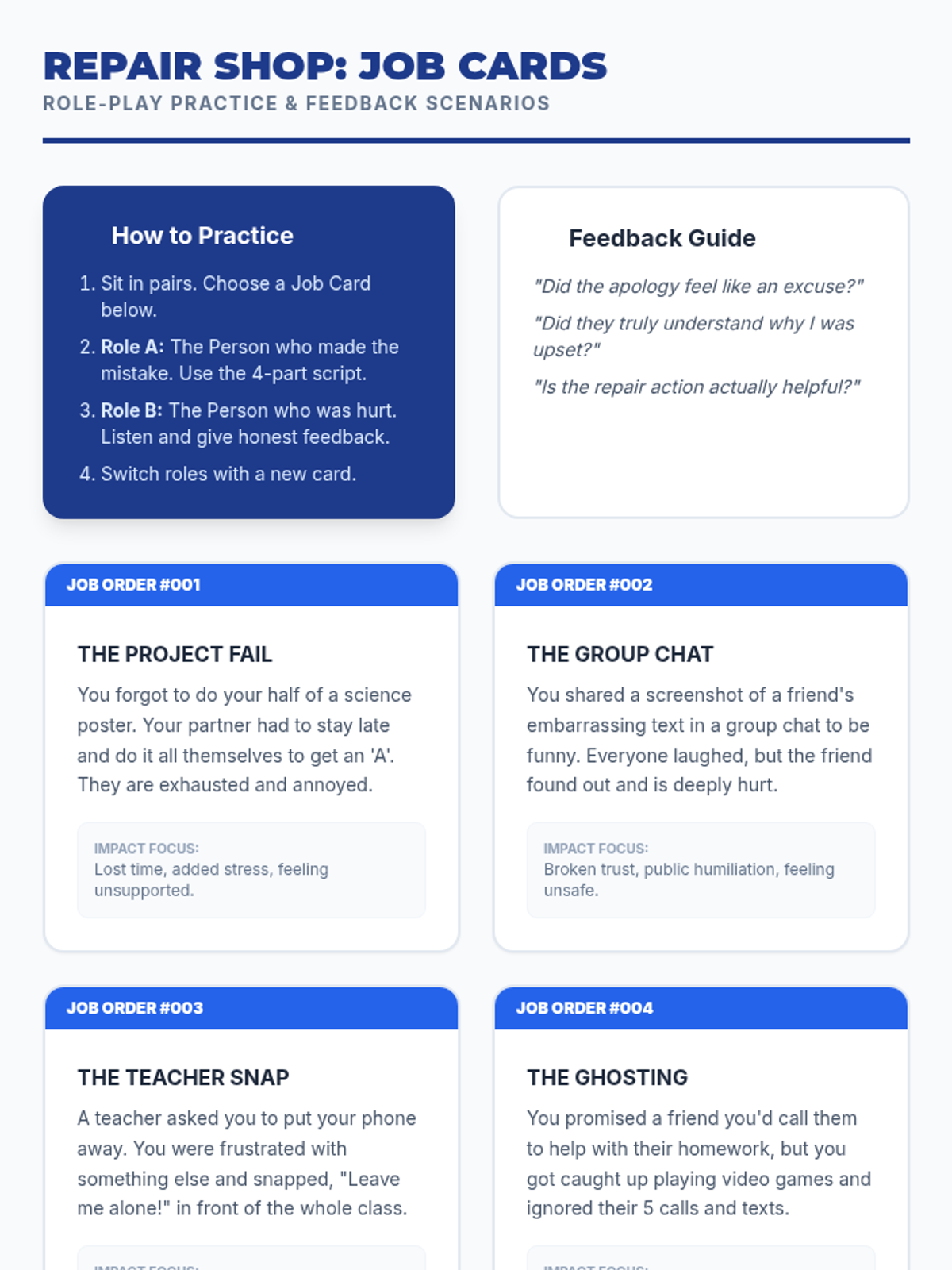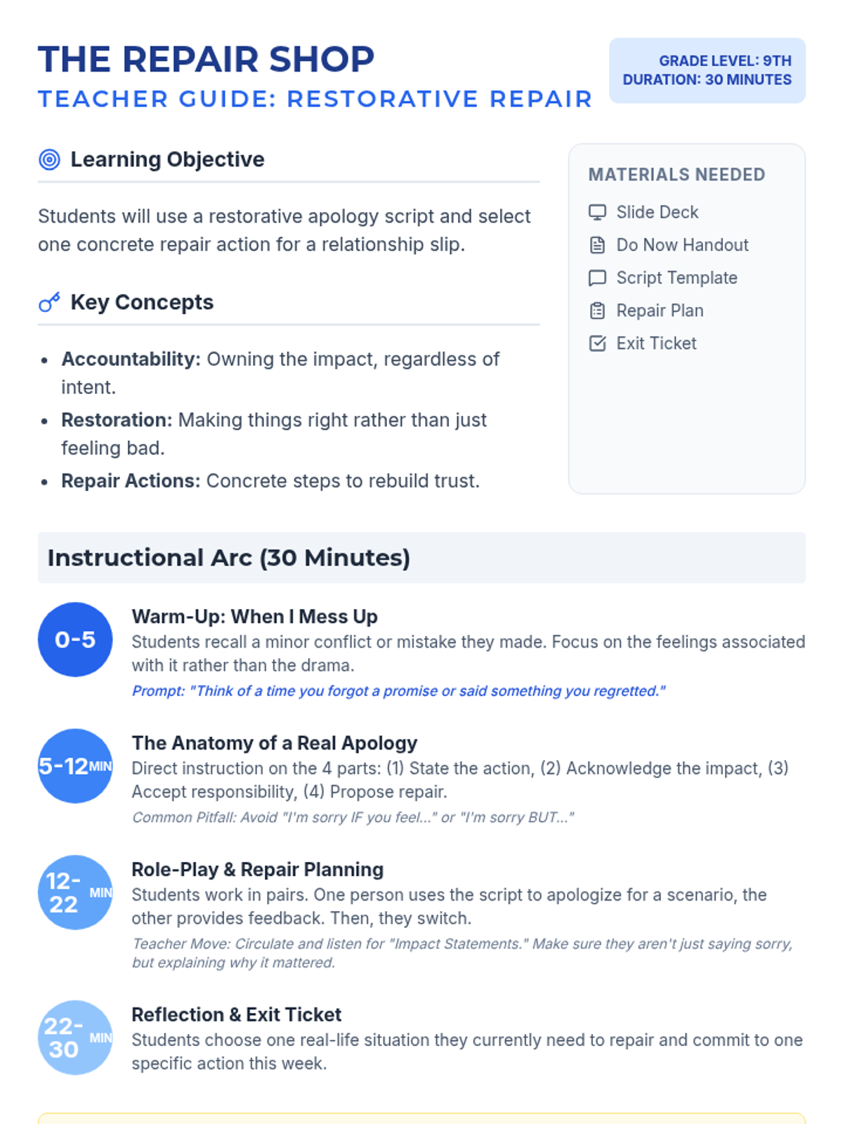 A 30-minute restorative justice lesson for 9th graders focused on moving beyond 'I'm sorry' to concrete repair actions. Students learn a 4-part apology framework and plan a specific action to restore a relationship after a minor conflict.