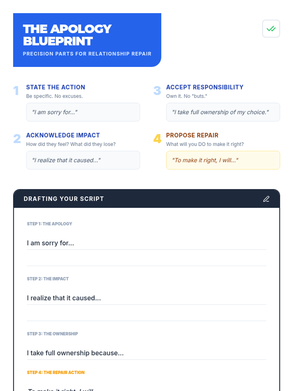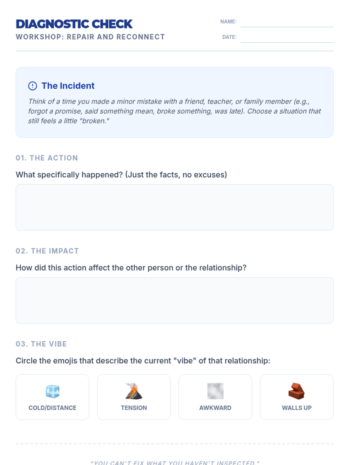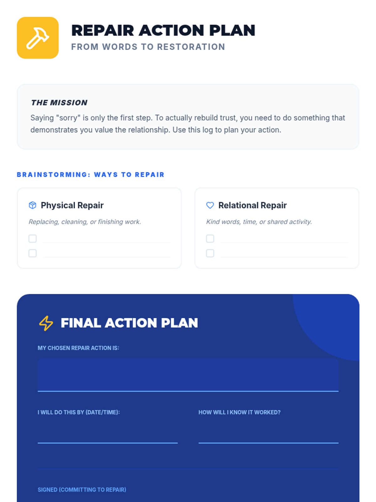 A 30-minute restorative justice lesson for 9th graders focused on moving beyond 'I'm sorry' to concrete repair actions. Students learn a 4-part apology framework and plan a specific action to restore a relationship after a minor conflict.