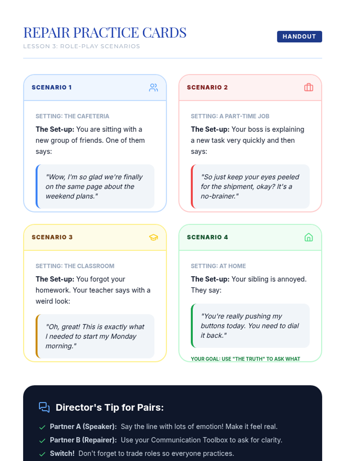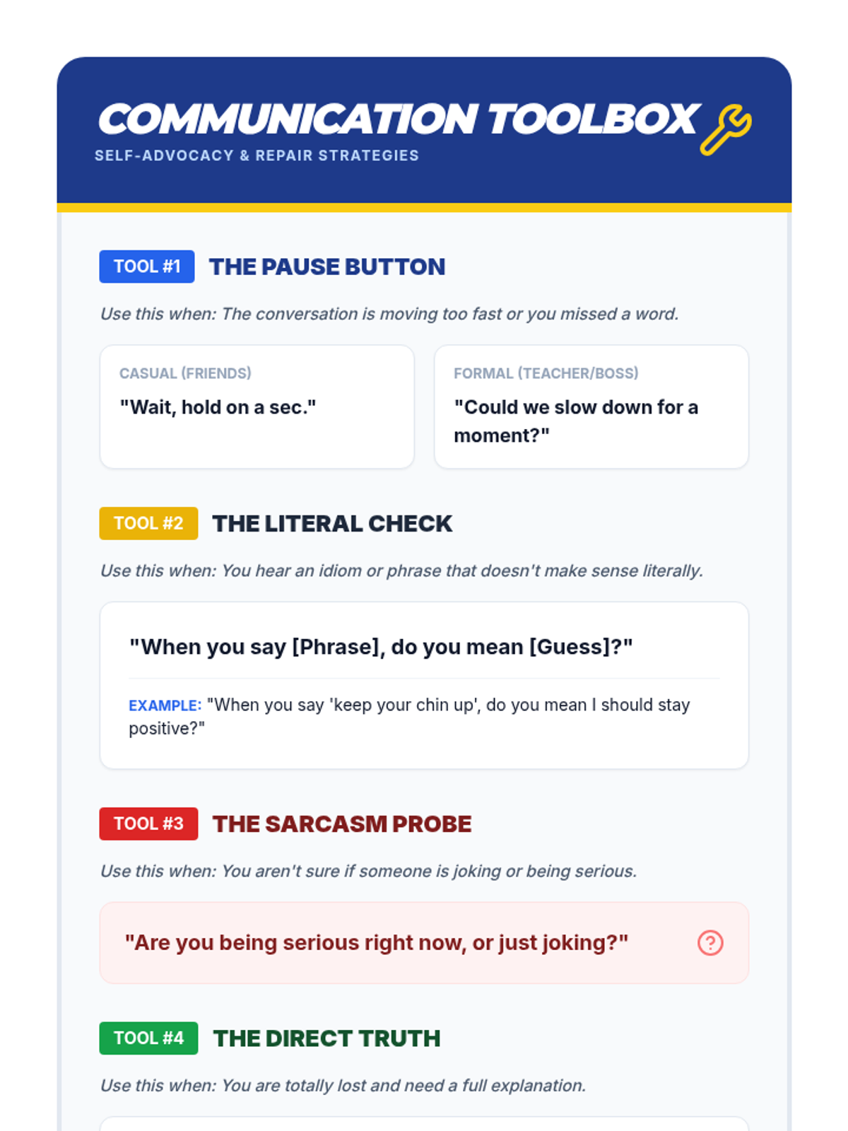 Students learn specific phrases and self-advocacy strategies to use when they encounter confusing figurative language.