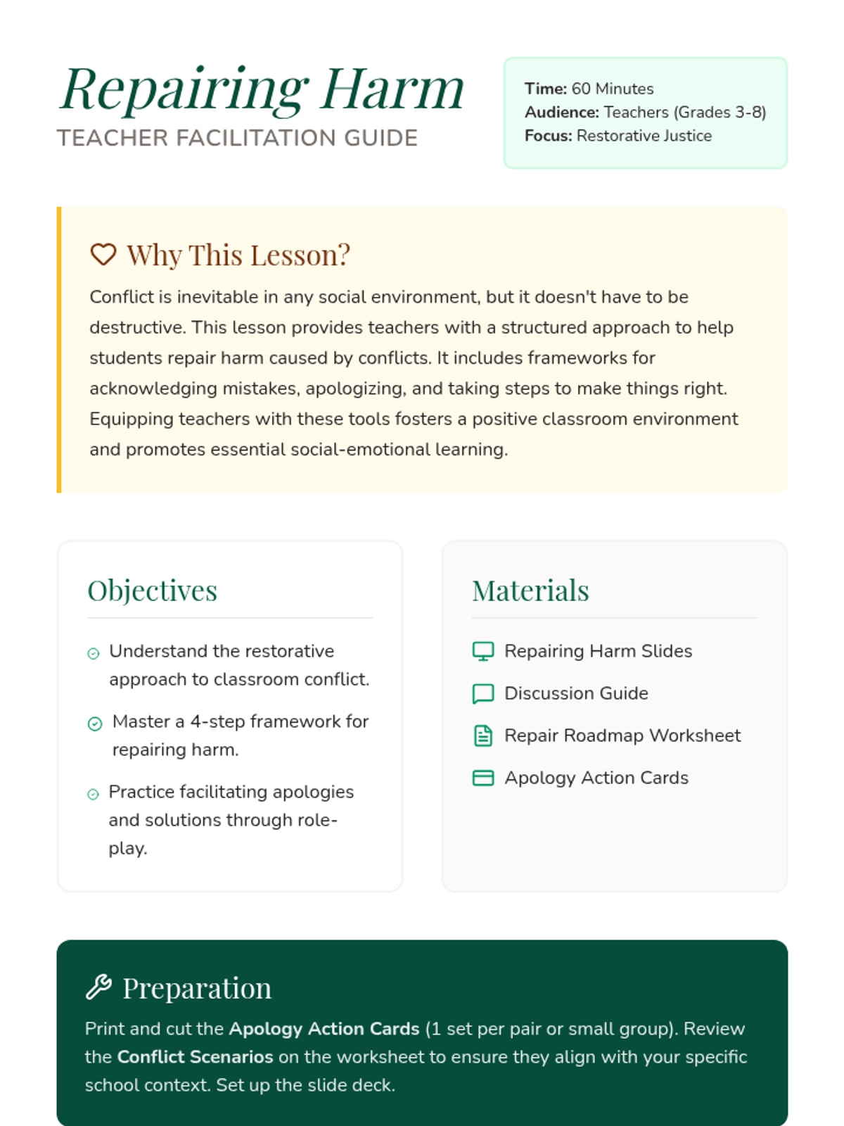 This lesson equips teachers with a structured framework to help students navigate conflict resolution. It covers the psychological impact of conflict and provides a four-step framework for acknowledging harm, apologizing sincerely, and making amends to restore classroom relationships.