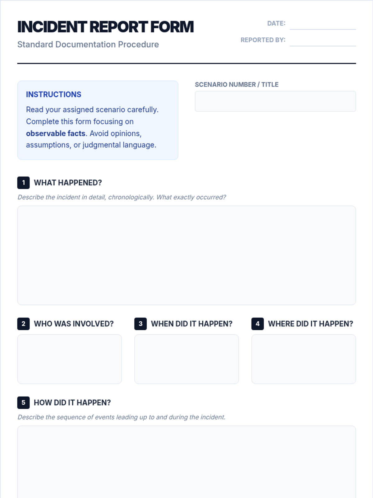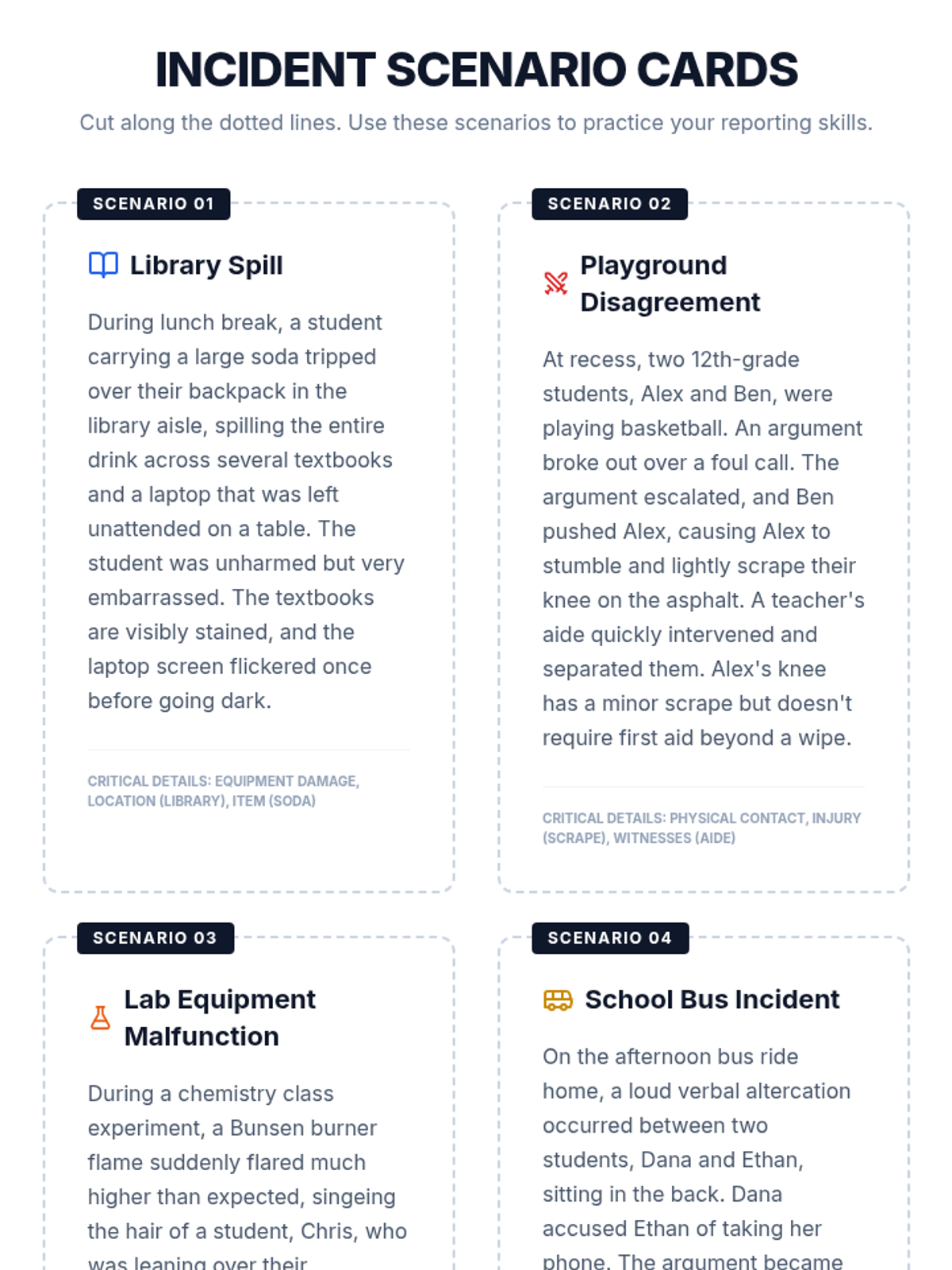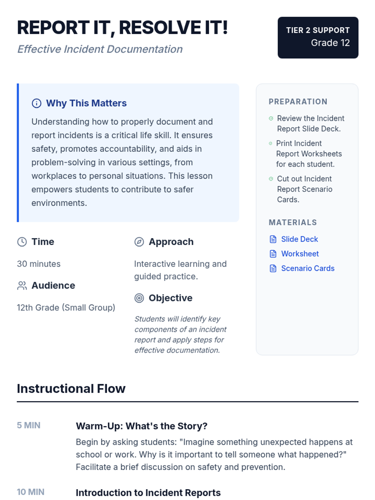 A 30-minute Tier 2 small group lesson for 12th graders on the importance and mechanics of accurate incident reporting for safety and accountability.