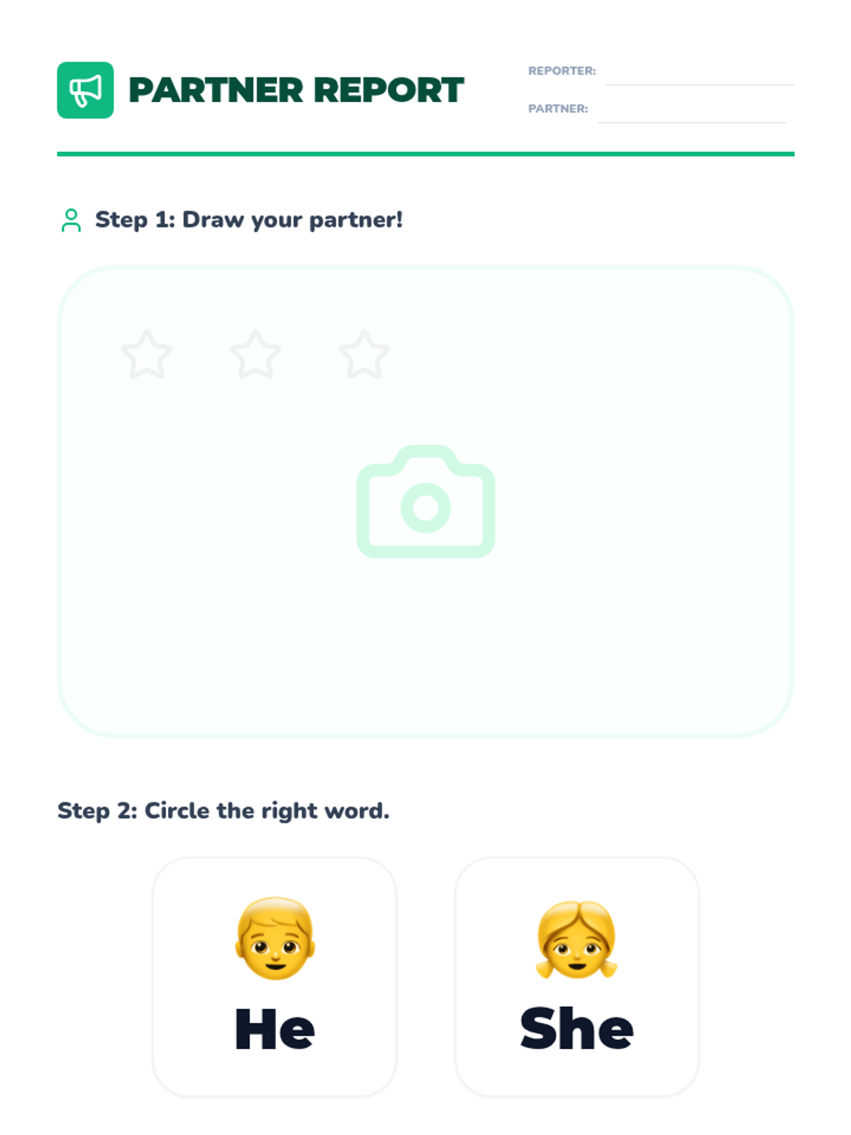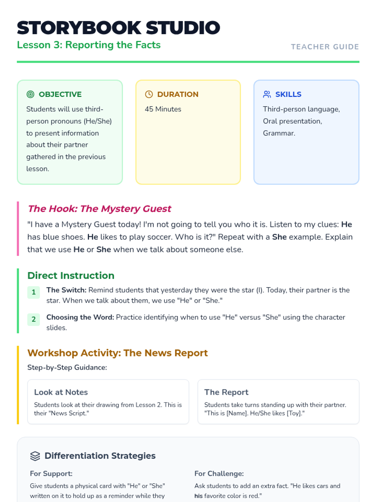 Using interview data, students introduce their partner to the class using 'He likes...' or 'She plays...', practicing the switch from 'I' to 'He/She'.