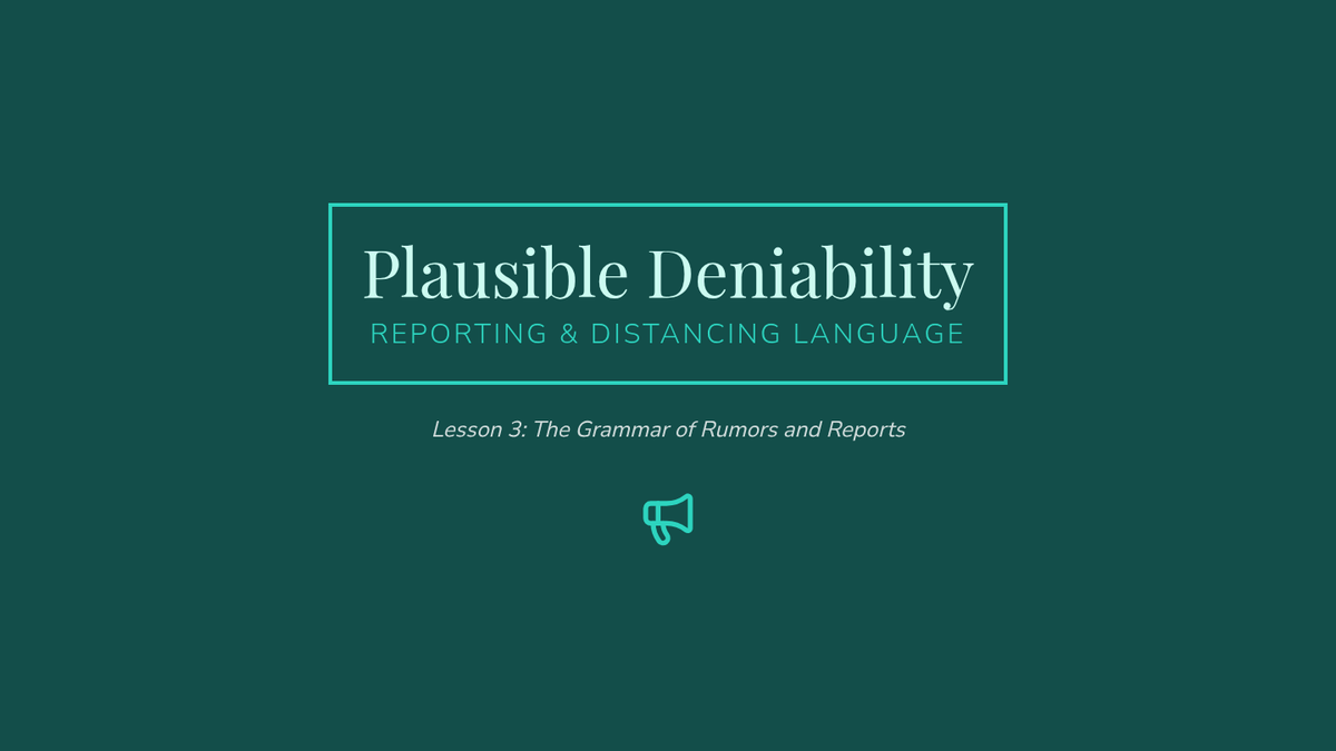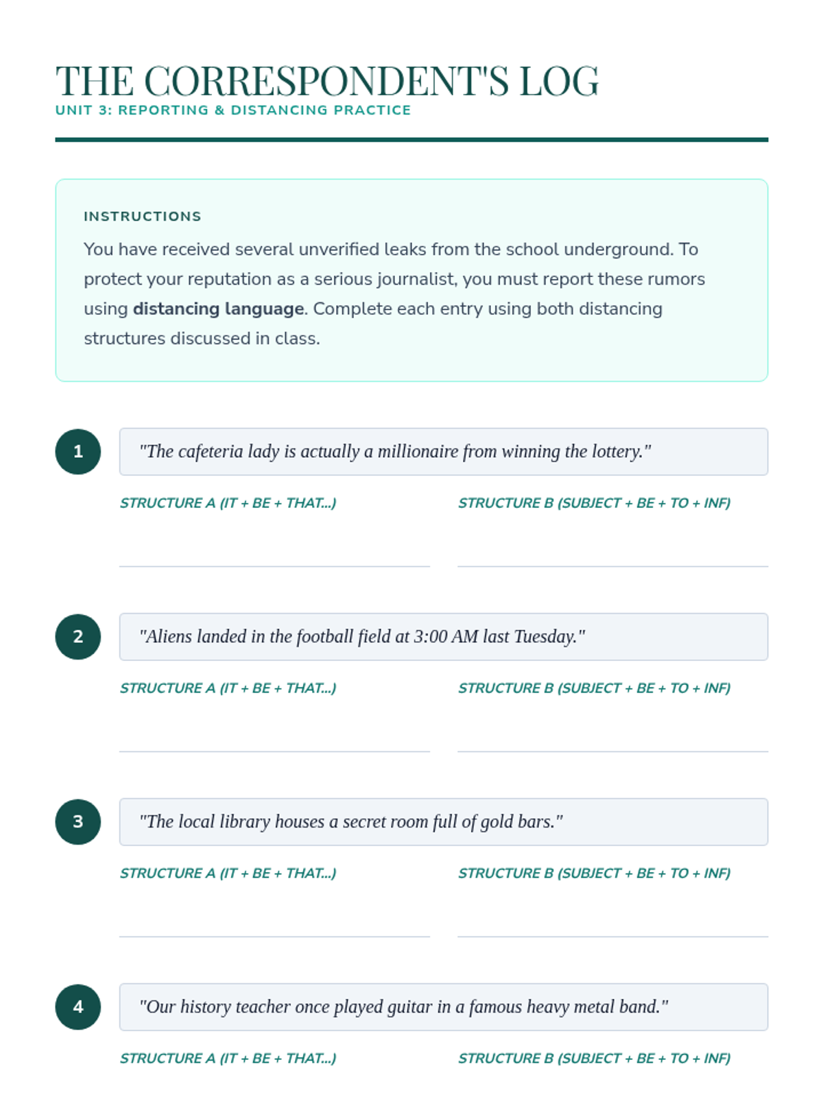 This lesson covers distancing language such as 'it is said that' and 'reported to be'. Students apply these structures to report unverified information and cultural beliefs.