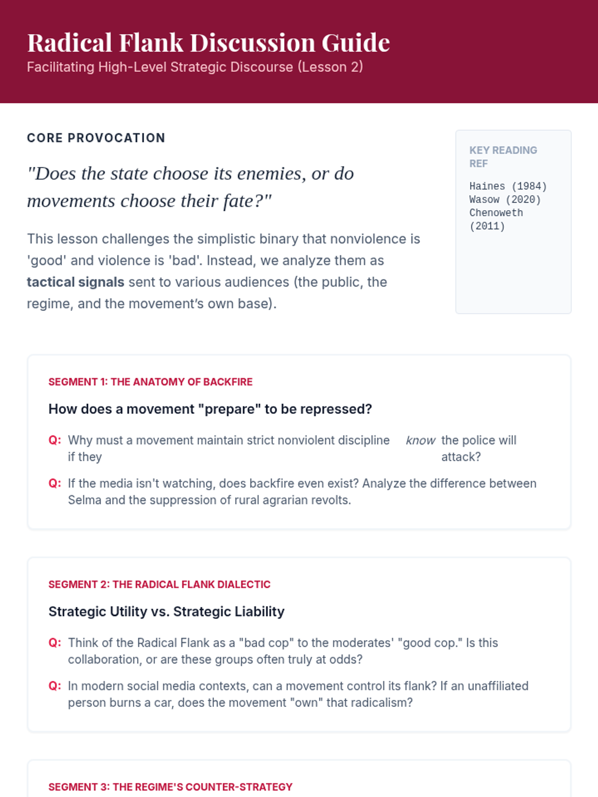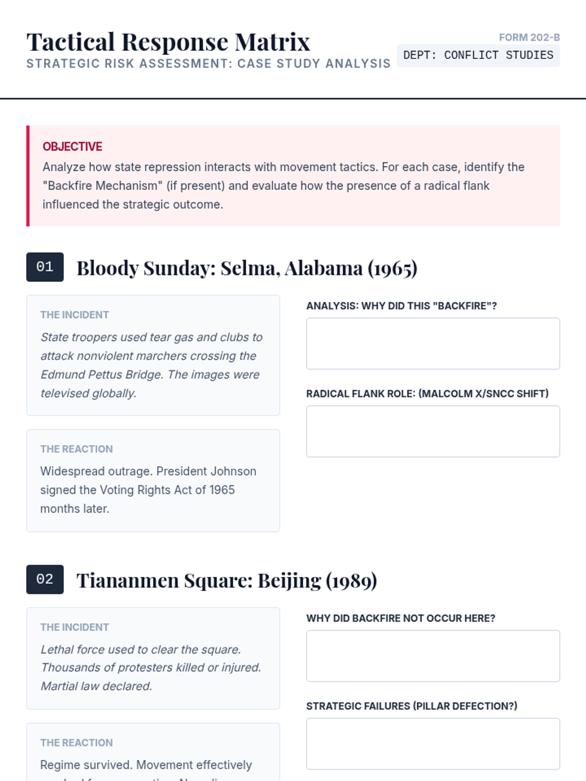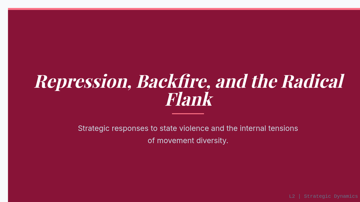 Examines the 'backfire' mechanism of state repression and the strategic implications of 'radical flanks' on movement legitimacy and bargaining power.