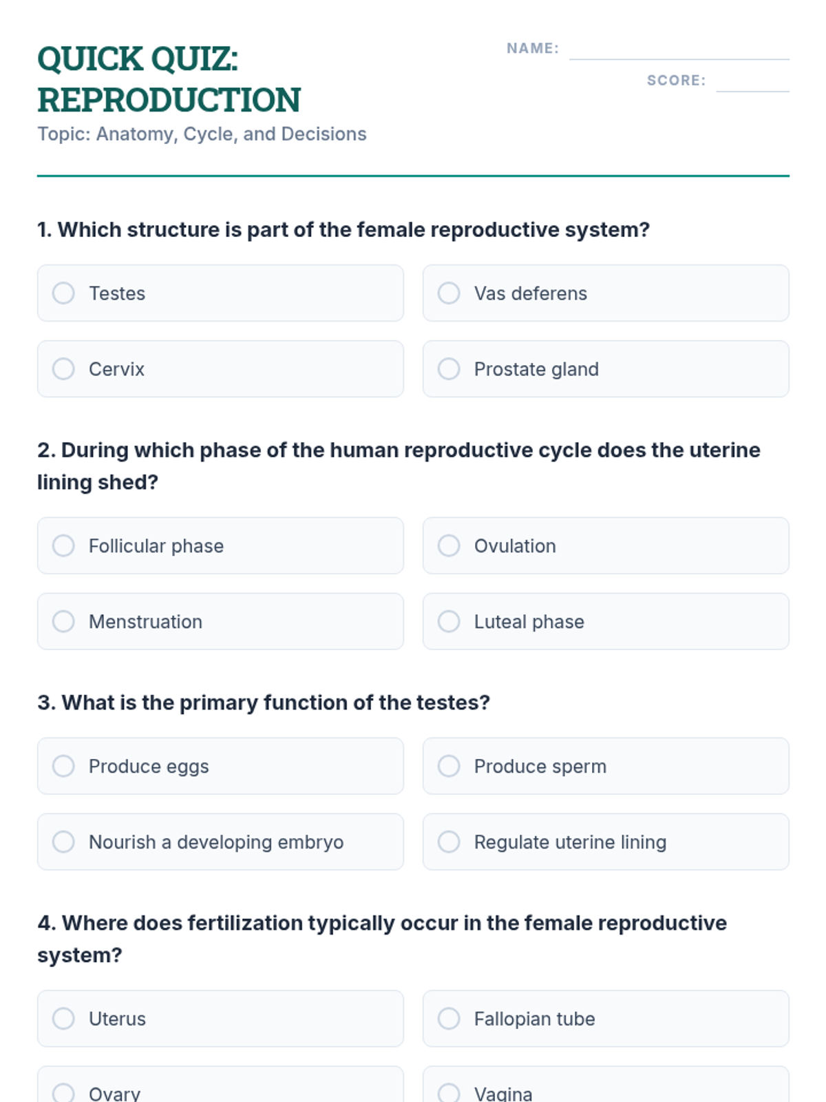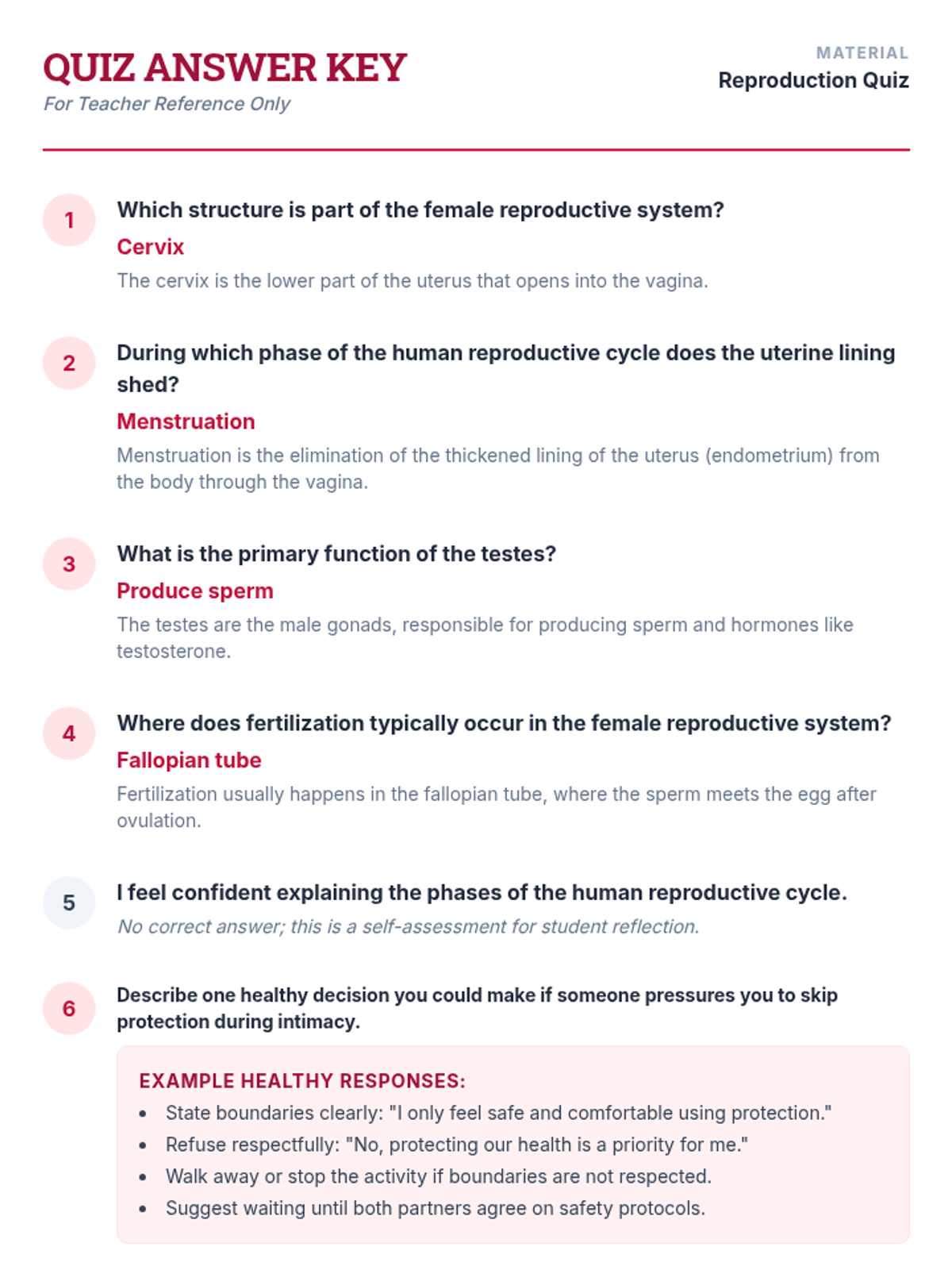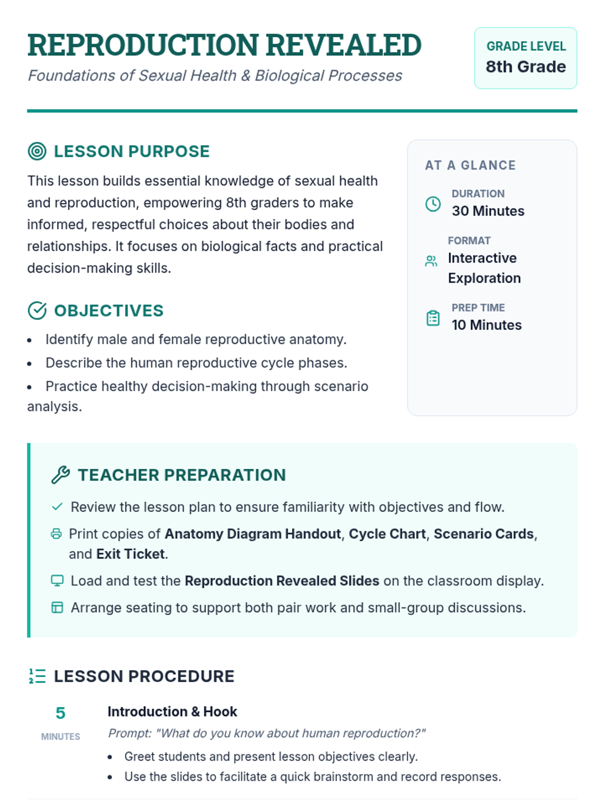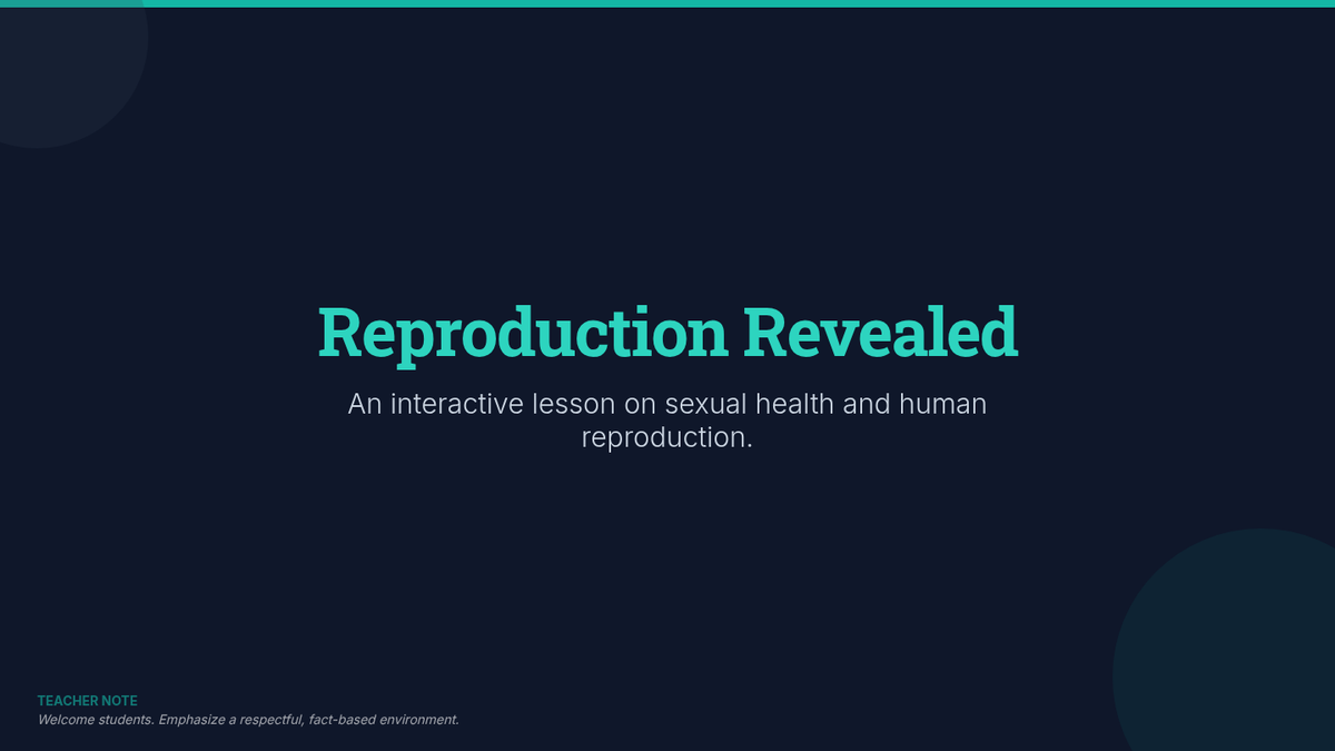 In this engaging 30-minute lesson, 8th grade students explore human sexual health and reproduction. They will identify reproductive anatomy, describe the reproductive cycle, and practice healthy decision-making through scenario analysis.