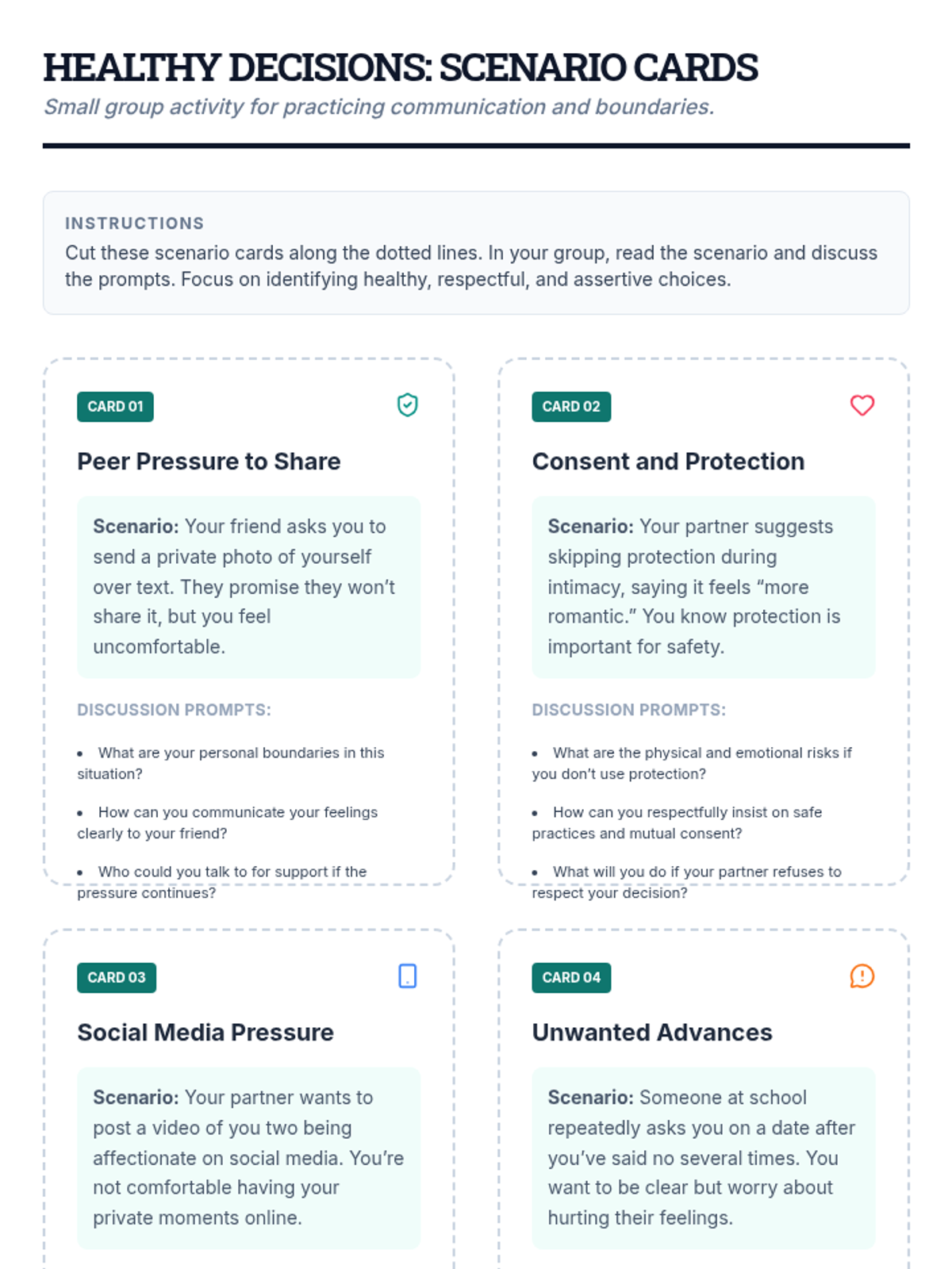 A comprehensive lesson on identifying unsafe social situations, setting physical and emotional boundaries with peers, and practicing assertive communication across school and community settings.