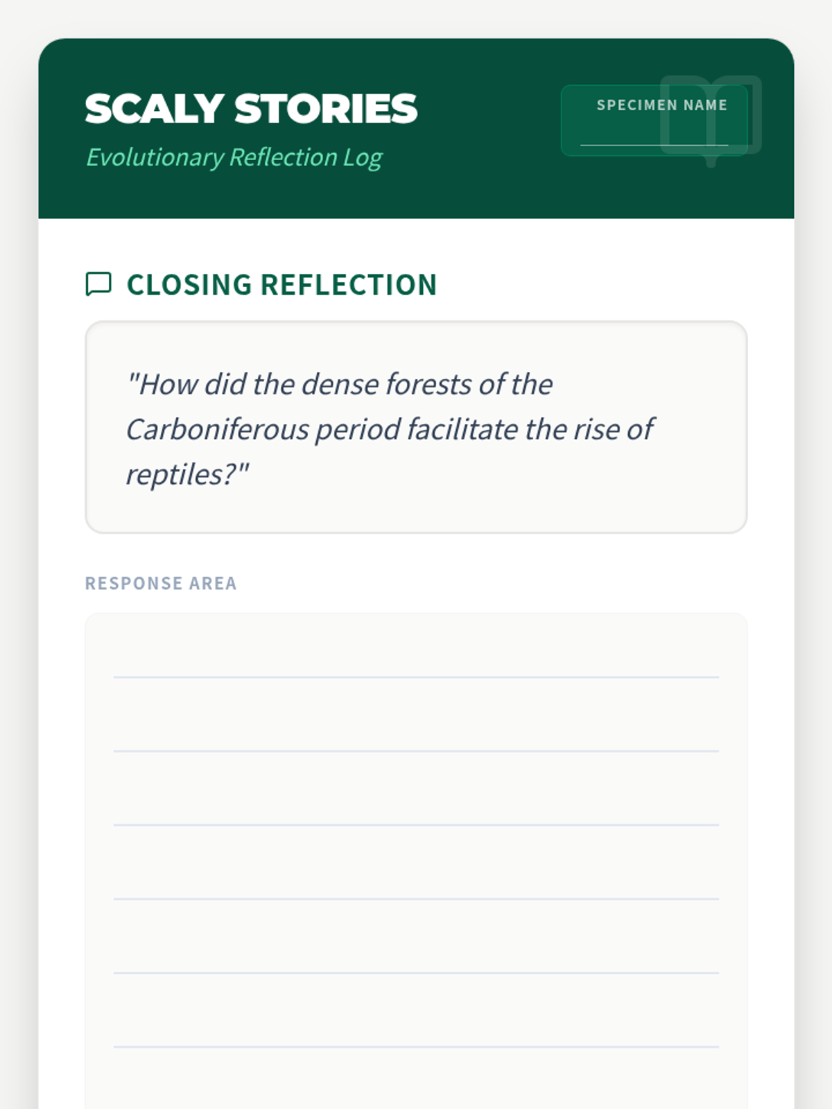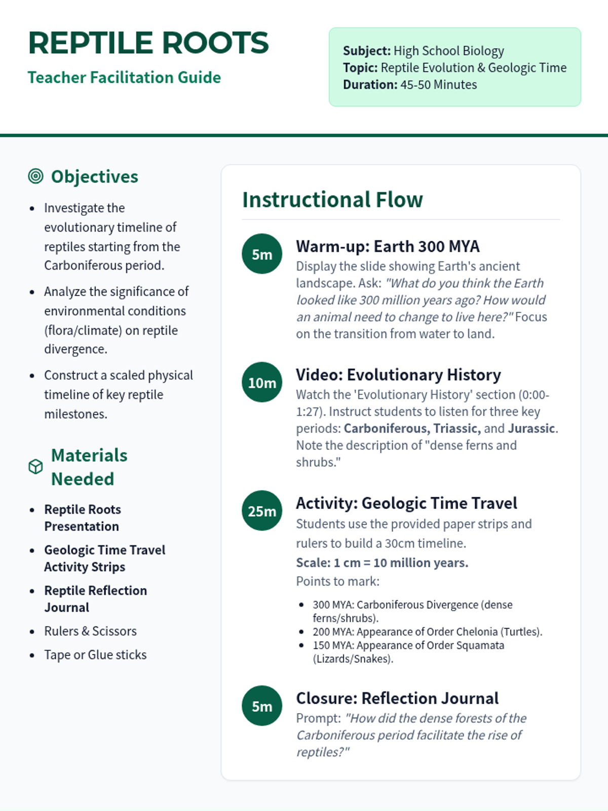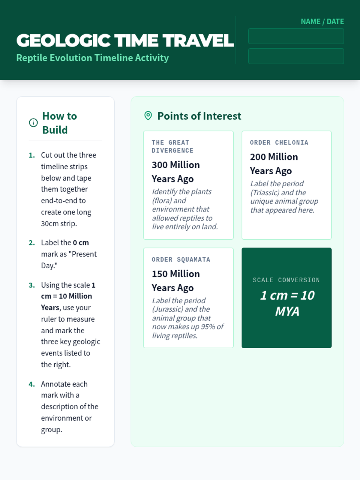 Students explore the evolutionary history of reptiles, tracing their origins from the Carboniferous period through the Mesozoic era. The lesson features a hands-on timeline construction activity where students map key evolutionary milestones and environmental conditions.