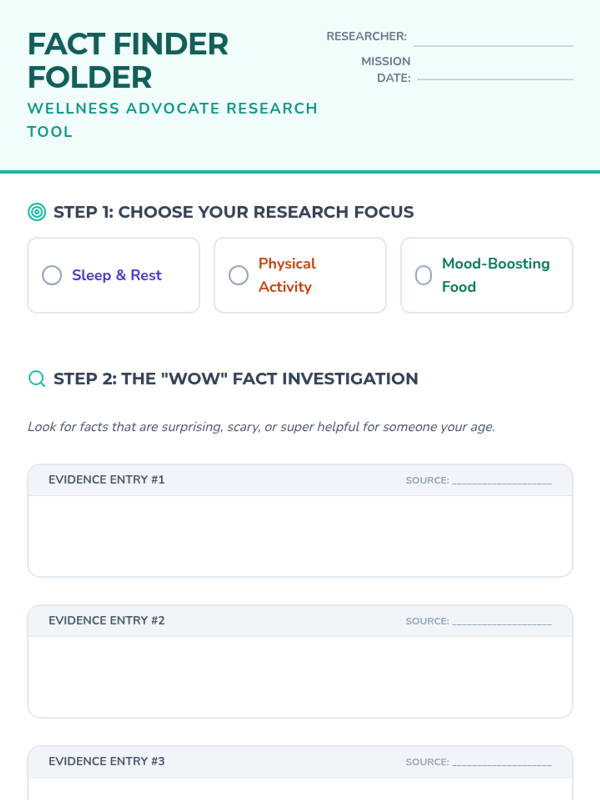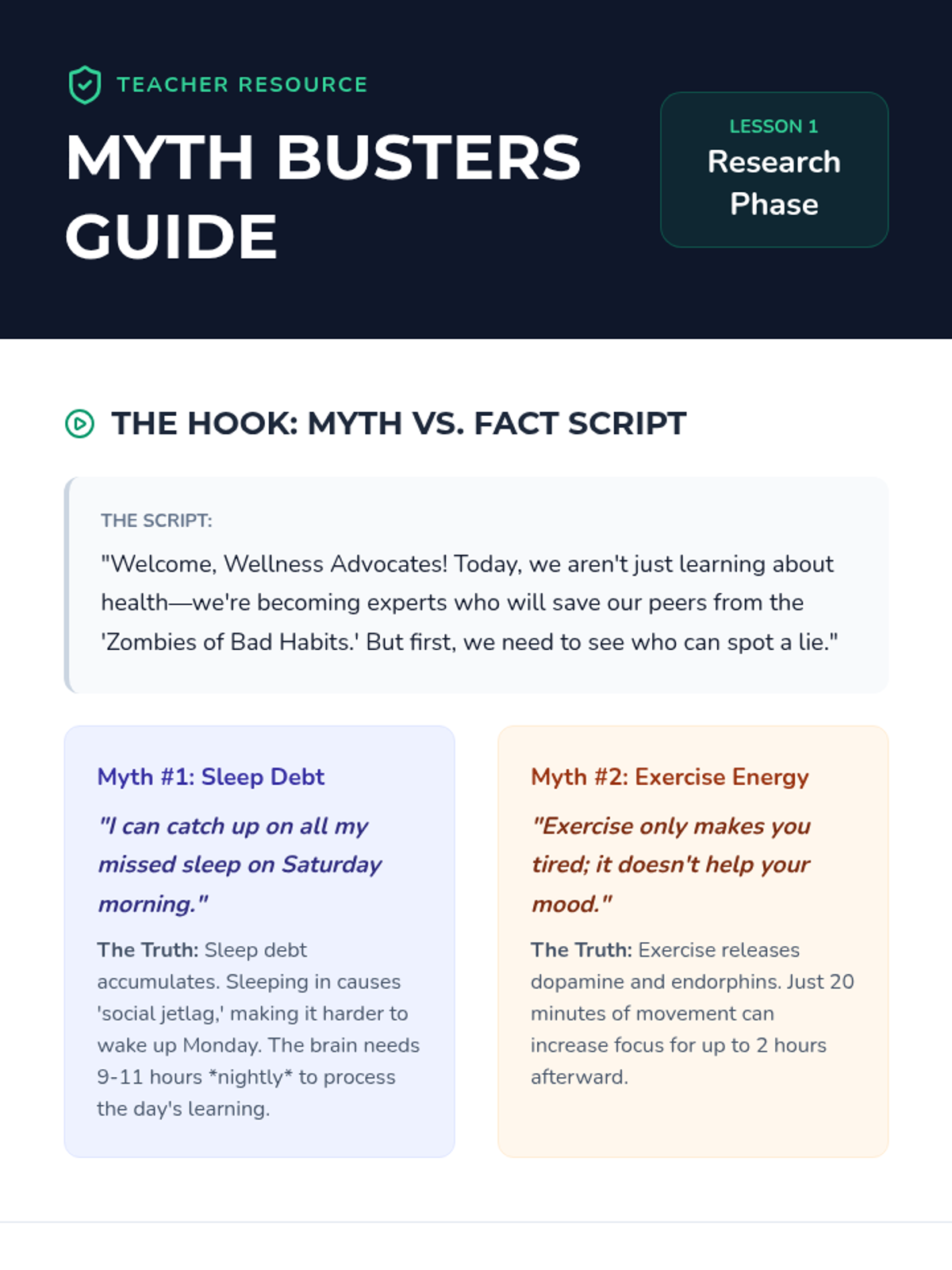 Students investigate the pillars of health (sleep, activity, nutrition) and use a quiz-show format to debunk myths and gather compelling facts for their wellness campaigns.