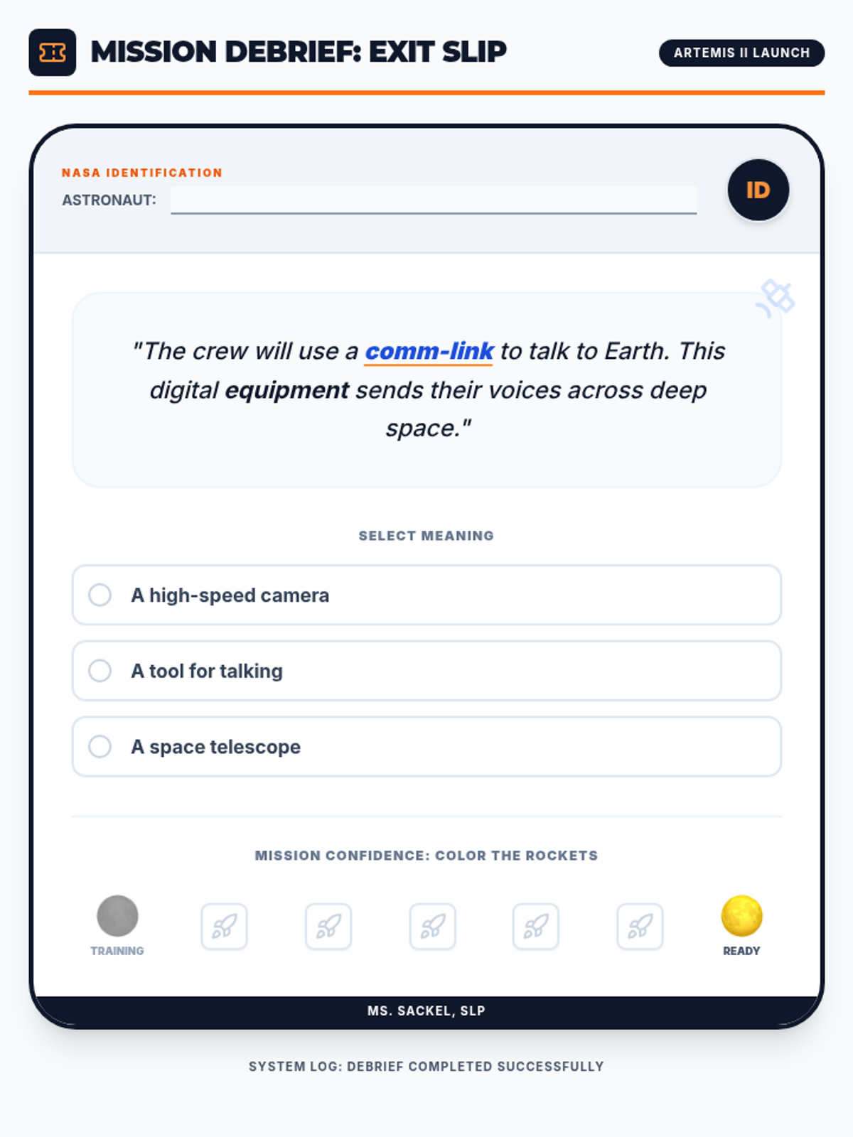 A high-energy vocabulary mission themed around the Artemis II NASA moon launch. Students master Tier 2 multiple meaning words while using 'Flight Control' brain hacks for impulse control and working memory. Designed for a 30-minute interview demonstration.