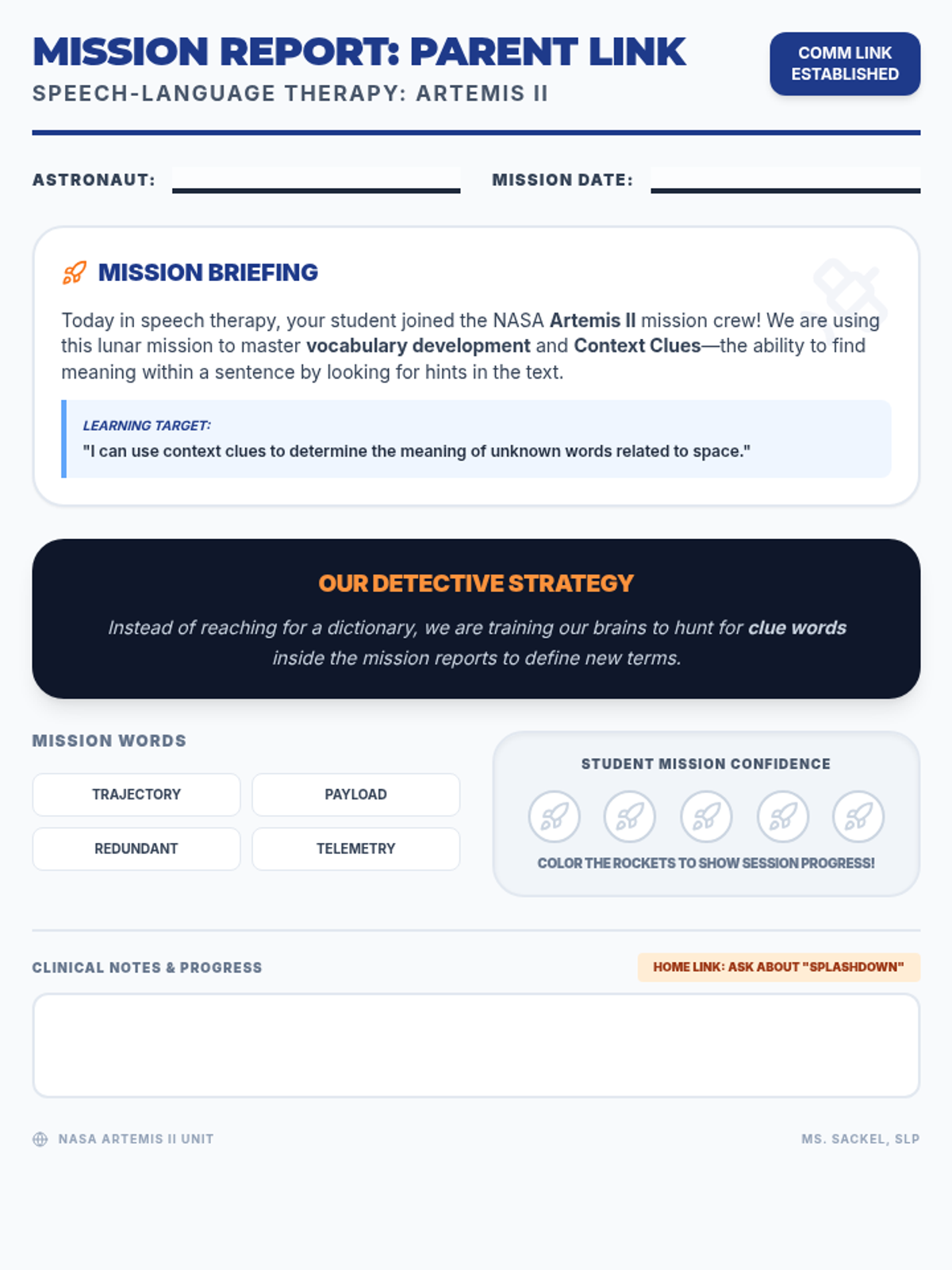 A vocabulary-focused speech-language therapy lesson for middle schoolers centered on the Artemis II mission. Students learn to use context clues (IDEAS) to decipher mission-specific terminology.