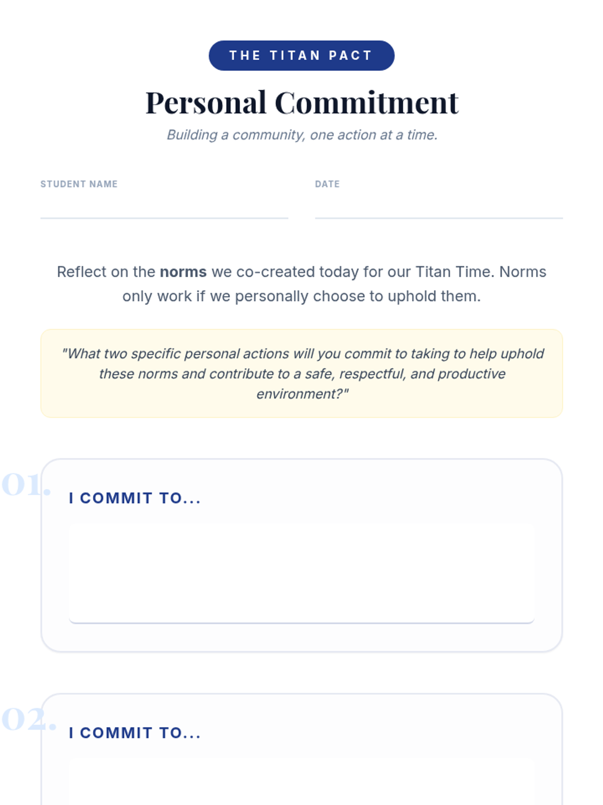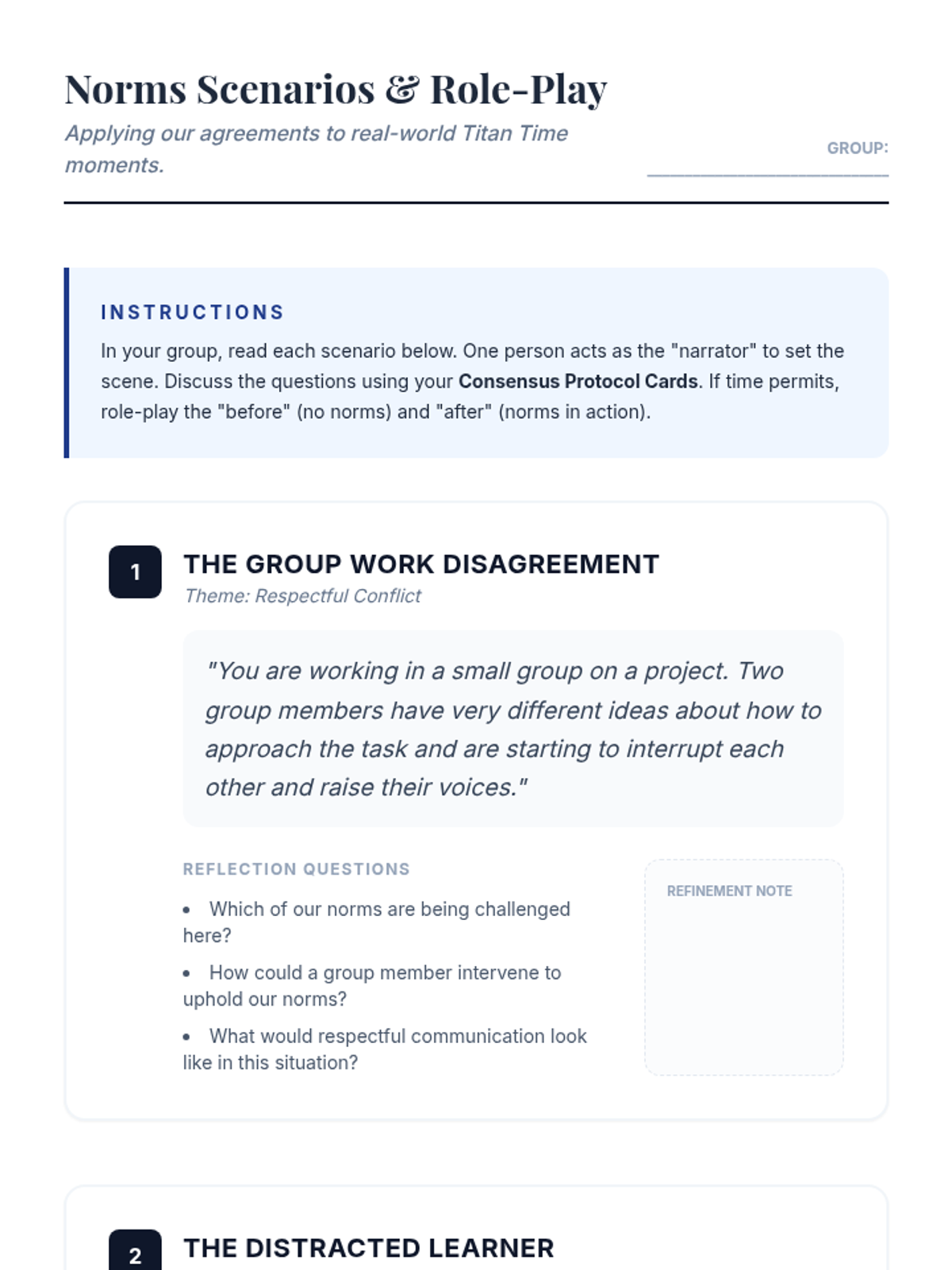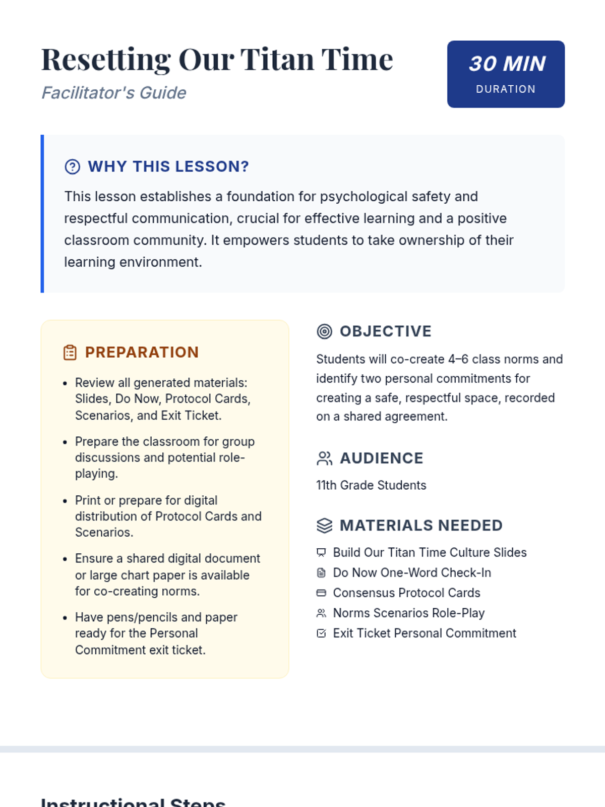A 30-minute collaborative session for 11th graders to establish community norms, foster psychological safety, and build a respectful classroom culture through discussion and role-play.