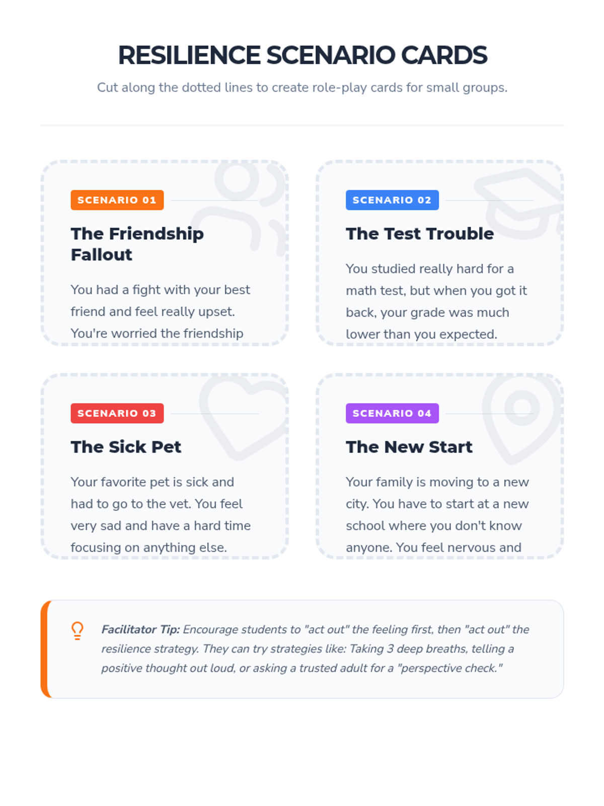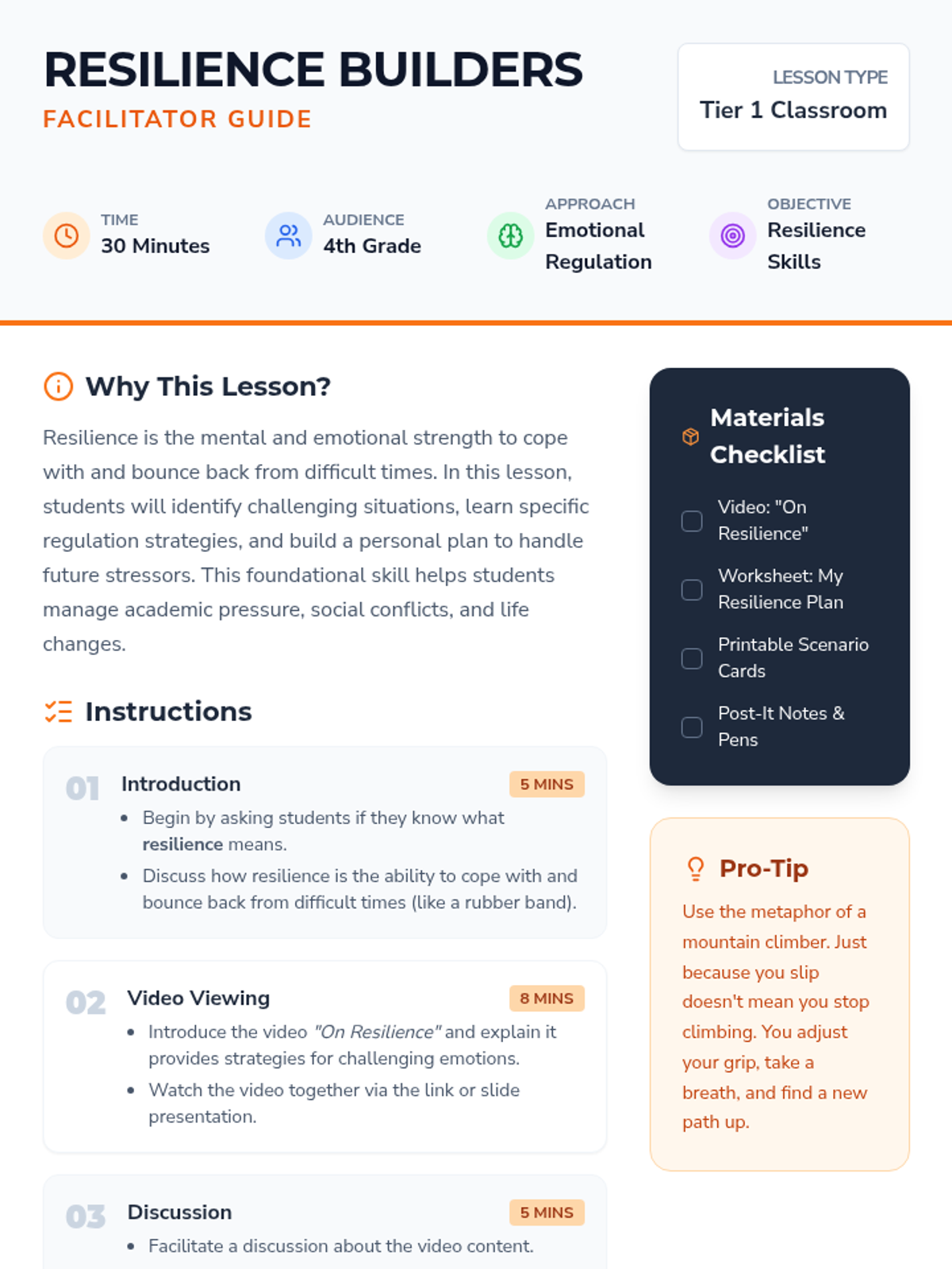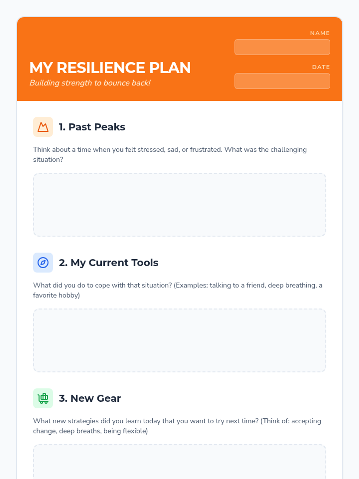 Students will learn about resilience and how to handle challenging emotions through video discussion, role-playing, and deep breathing exercises. They will create a personal resilience plan to help them bounce back from future challenges.