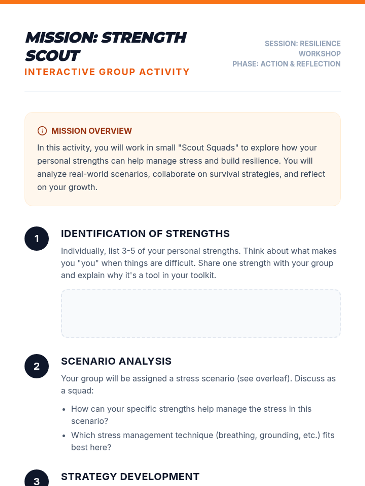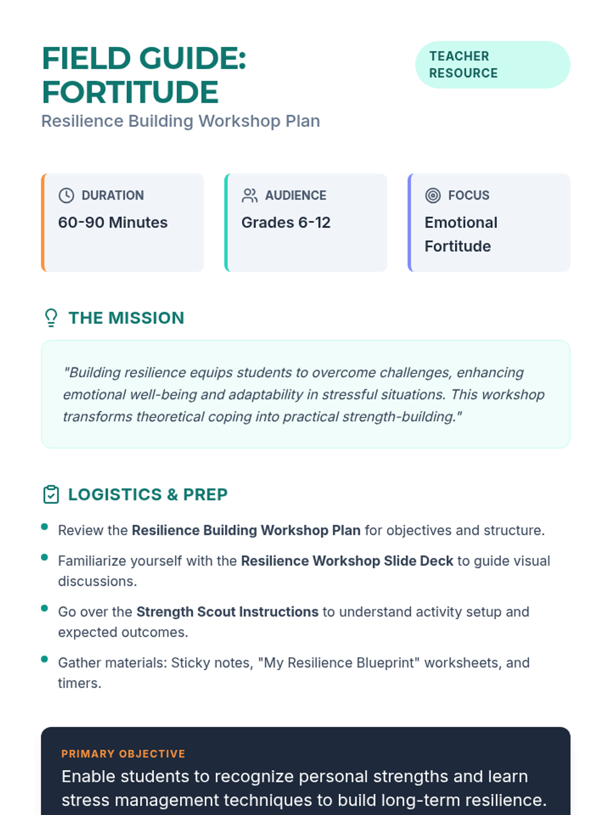 A comprehensive workshop for grades 6-12 focused on identifying personal strengths and mastering stress management techniques to build emotional resilience.