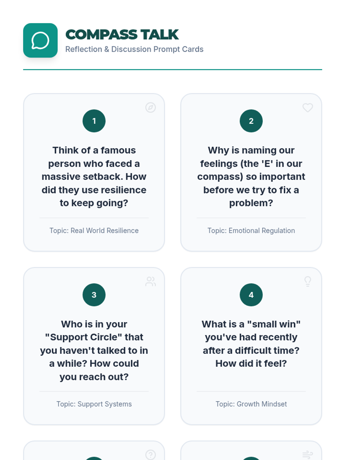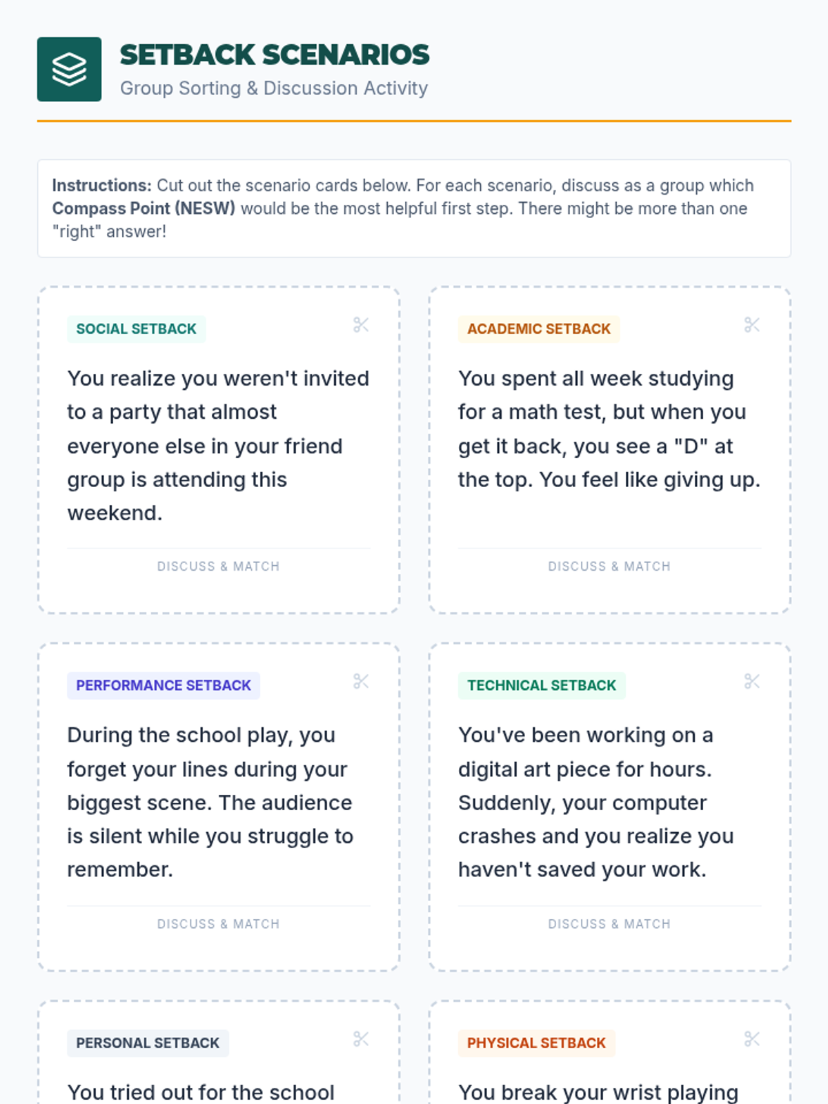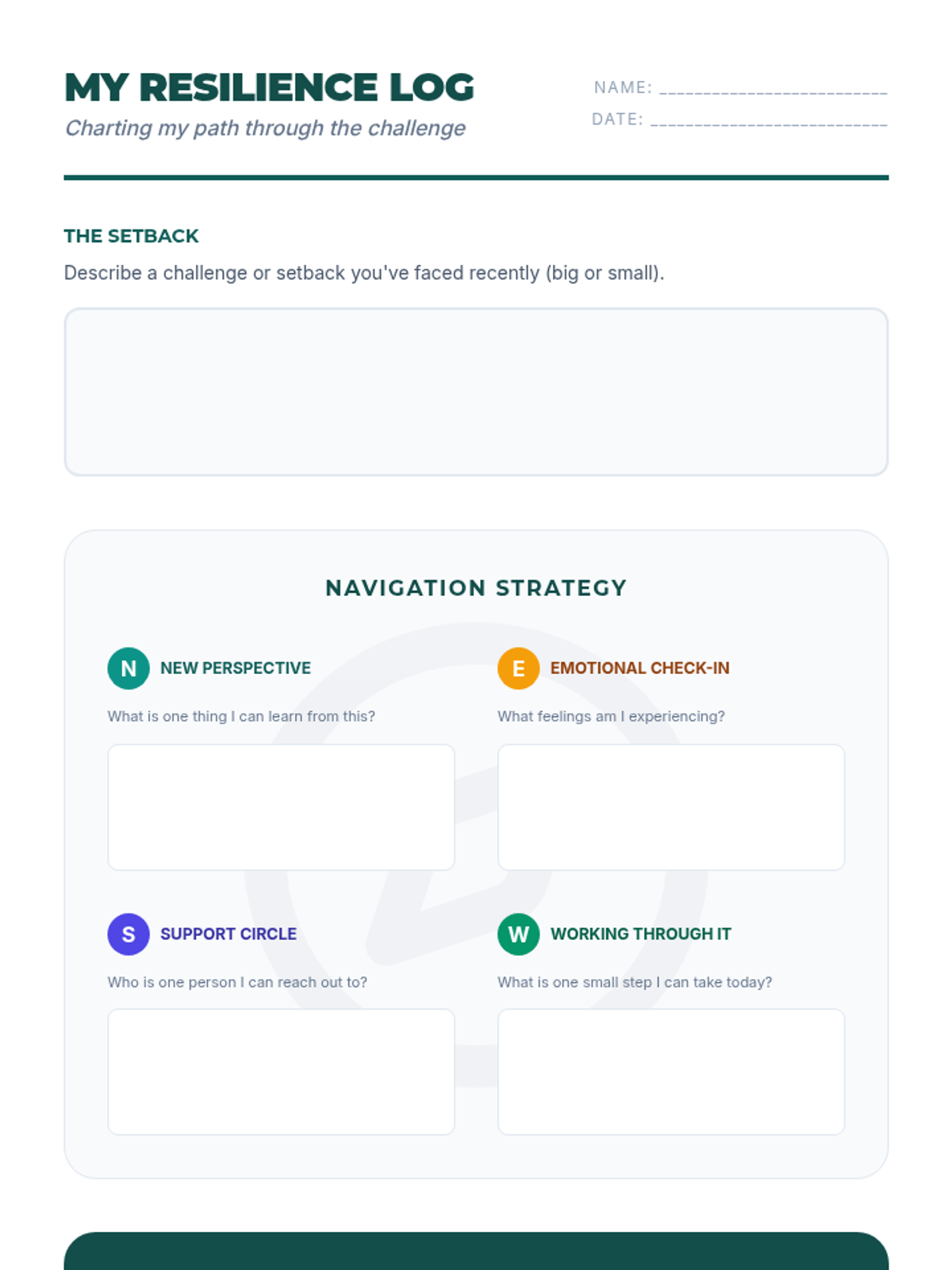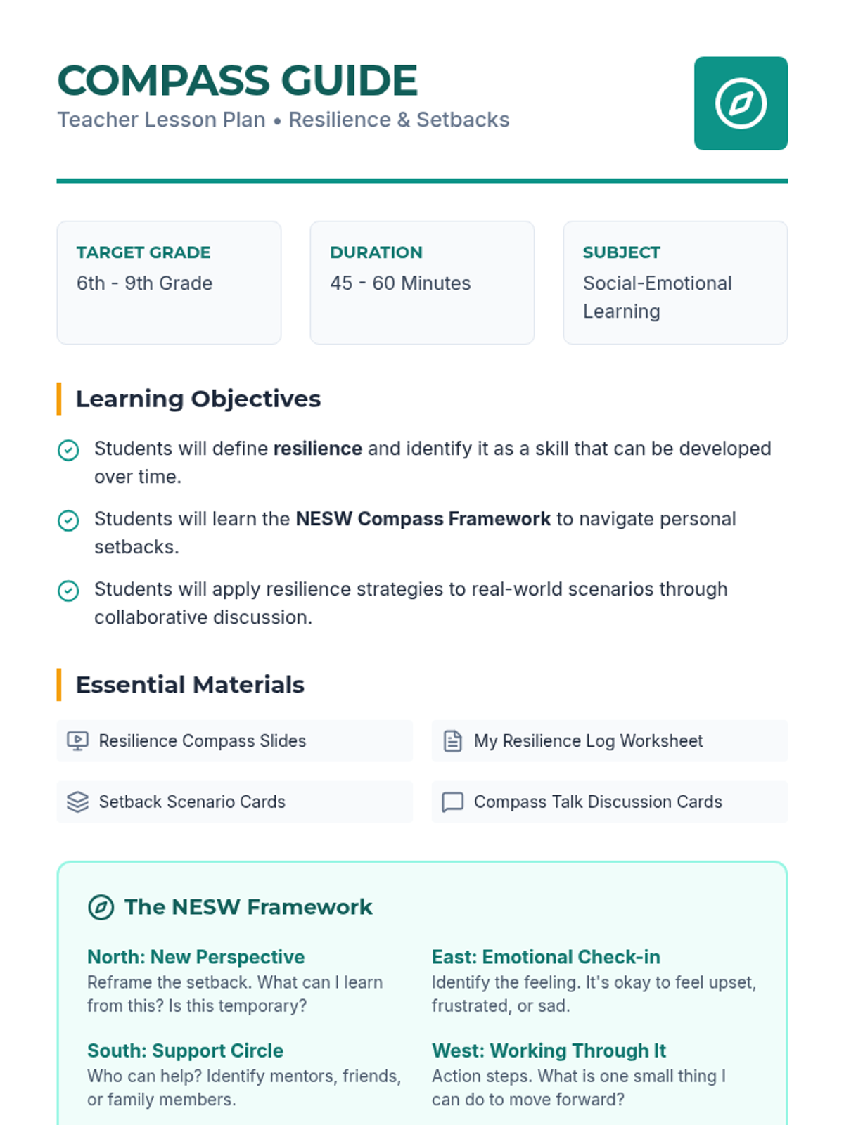 A comprehensive lesson designed to help students build a 'resilience compass' for navigating life's setbacks. Through the NESW framework (New Perspective, Emotional Check-in, Support Circle, Working Through It), students develop practical strategies for emotional fortitude and growth.
