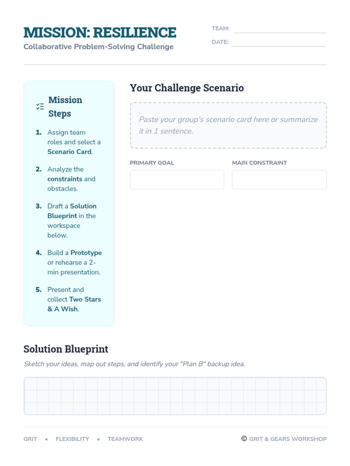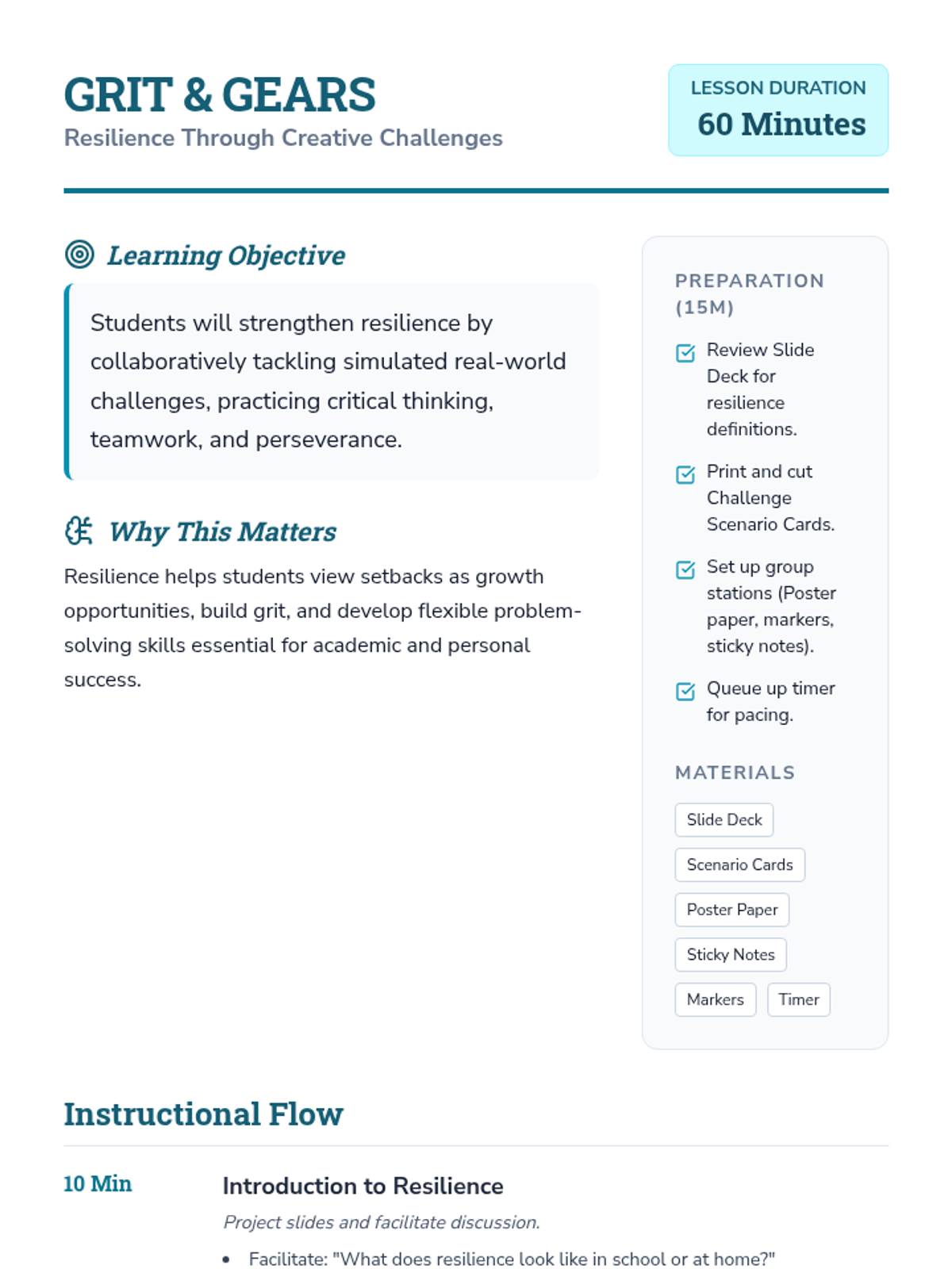 A 60-minute session for middle schoolers to build resilience through collaborative problem-solving and simulated real-world scenarios. Students practice flexibility, grit, and constructive feedback while tackling creative challenges.