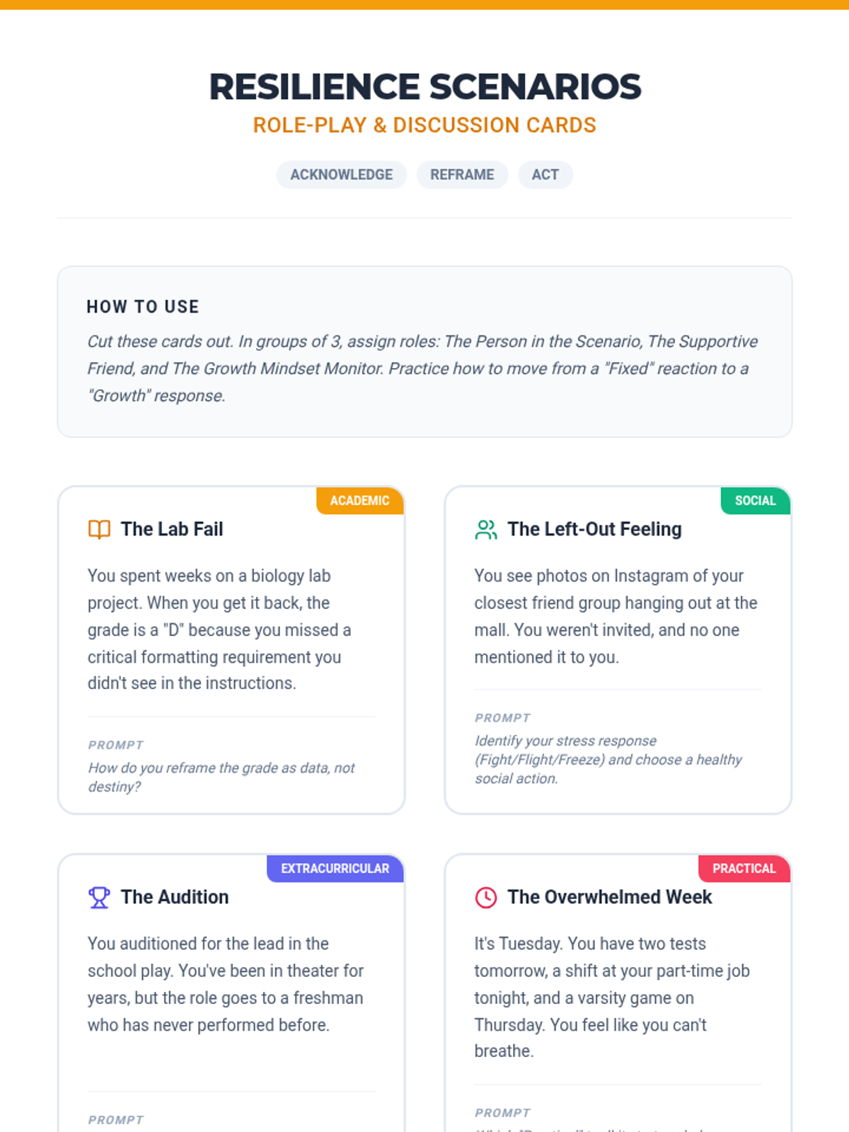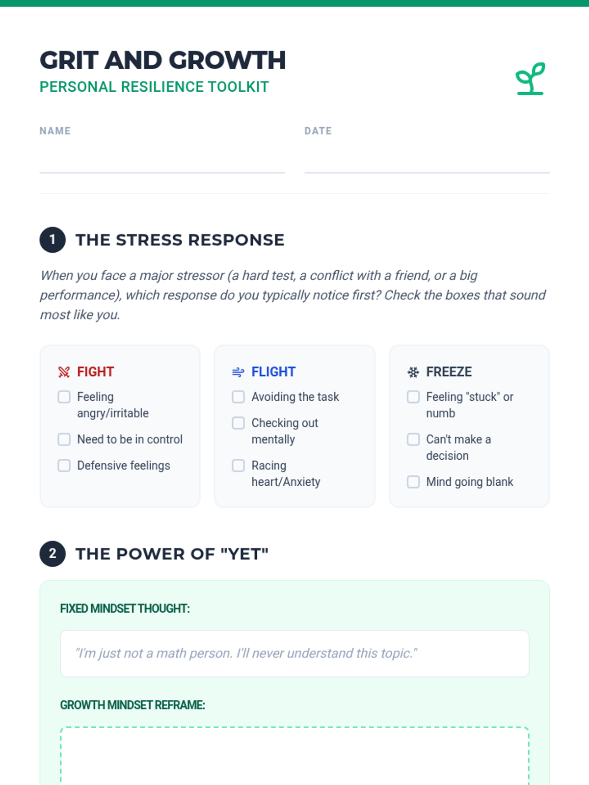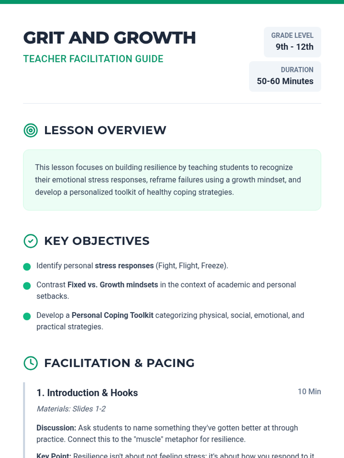 A comprehensive lesson for high schoolers to develop emotional resilience, identify healthy coping strategies, and practice bouncing back from setbacks using a 'growth through grit' framework.
