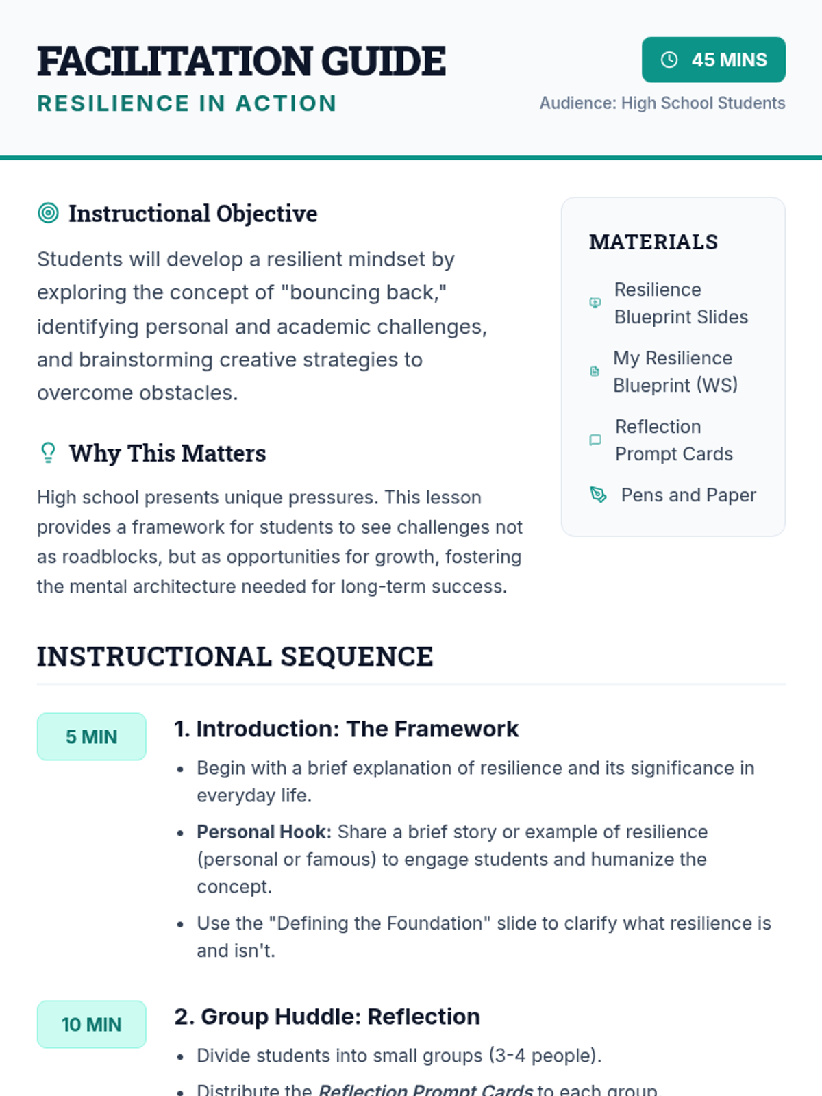 This lesson introduces high school students to the concept of resilience, helping them understand its importance and how to cultivate it. Through engaging discussions and activities, students will explore strategies to bounce back from challenges, fostering a resilient mindset that can support their personal and academic growth.