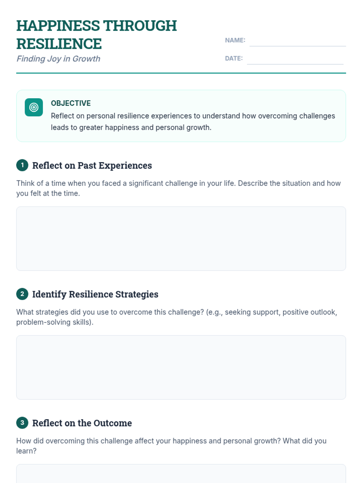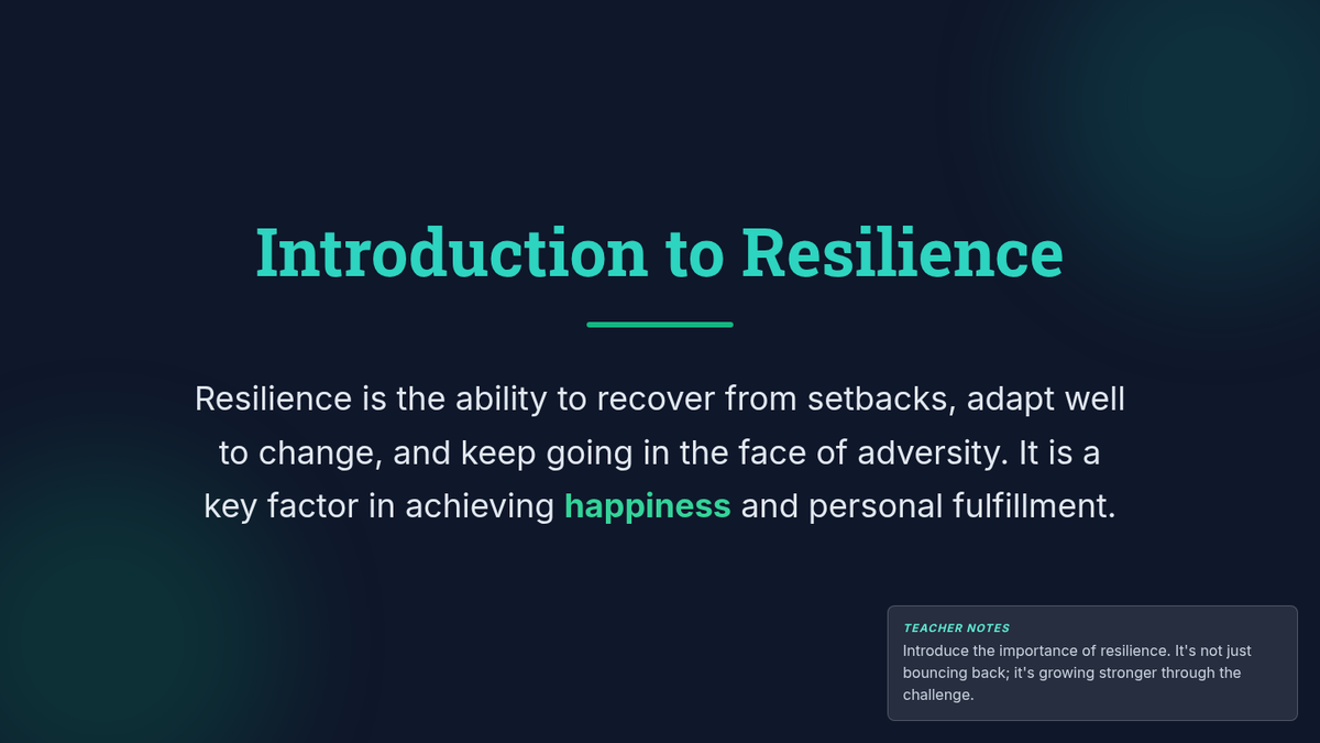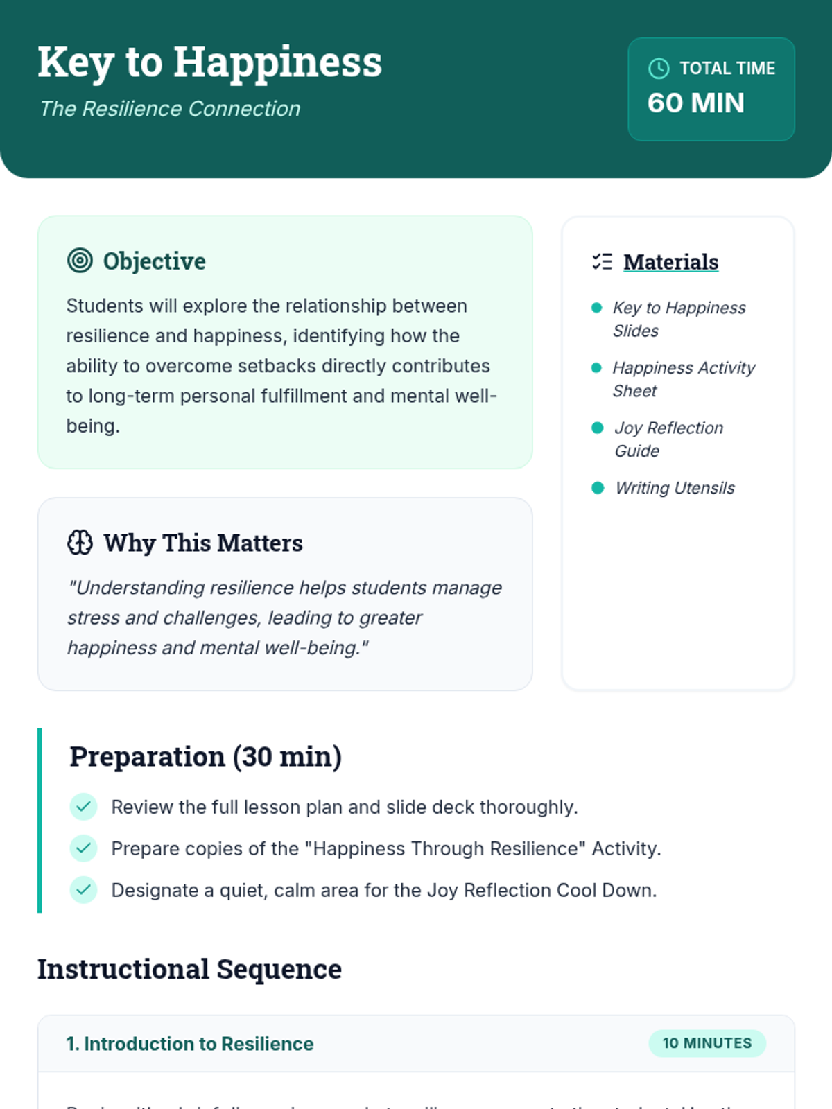 This individual-focused lesson explores the connection between resilience and happiness, helping 12th-grade students develop strategies to find joy and growth in the face of life's challenges.
