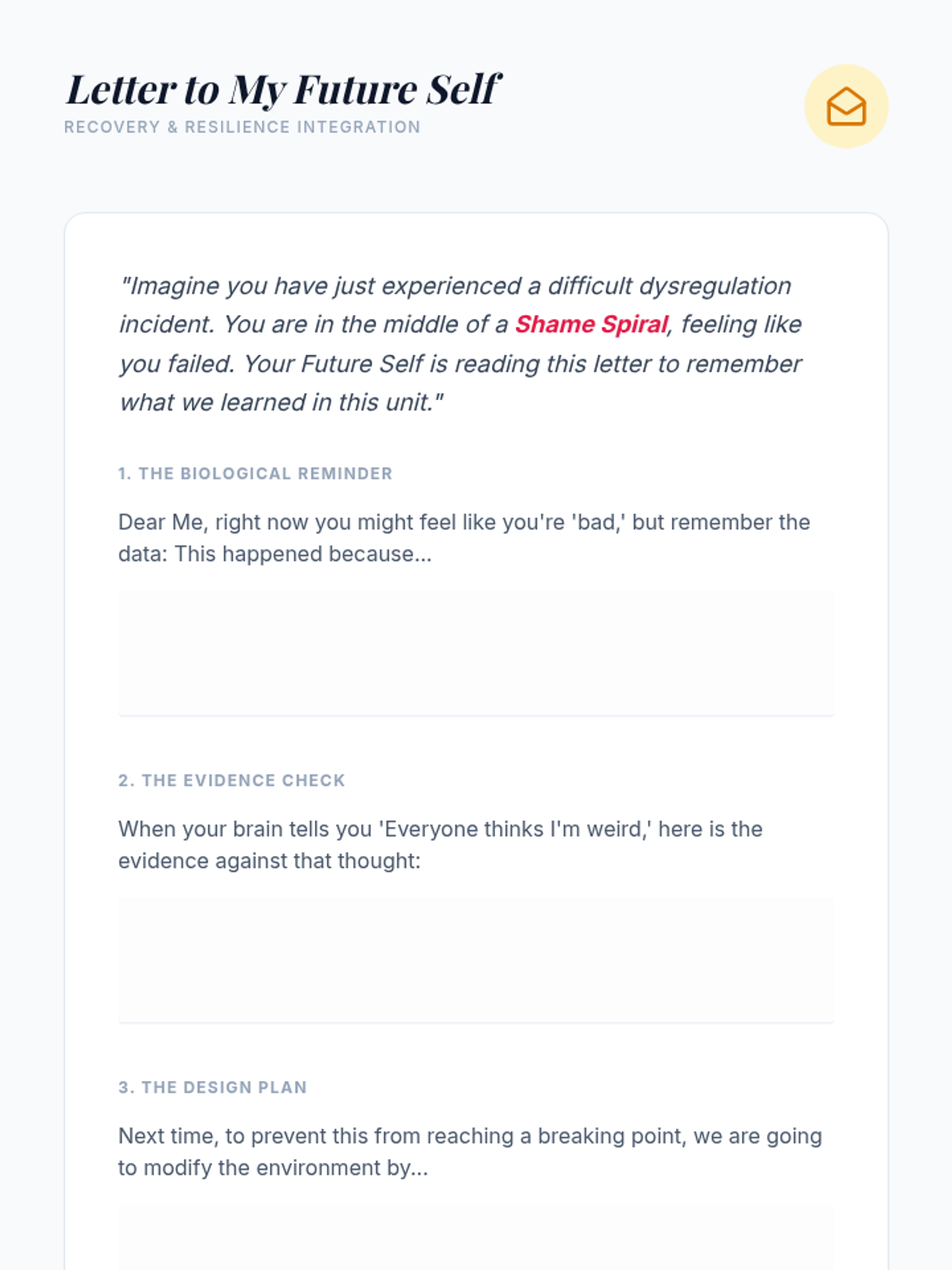 The final lesson frames neurodivergence as a manageable trait, focusing on self-efficacy and a growth mindset regarding the regulation journey.