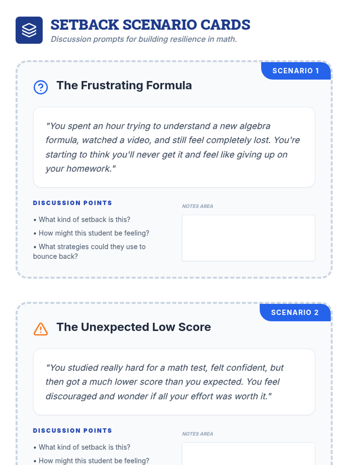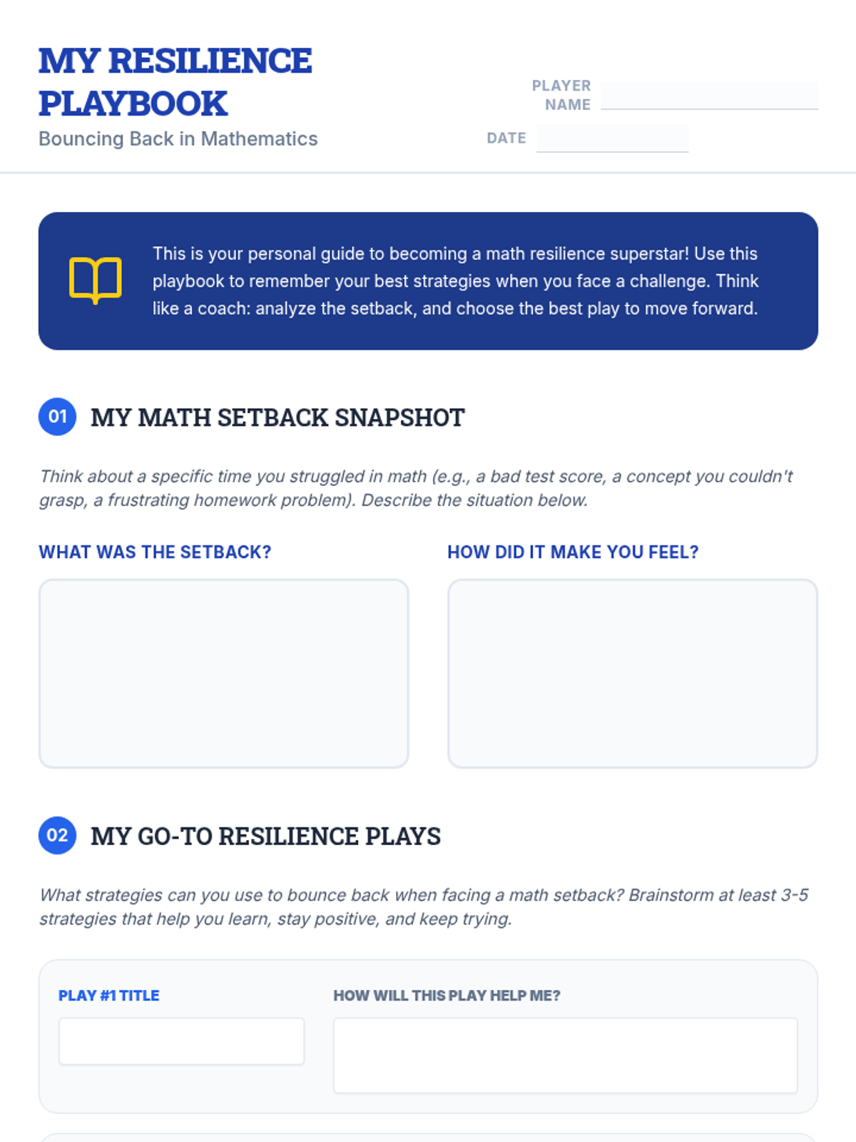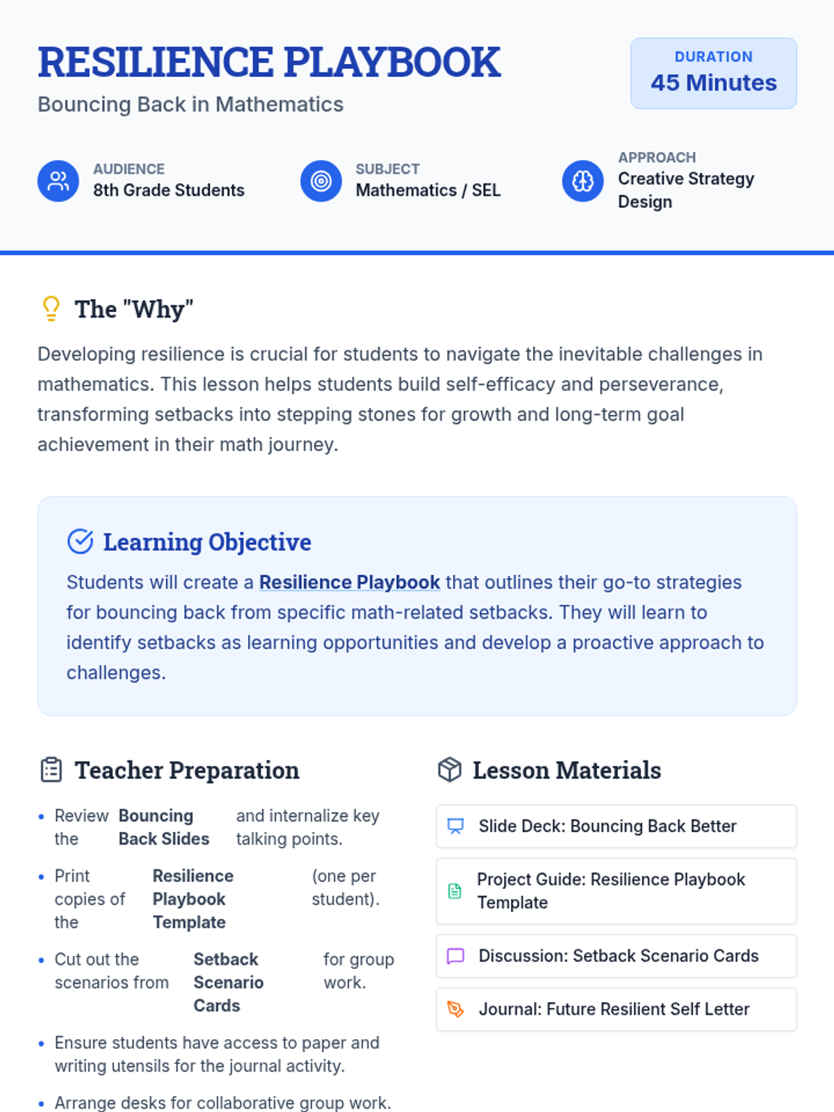 An empowering 45-minute lesson for 8th graders to build resilience in mathematics through the creation of a personalized strategy 'playbook'. Students learn to reframe setbacks as learning opportunities and commit to proactive growth strategies.