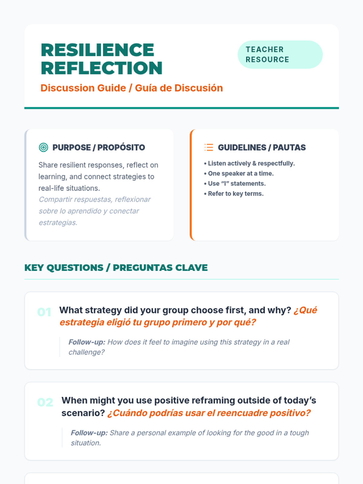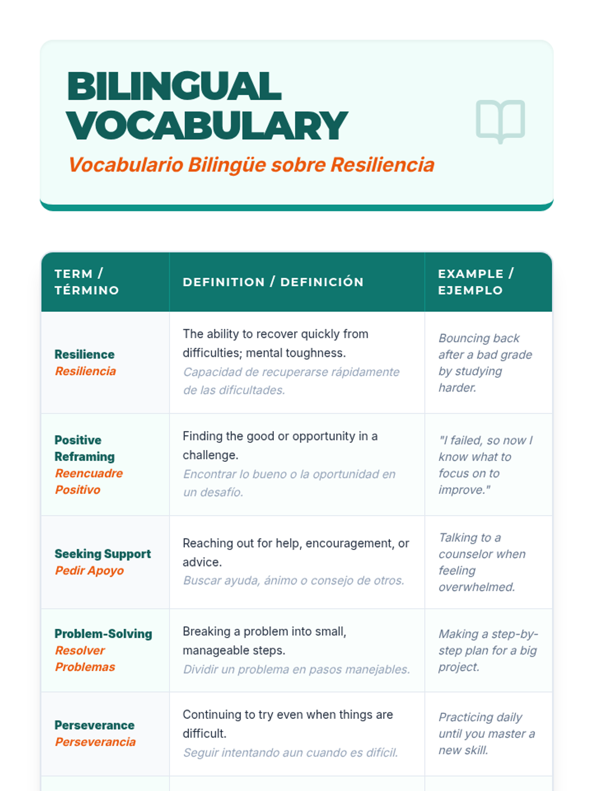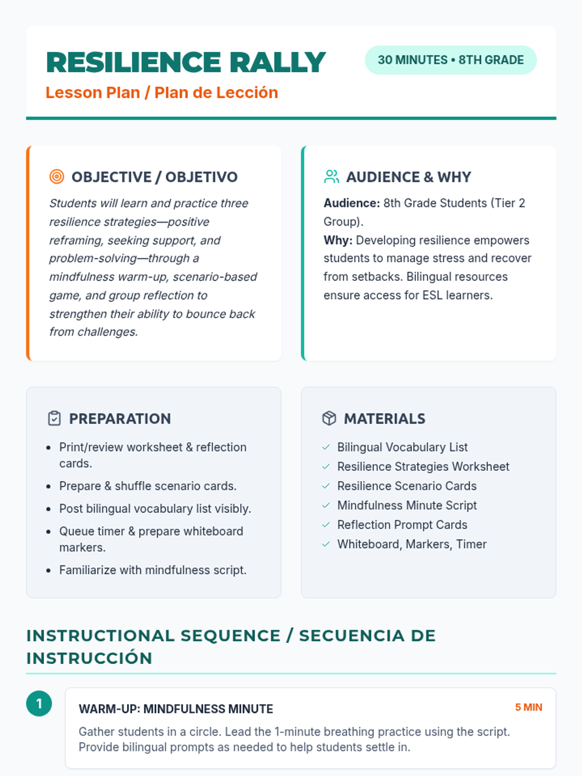 A 30-minute Tier 2 lesson for 8th graders focused on practical resilience strategies: positive reframing, seeking support, and problem-solving, with bilingual English/Spanish supports.