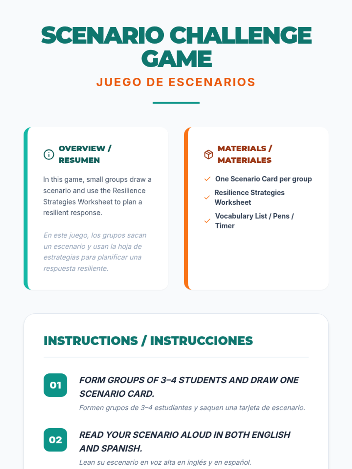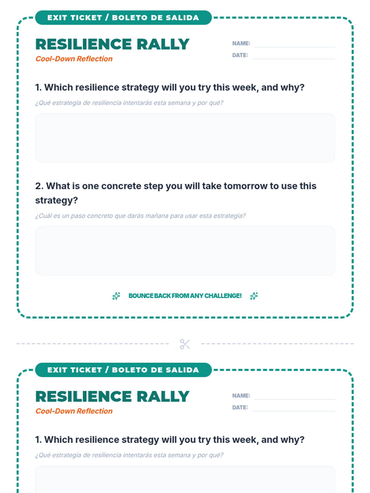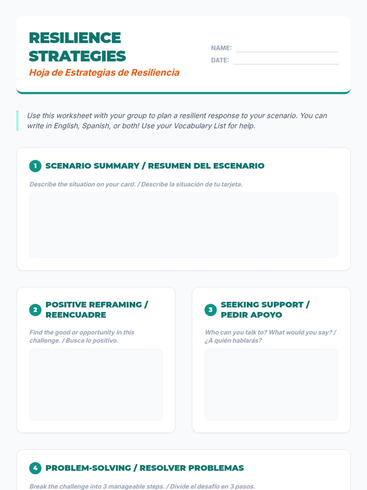 A 30-minute Tier 2 lesson for 8th graders focused on practical resilience strategies: positive reframing, seeking support, and problem-solving, with bilingual English/Spanish supports.