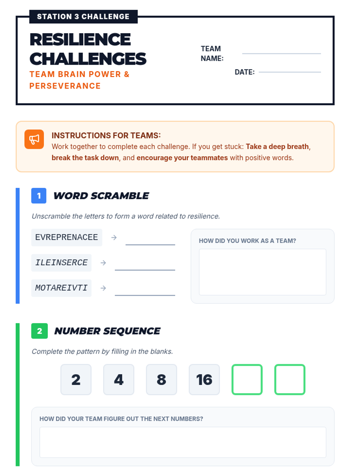 Practical team-based synergy challenges to apply collaborative problem-solving skills.