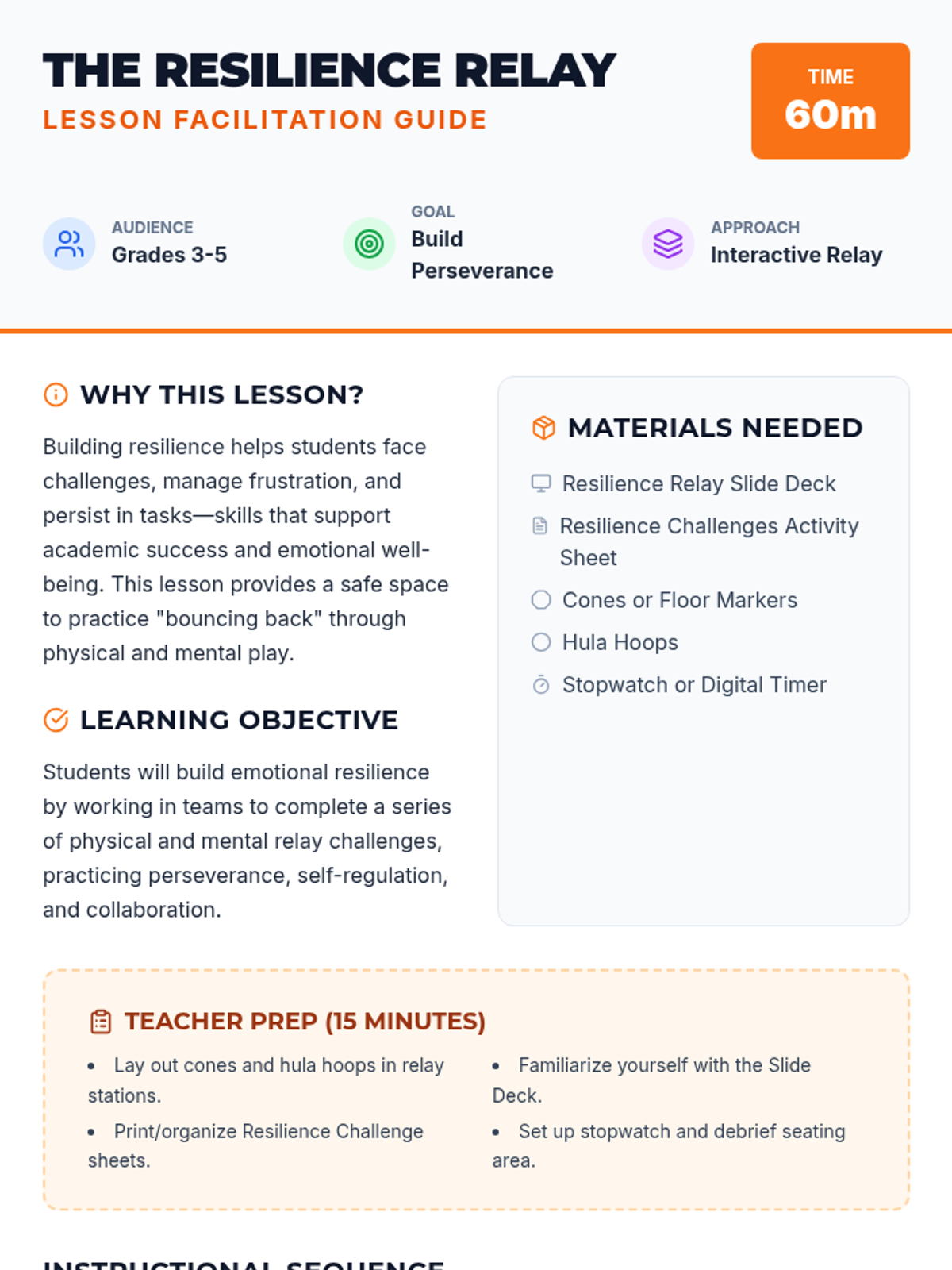 Students build resilience, perseverance, and self-regulation through a series of physical and mental relay challenges. This interactive lesson combines movement with reflection to help grades 3-5 students manage frustration and work collaboratively.