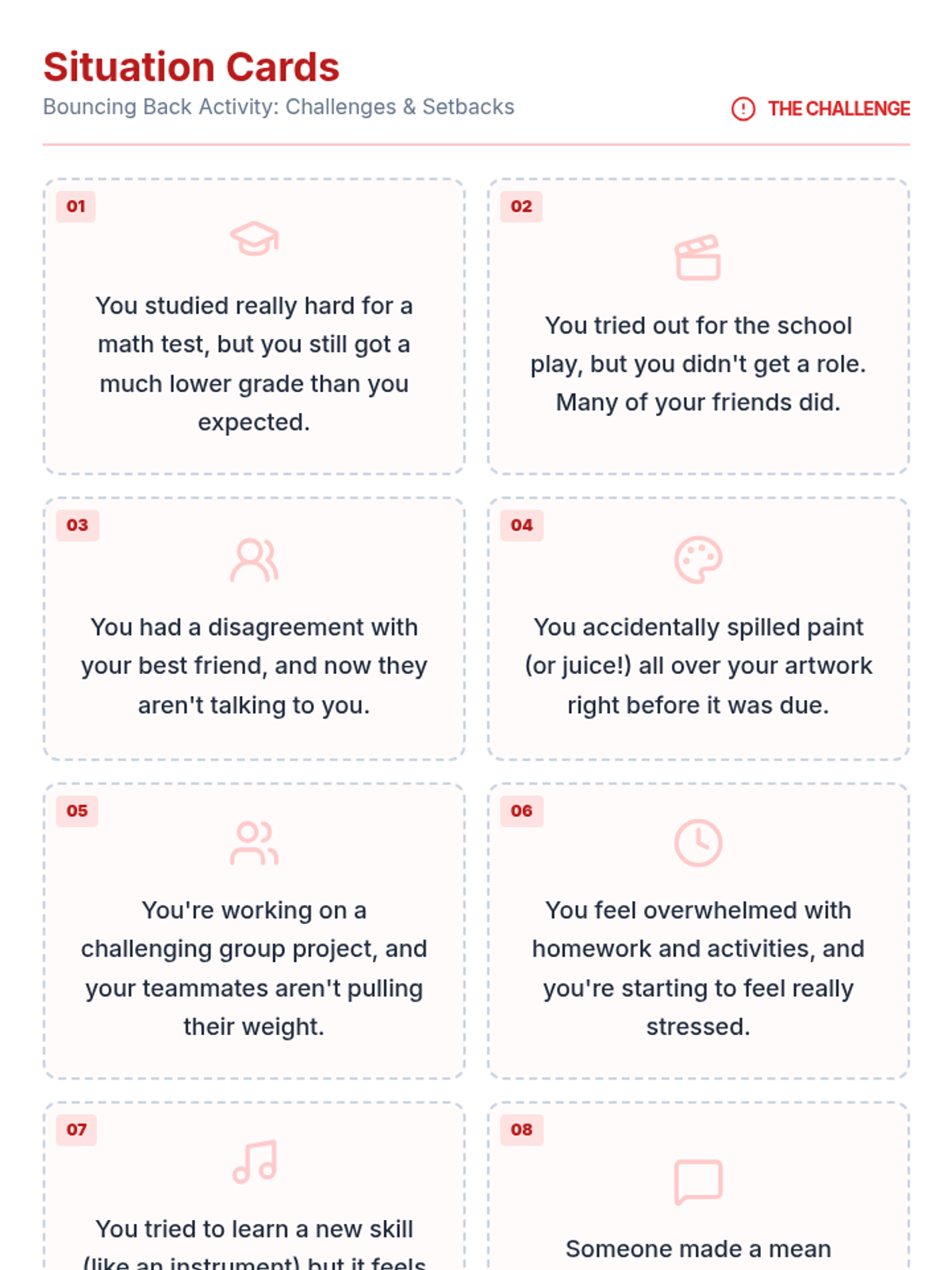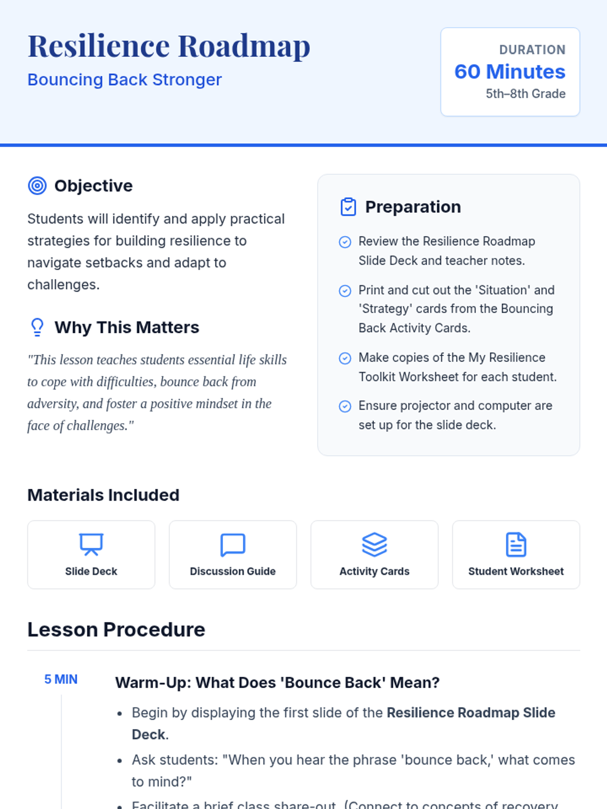 This engaging 60-minute lesson equips 5th-8th grade students with practical strategies for navigating setbacks and developing personal resilience through real-life scenarios and collaborative activities.