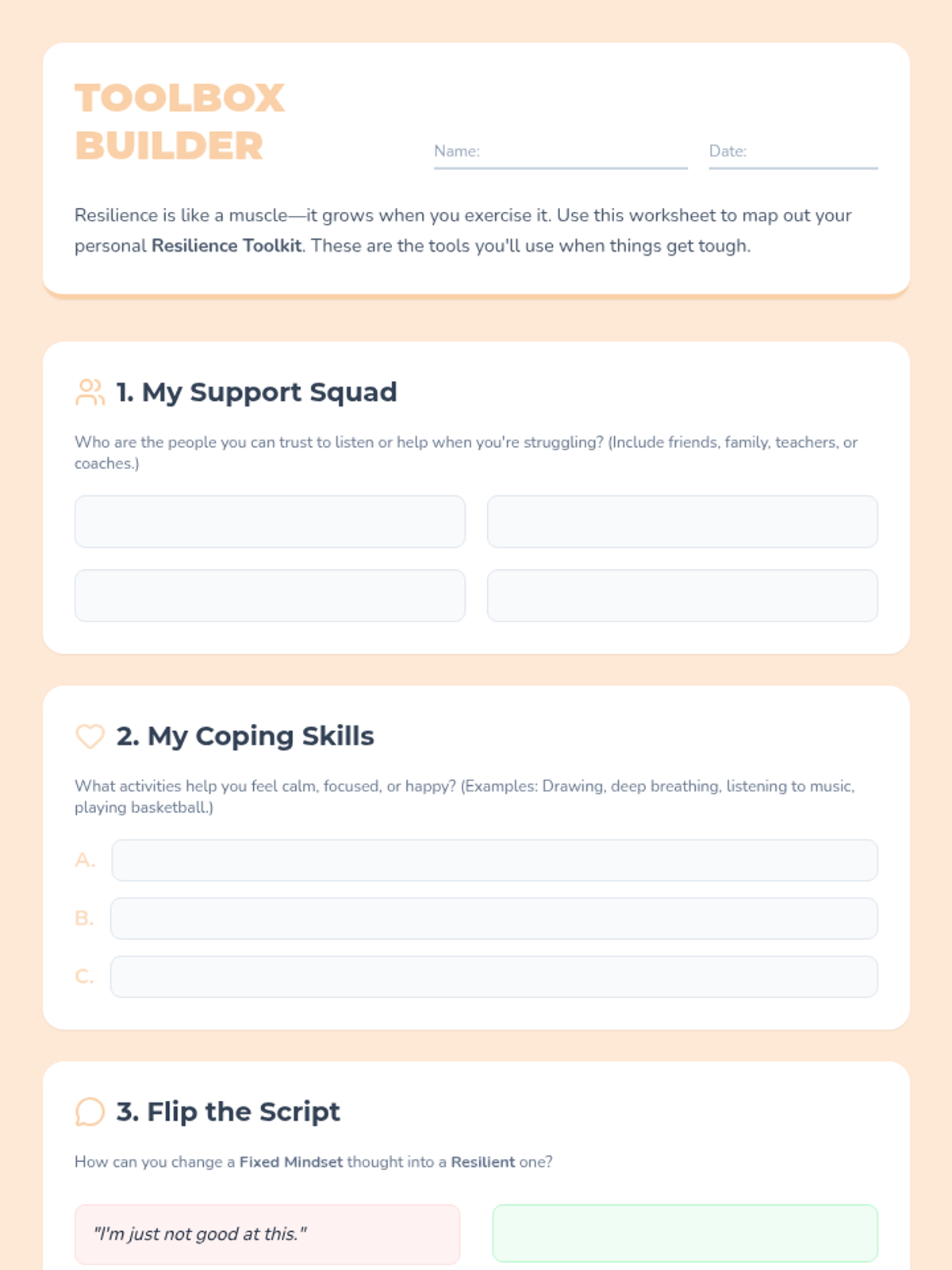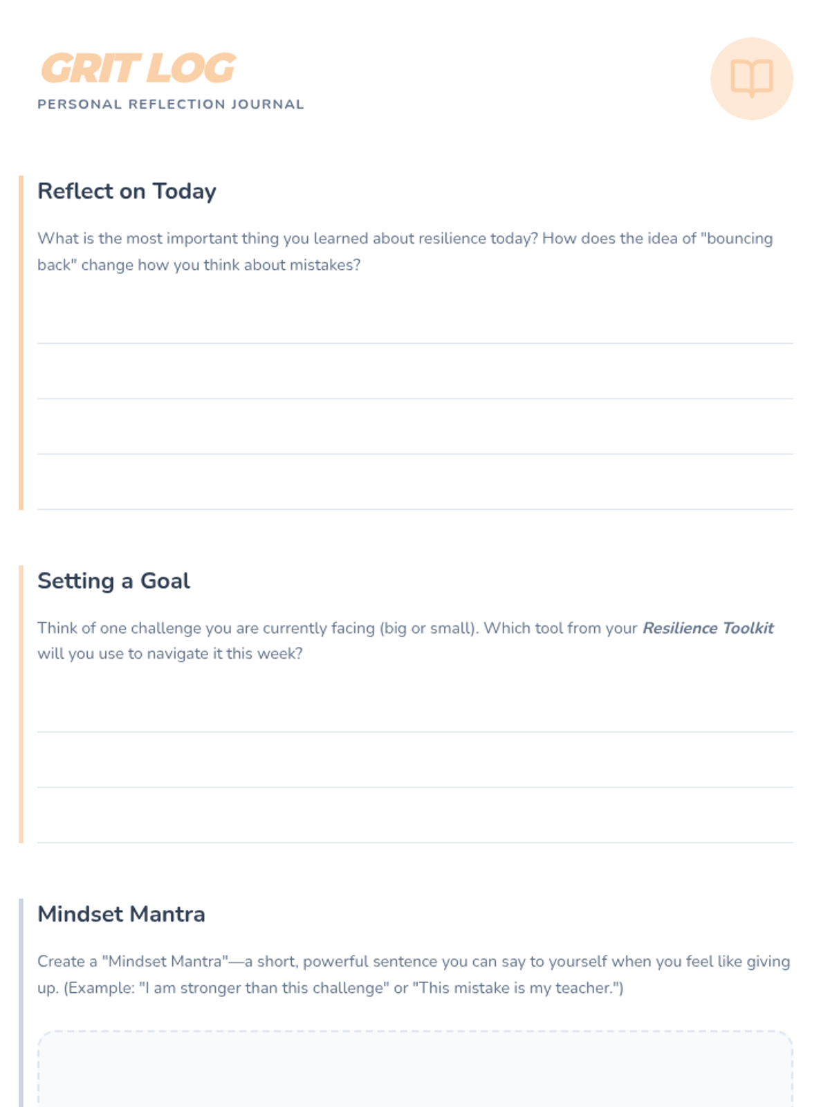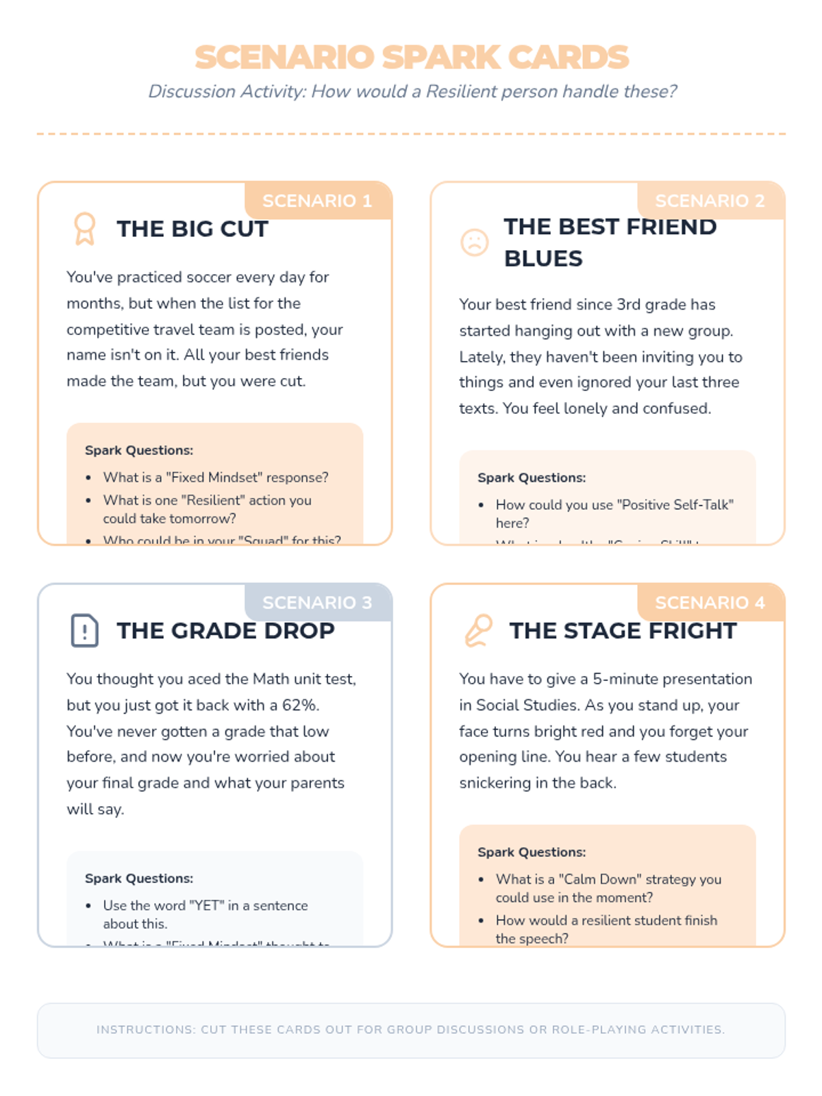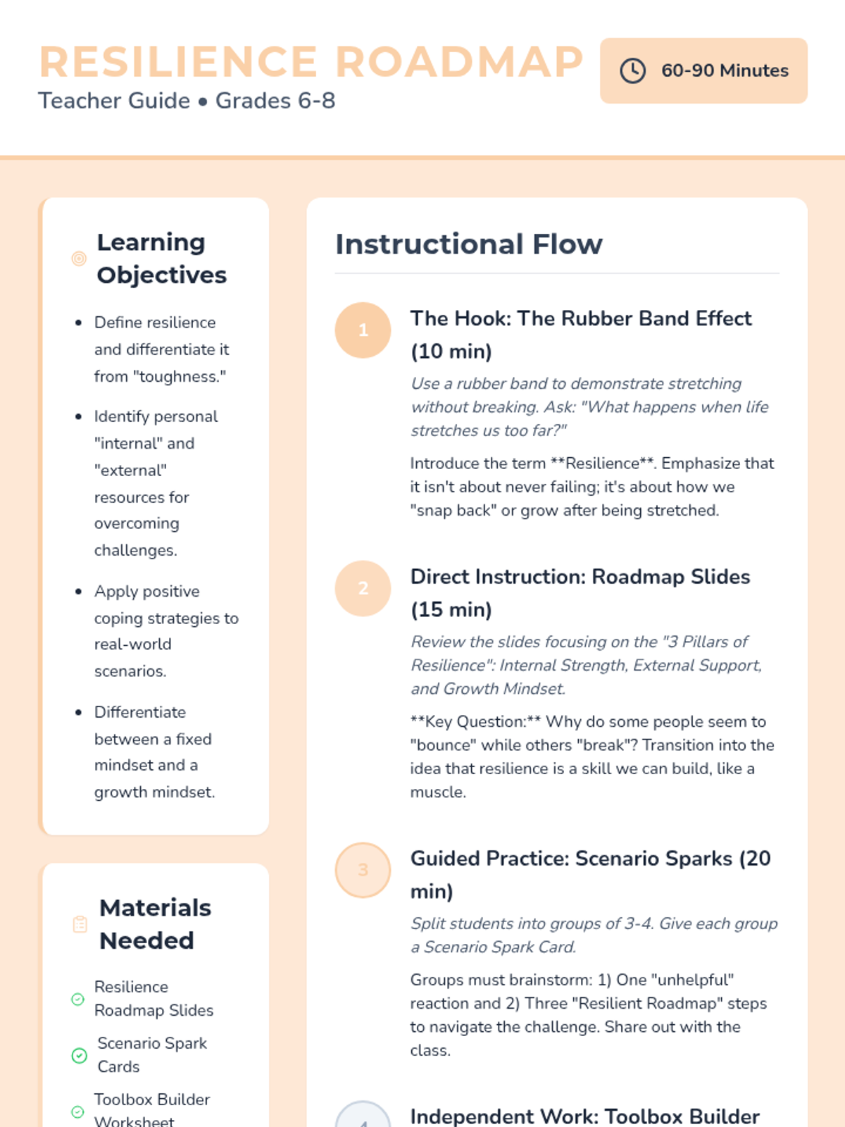 A comprehensive lesson for 6th-8th graders exploring resilience, growth mindset, and coping strategies through interactive scenarios and personal reflection.