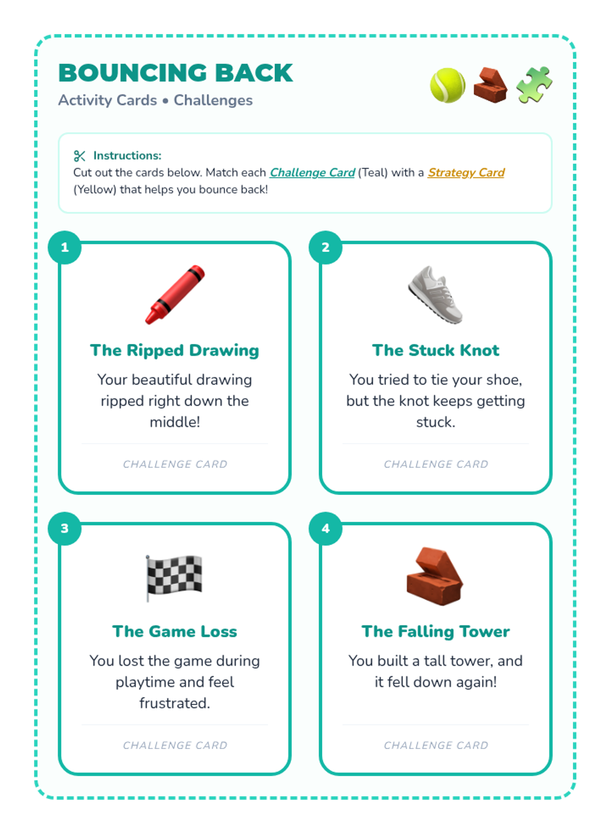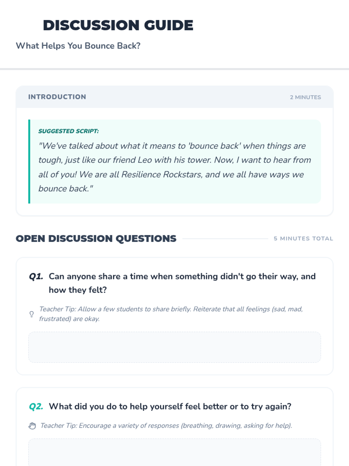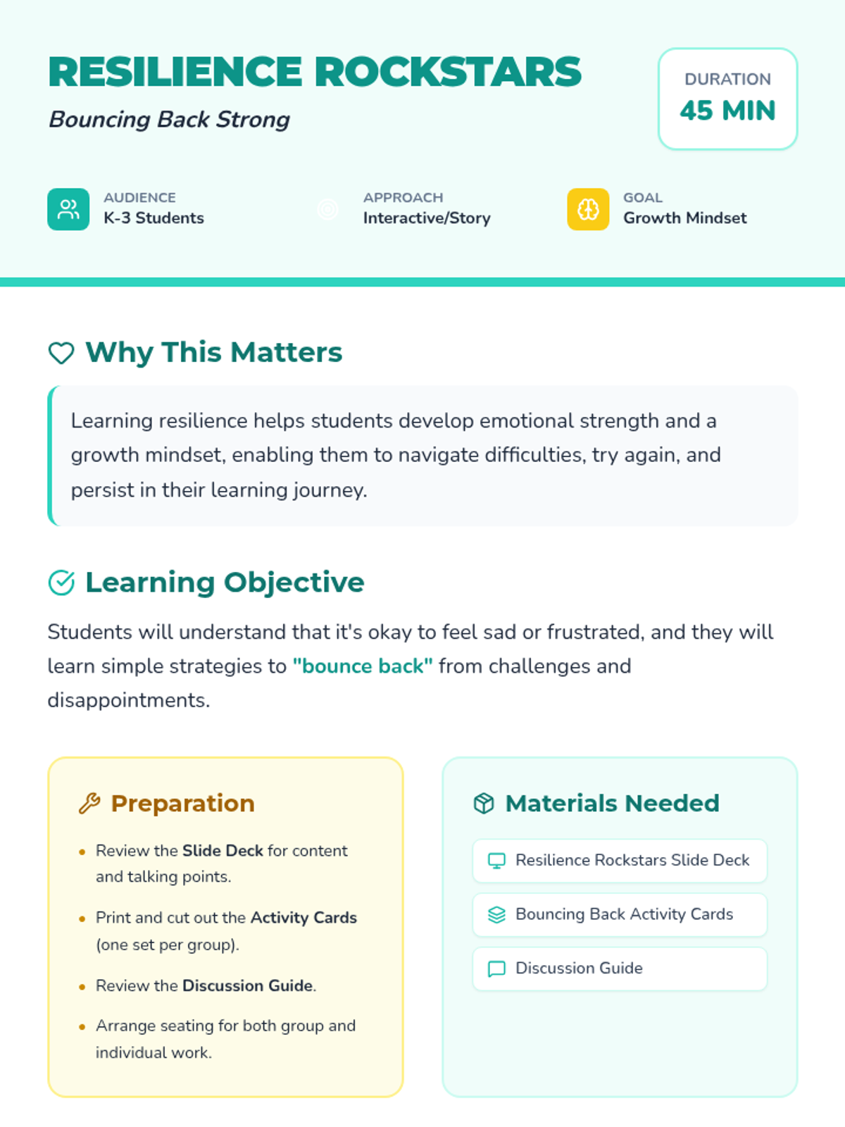 This resource helps K-3 students understand and practice resilience through engaging stories and interactive activities, teaching them simple strategies to 'bounce back' from challenges.