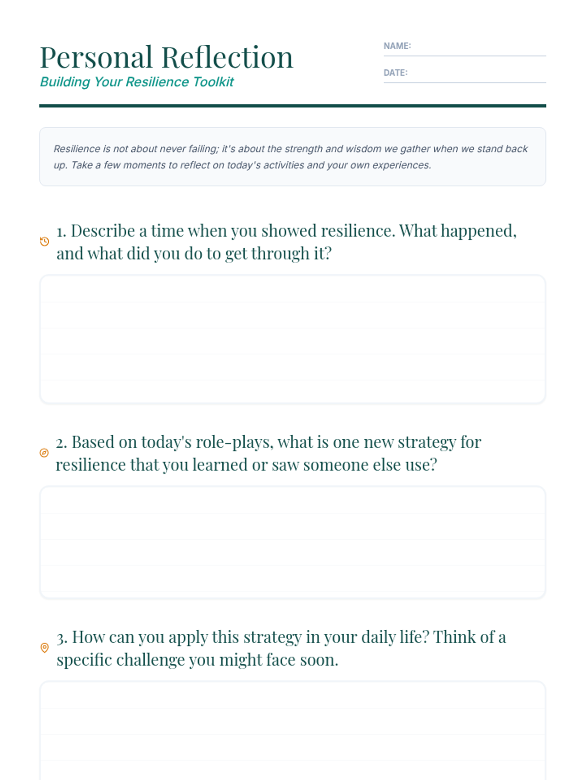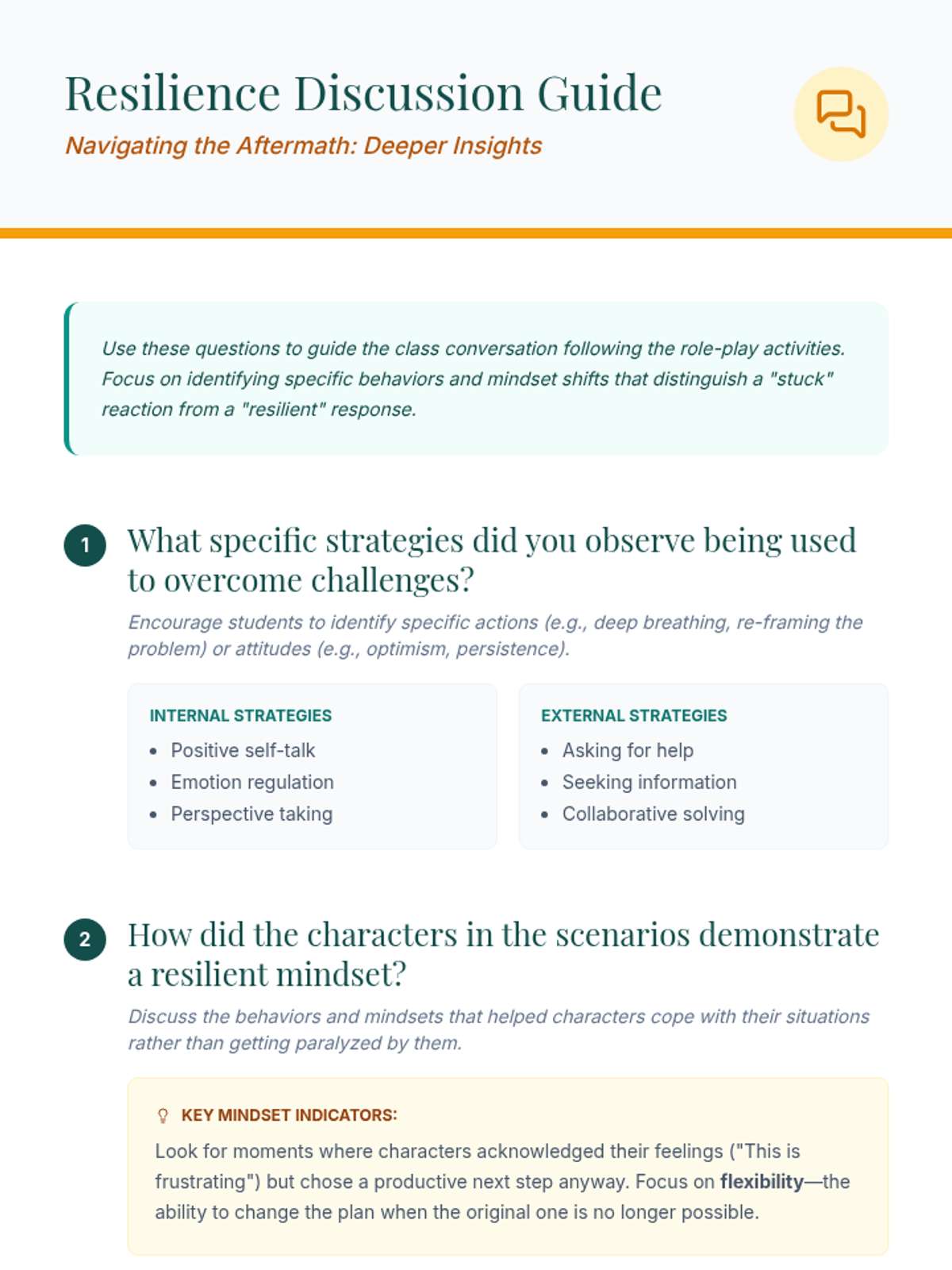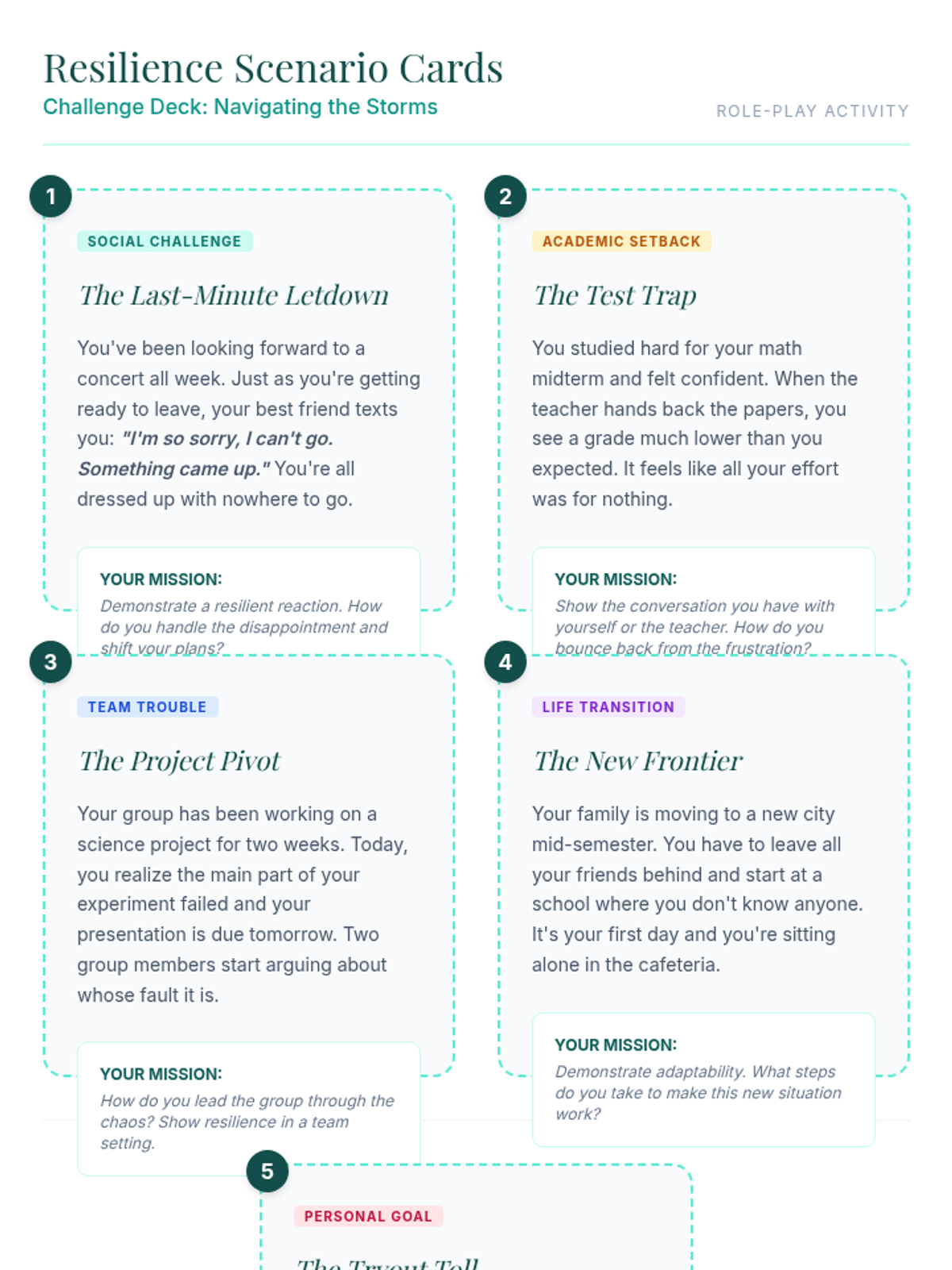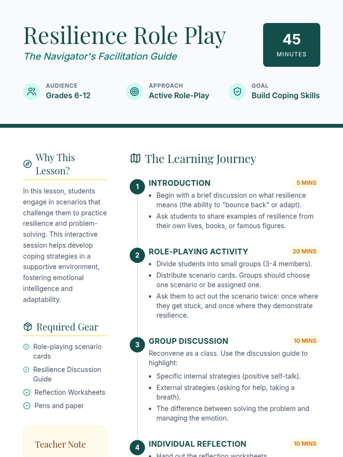 A lesson where students practice resilience through role-play scenarios, developing coping strategies and problem-solving skills in a supportive environment.