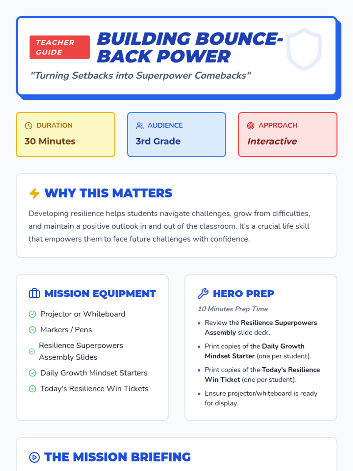 This 3rd-grade lesson uses a superhero-themed warm-up and cool-down structure to teach students the power of resilience, providing them with actionable 'superpowers' to bounce back from mistakes and challenges.