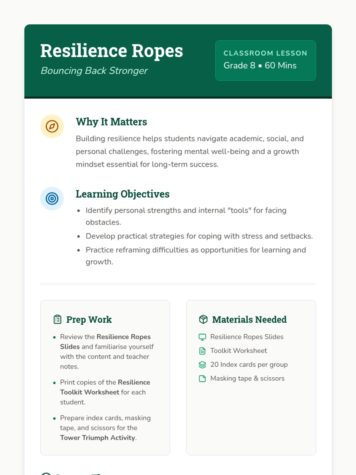 This lesson helps 8th-grade students identify their personal strengths and develop practical strategies for coping with challenges and setbacks. Students will learn to reframe difficulties as opportunities for growth and build their personal resilience toolkit.